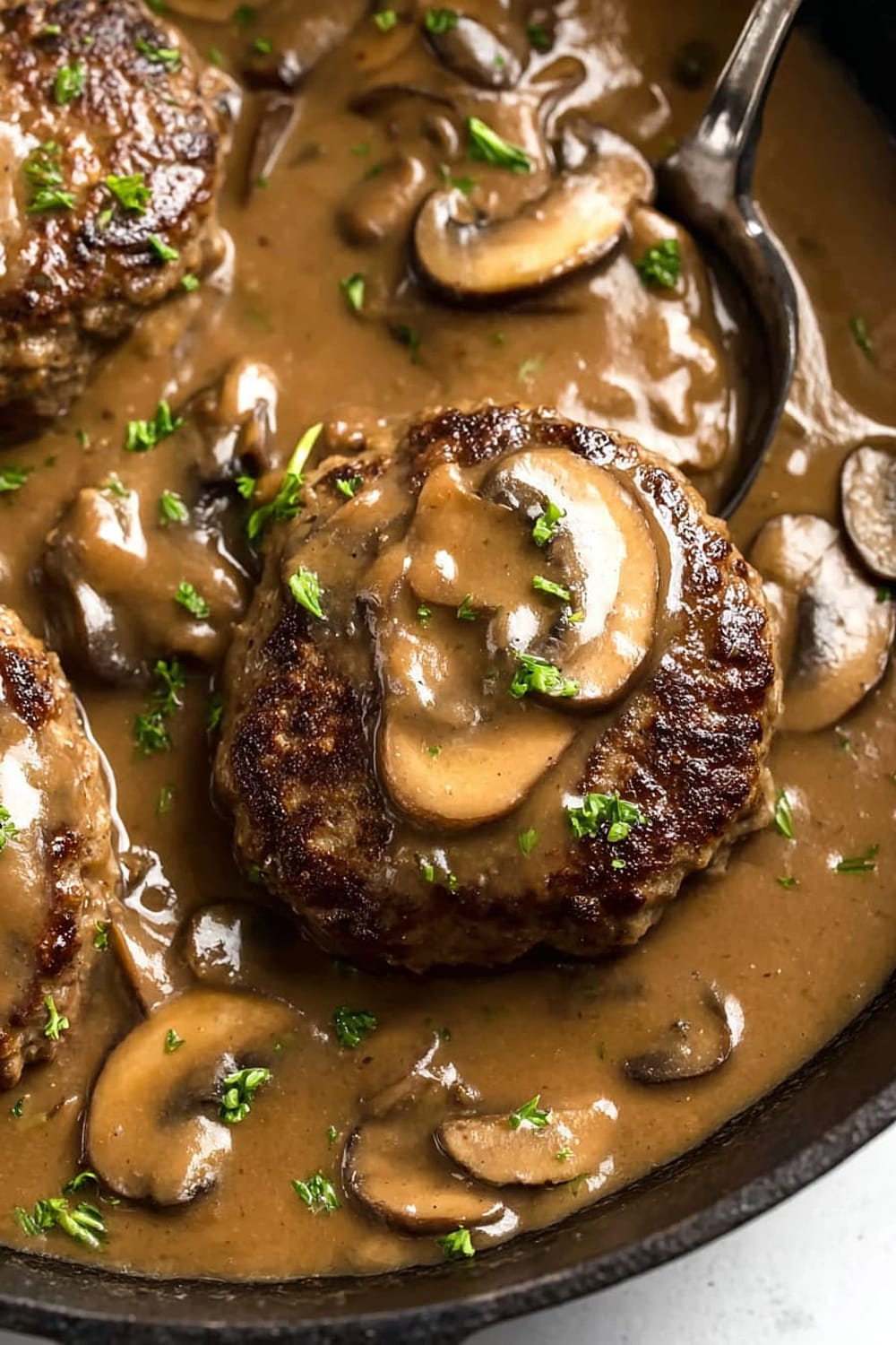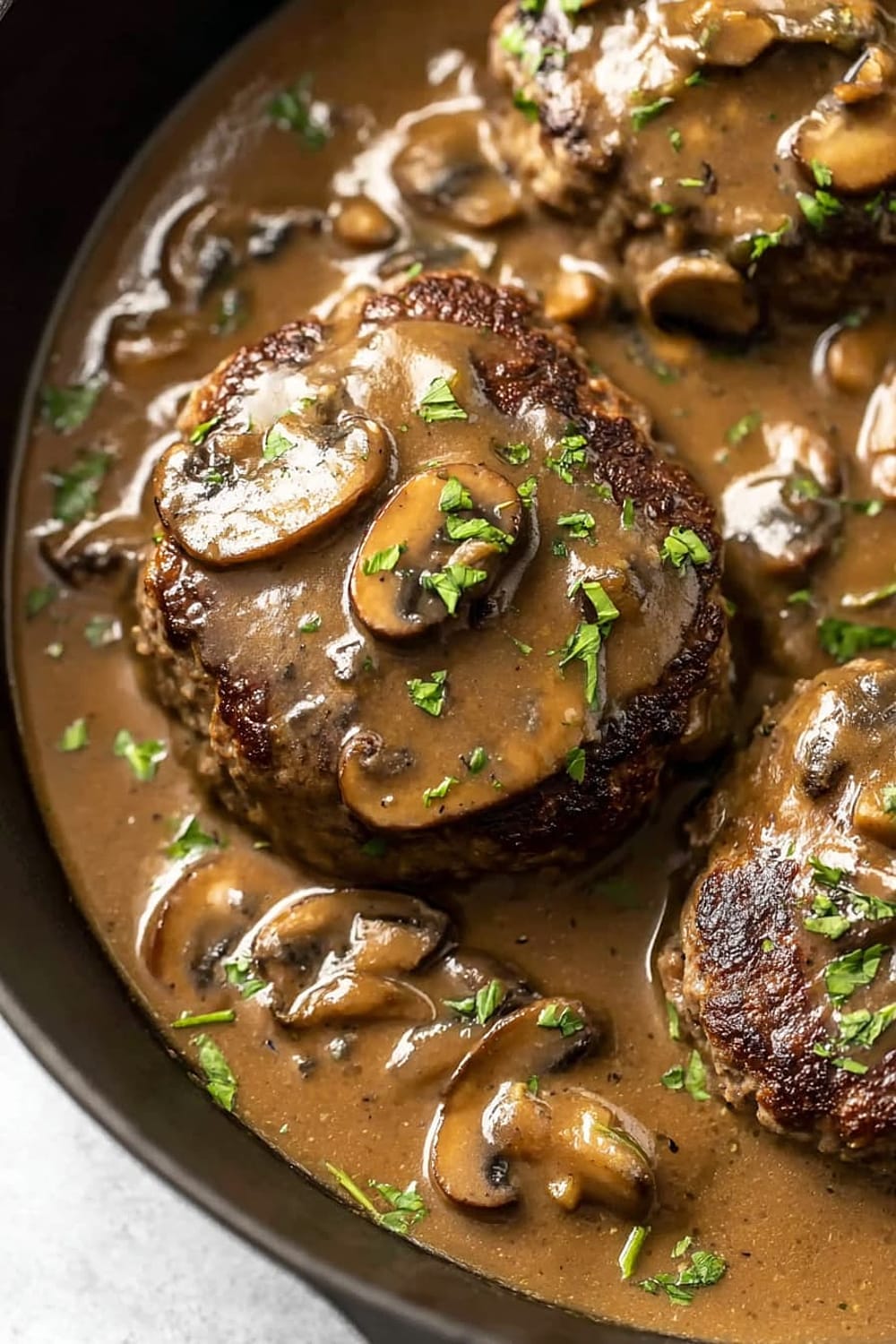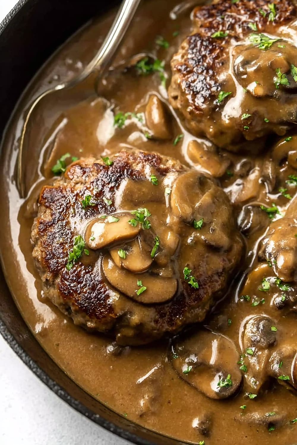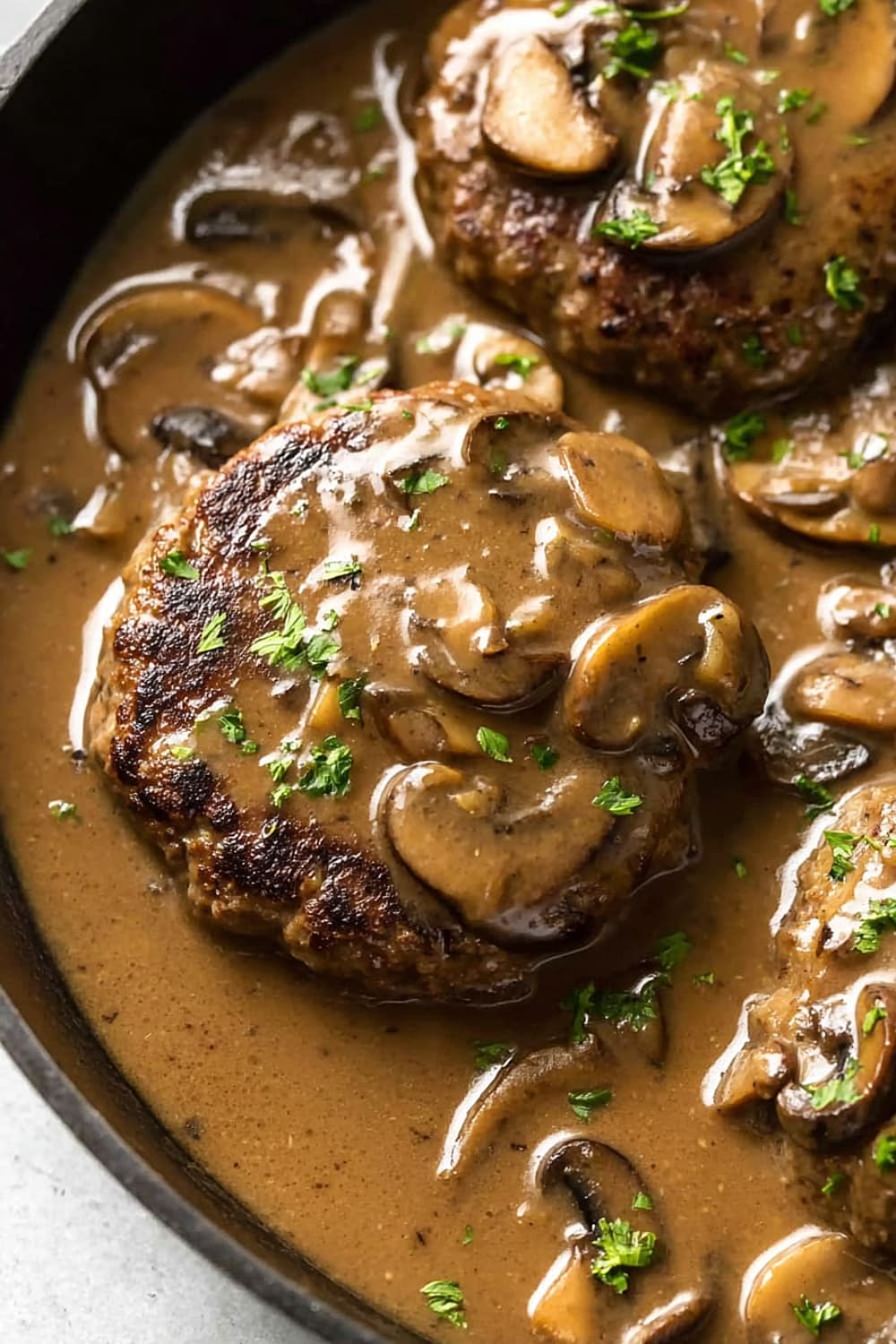 Picture tender, juicy beef patties swimming in the most ridiculously good mushroom gravy that’s basically liquid gold with chunks of earthy mushrooms throughout.