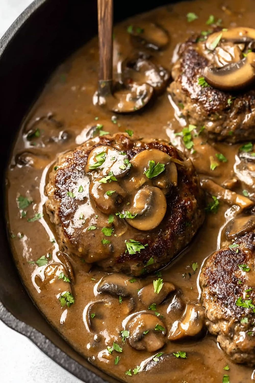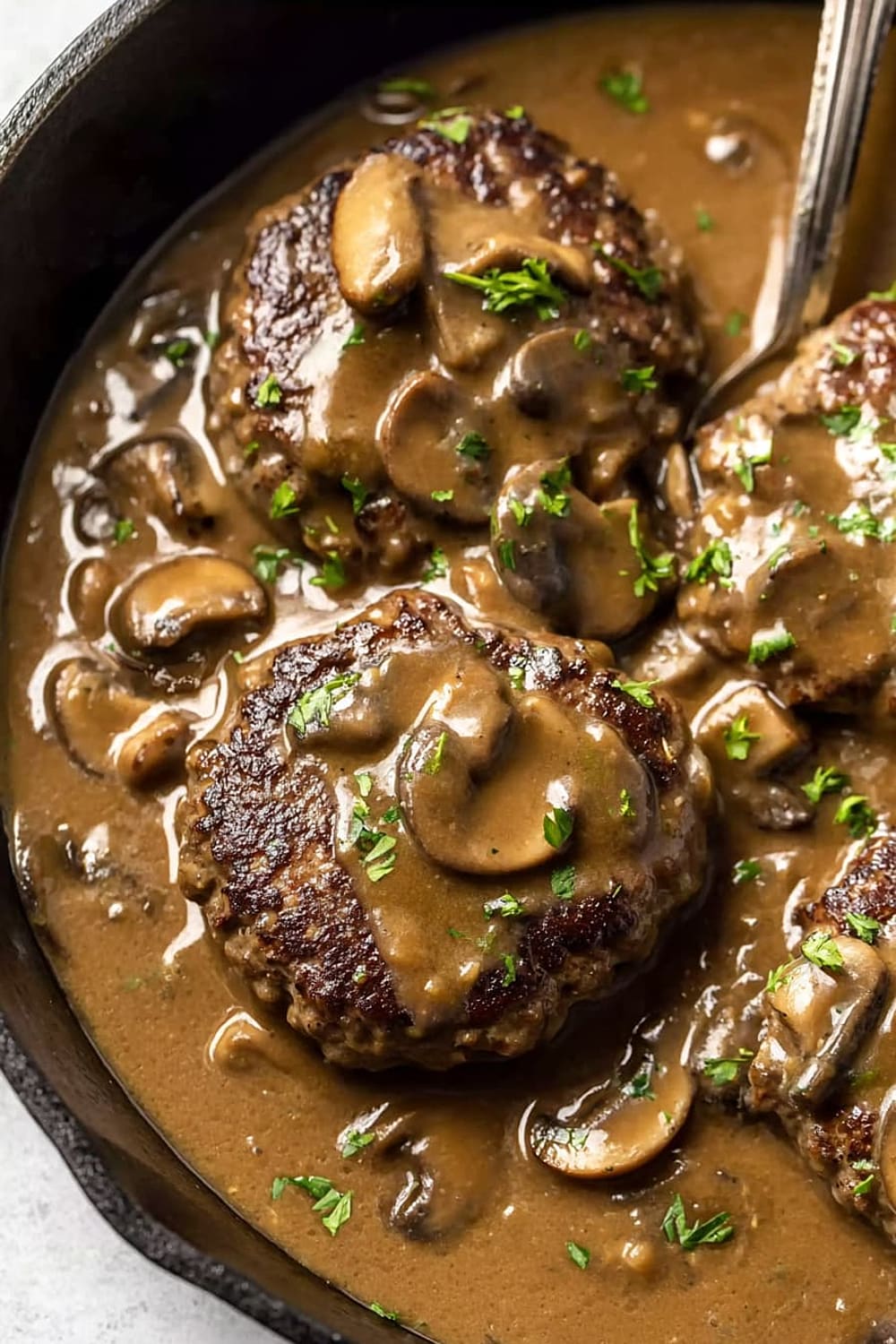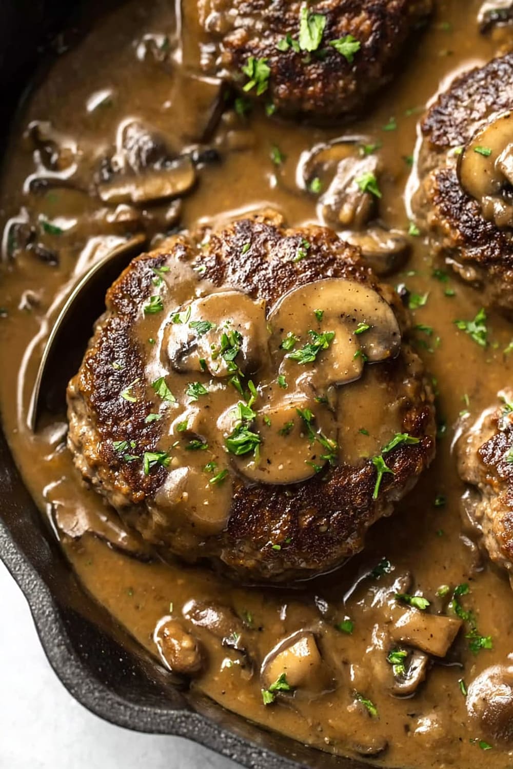Picture tender, juicy beef patties swimming in the most ridiculously good mushroom gravy that’s basically liquid gold with chunks of earthy mushrooms throughout.
