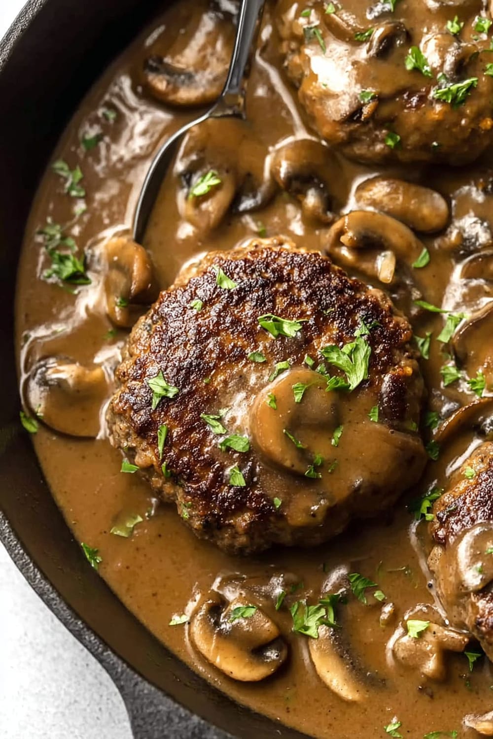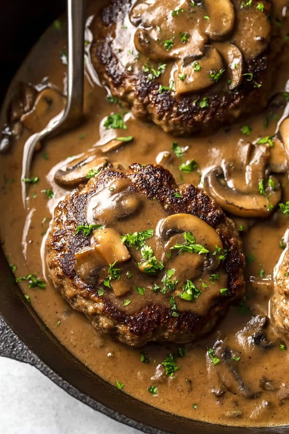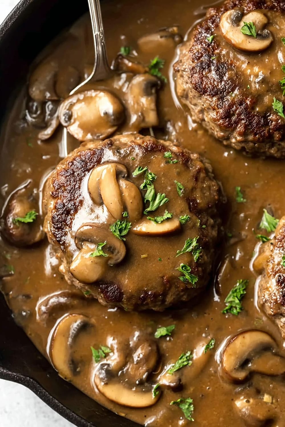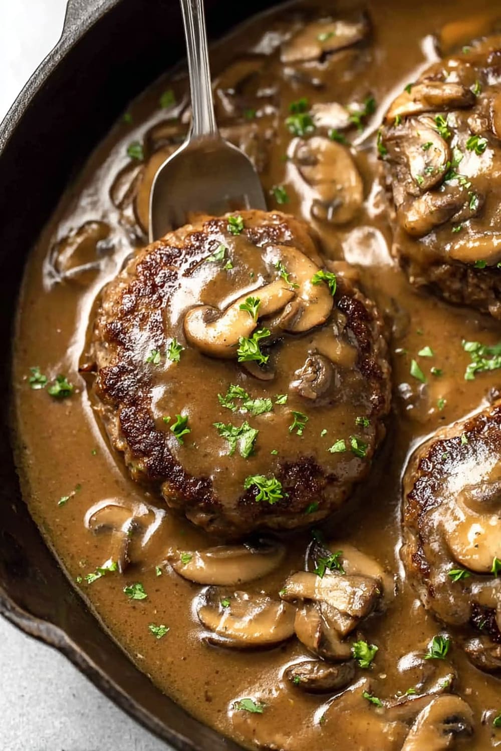 Picture tender, juicy beef patties swimming in the most ridiculously good mushroom gravy that’s basically liquid gold with chunks of earthy mushrooms throughout.