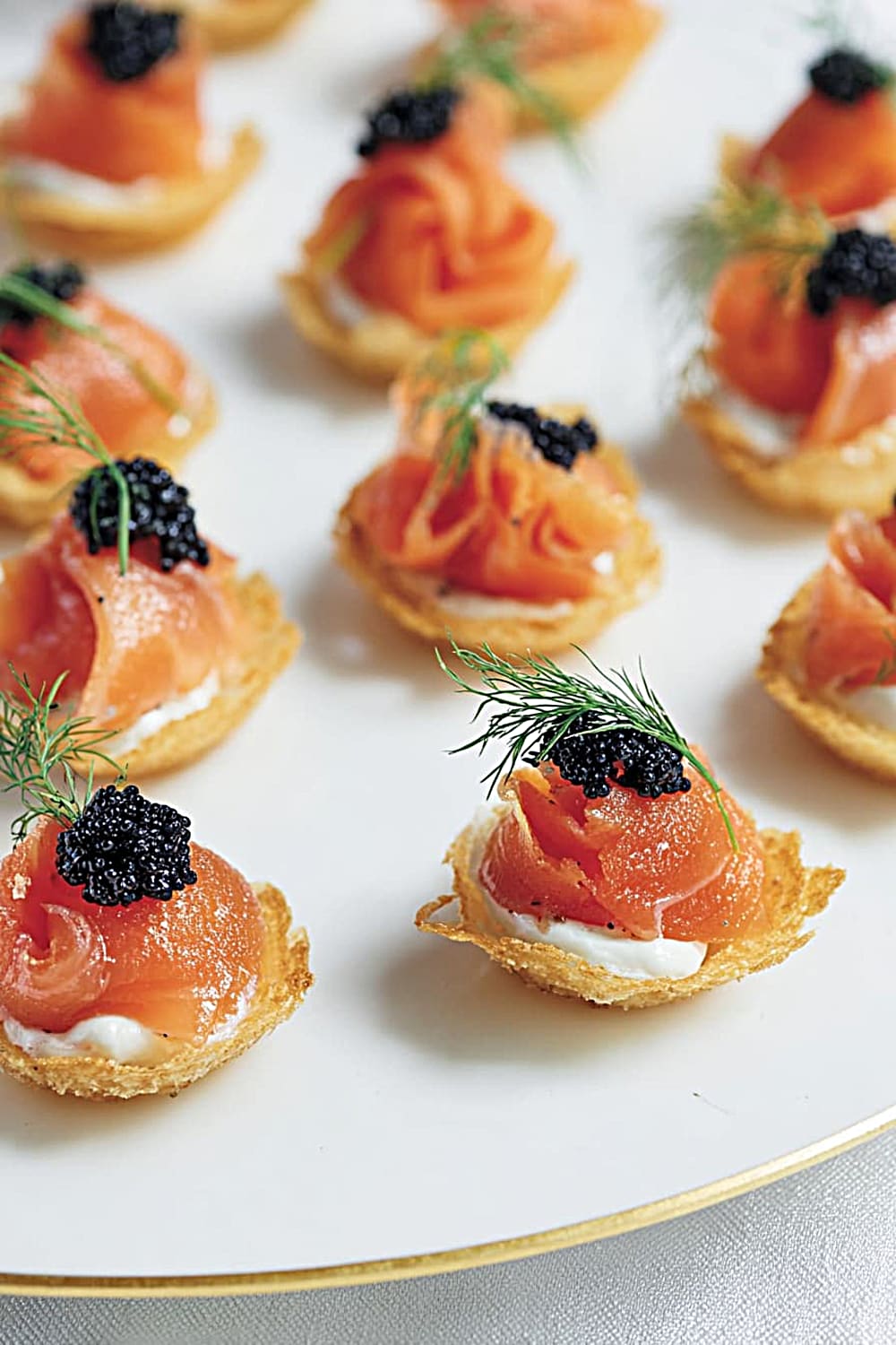 Build a Titanic-themed dinner party starting with these canapés, followed by beef Wellington or roasted duck as the main course. For brunch entertaining, serve alongside eggs Benedict, fresh fruit, and Danish pastries. Create a Scandinavian feast with Swedish meatballs, rye bread, and lingonberry sauce. New Year’s Eve menus shine with these canapés followed by rack of lamb and chocolate soufflé.