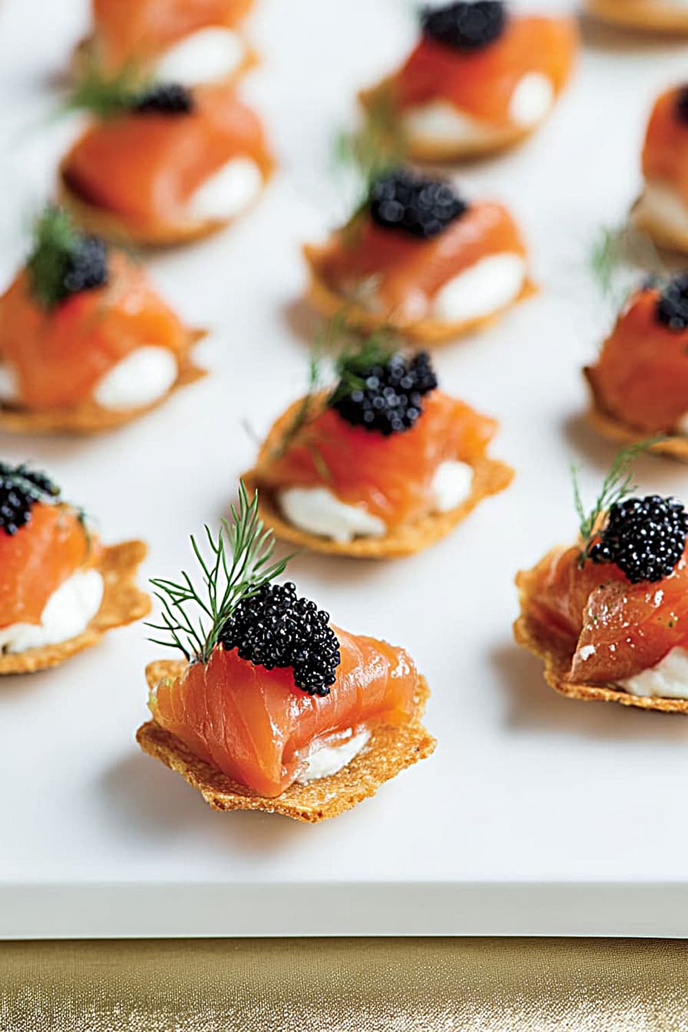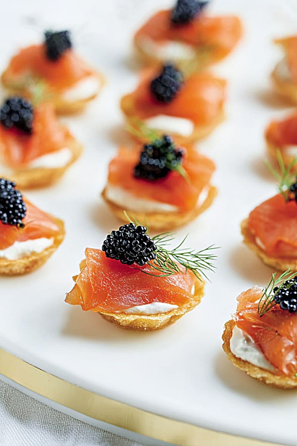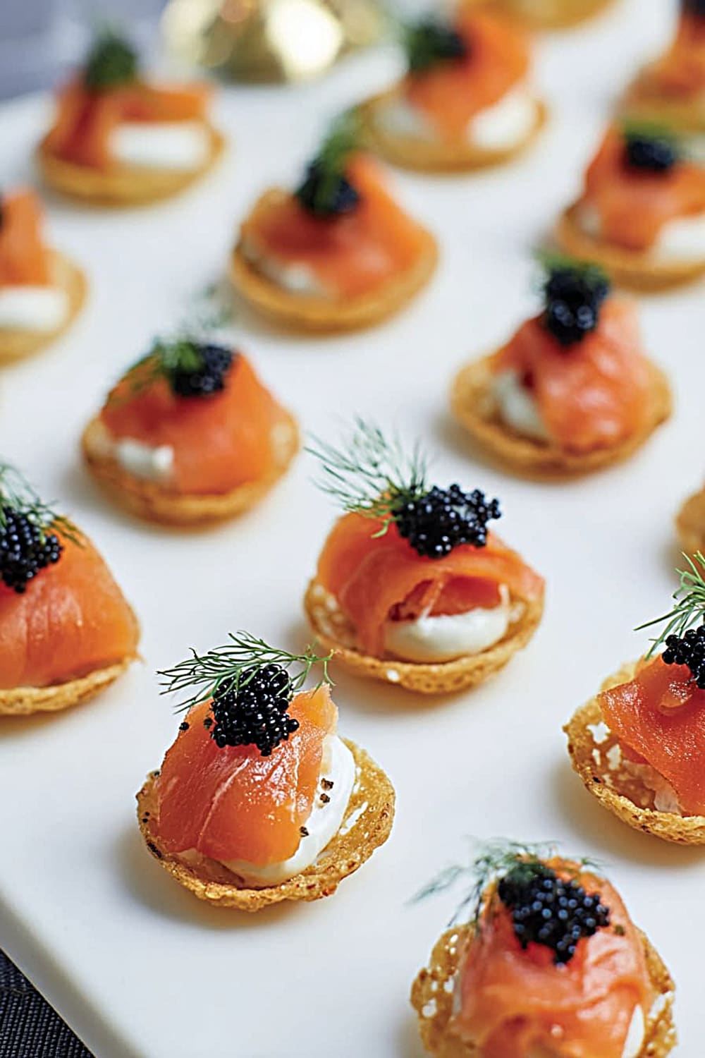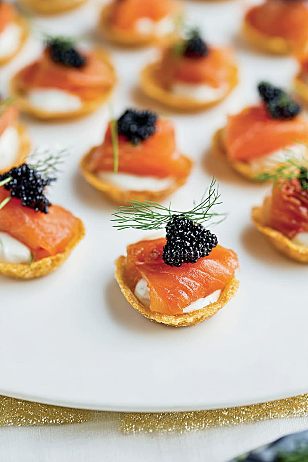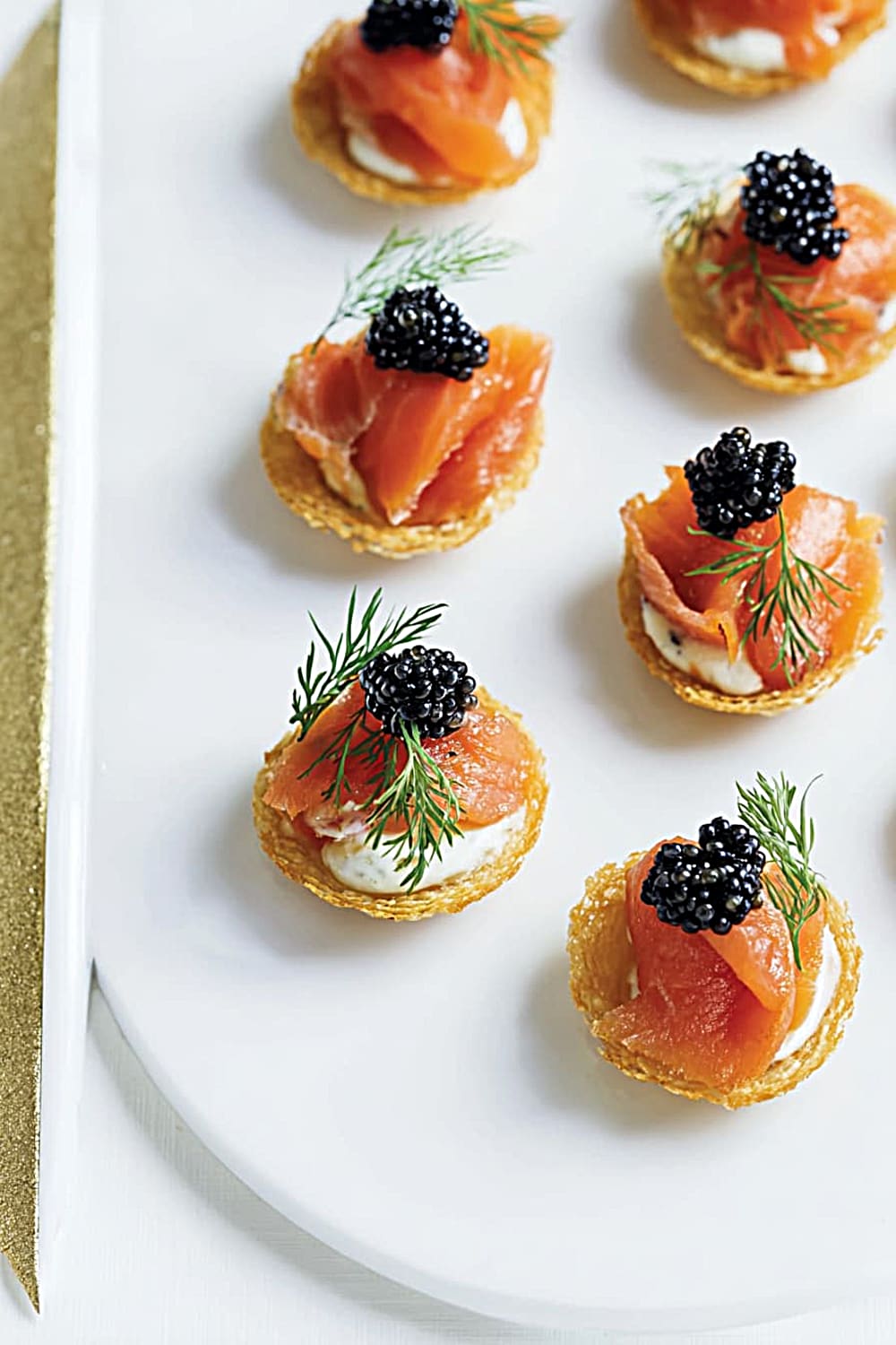 - 8 Fill each hors-d’oeuvre shell with about 1 teaspoon of the mustard cream mixture. Top each with a generous portion of the diced gravlax, and finish with a small dill frond and mullet roe if using. Serve immediately for the crispest shells and best texture contrast.