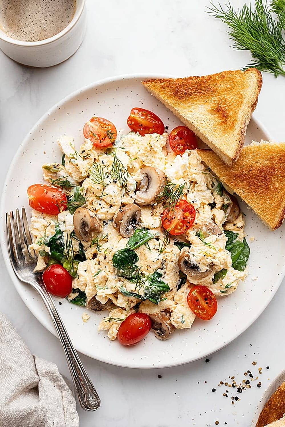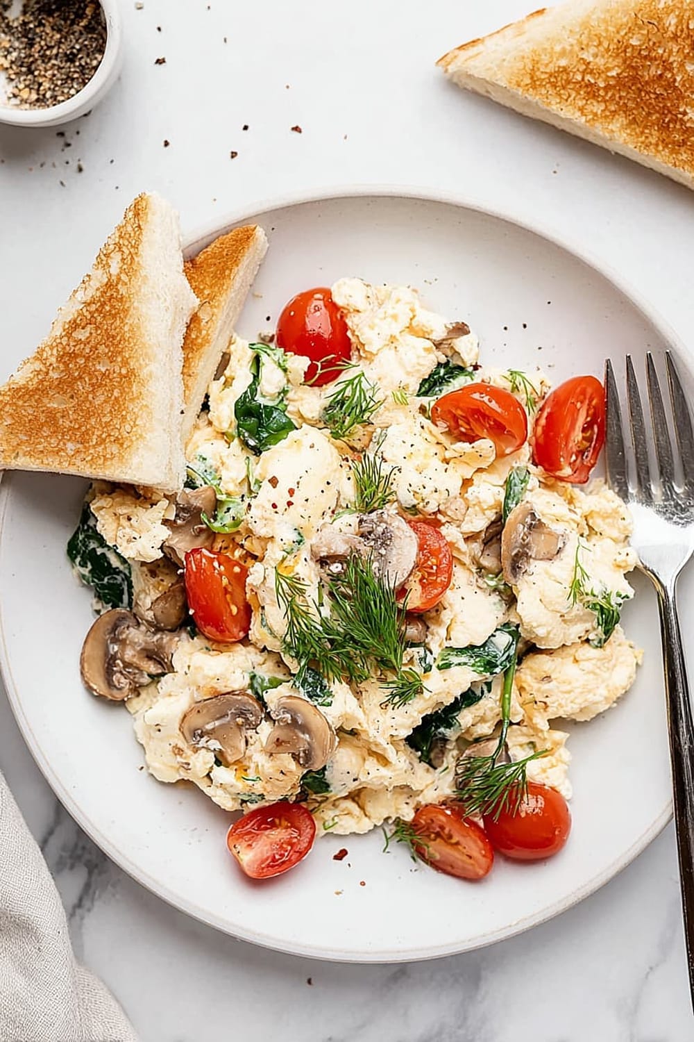 Store leftovers in the refrigerator for up to 3 days in an airtight container. Reheat gently in a non-stick pan over low heat with a splash of water or broth to restore moisture. Avoid microwaving, which tends to make egg whites rubbery and unappetizing.