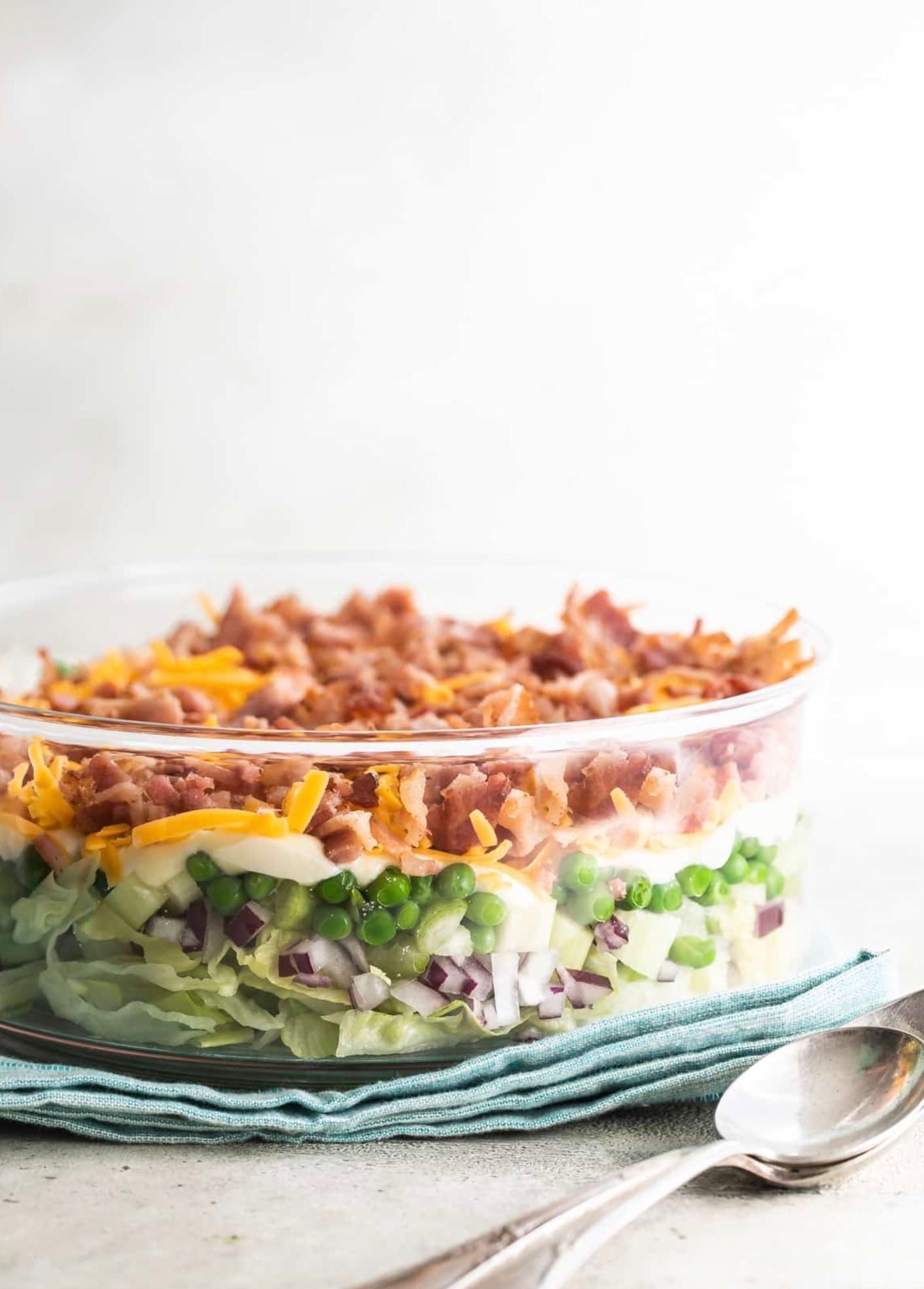 Don’t toss the salad before serving – let everyone dig in and mix their own portions. This keeps the layers looking nice and the bacon crispy.