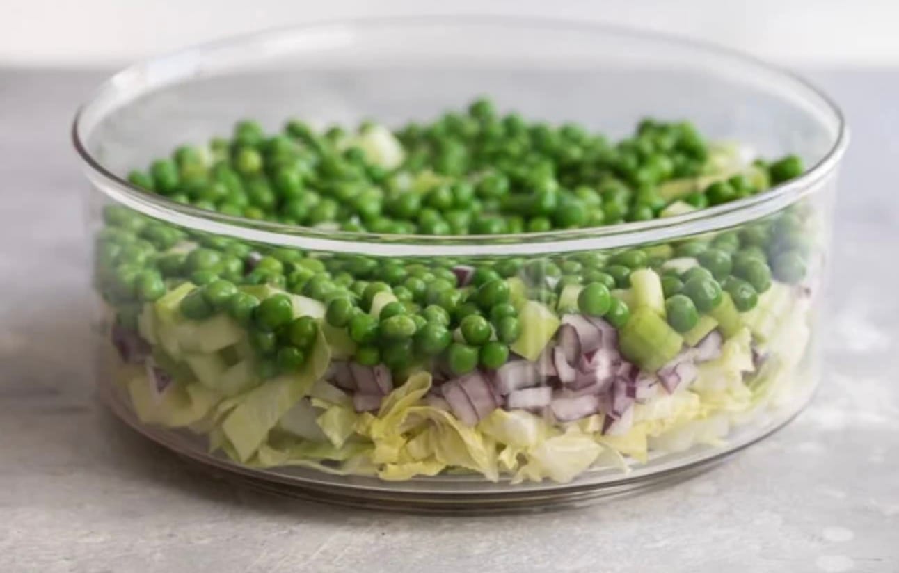 Layer the onion, celery, and peas on top of the lettuce in that order.
