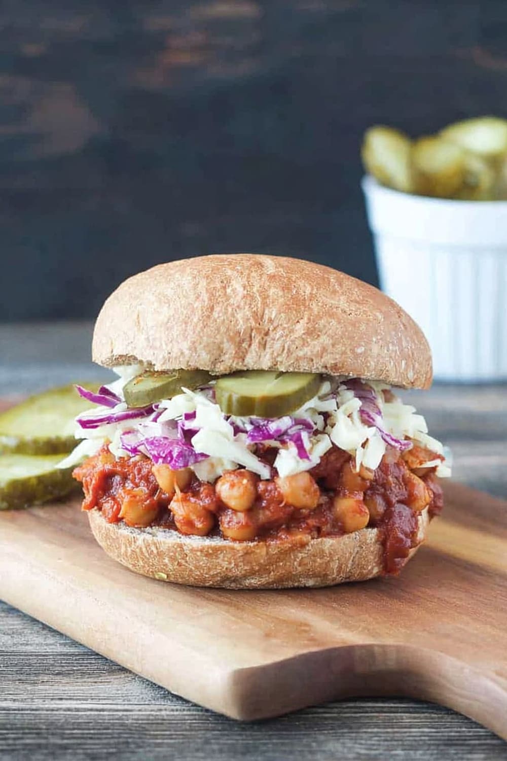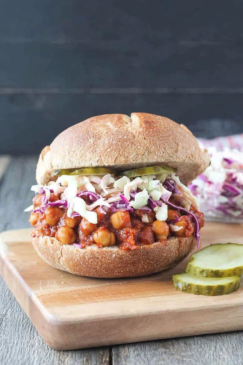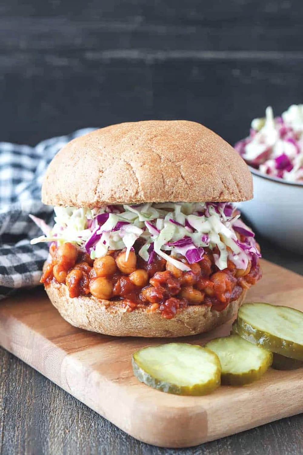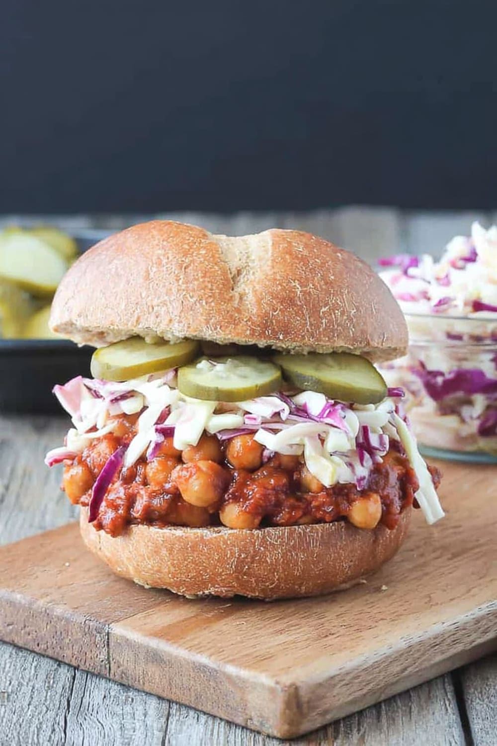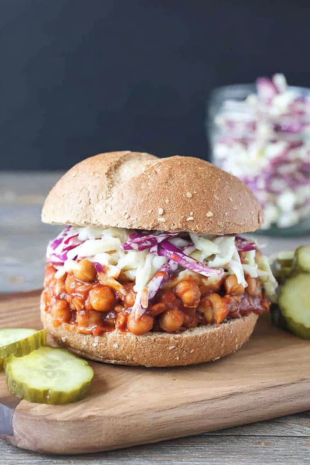 - 9 To serve, generously scoop the BBQ chickpea mixture onto the bottom half of each bun. Top with a hearty portion of the vegan coleslaw and pickles if desired. Crown with the top bun and prepare for the delicious mess that’s about to happen!