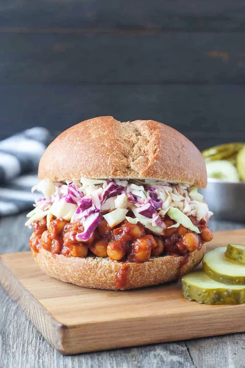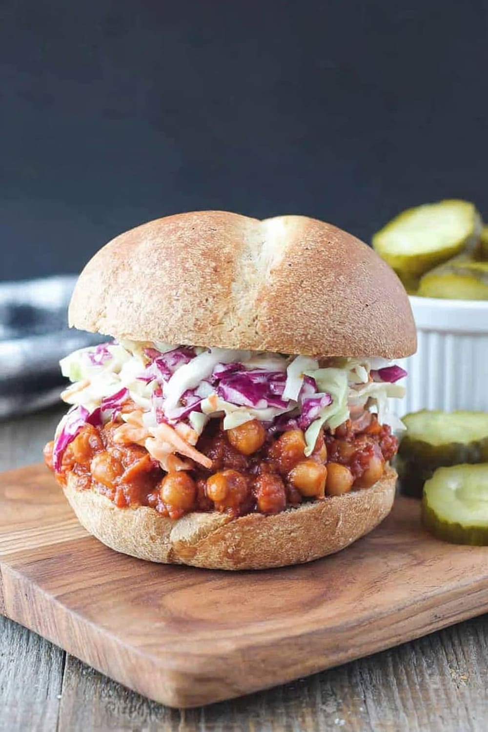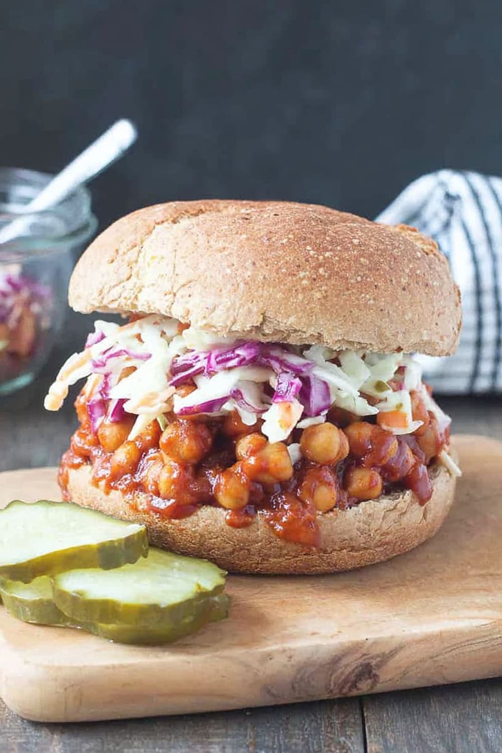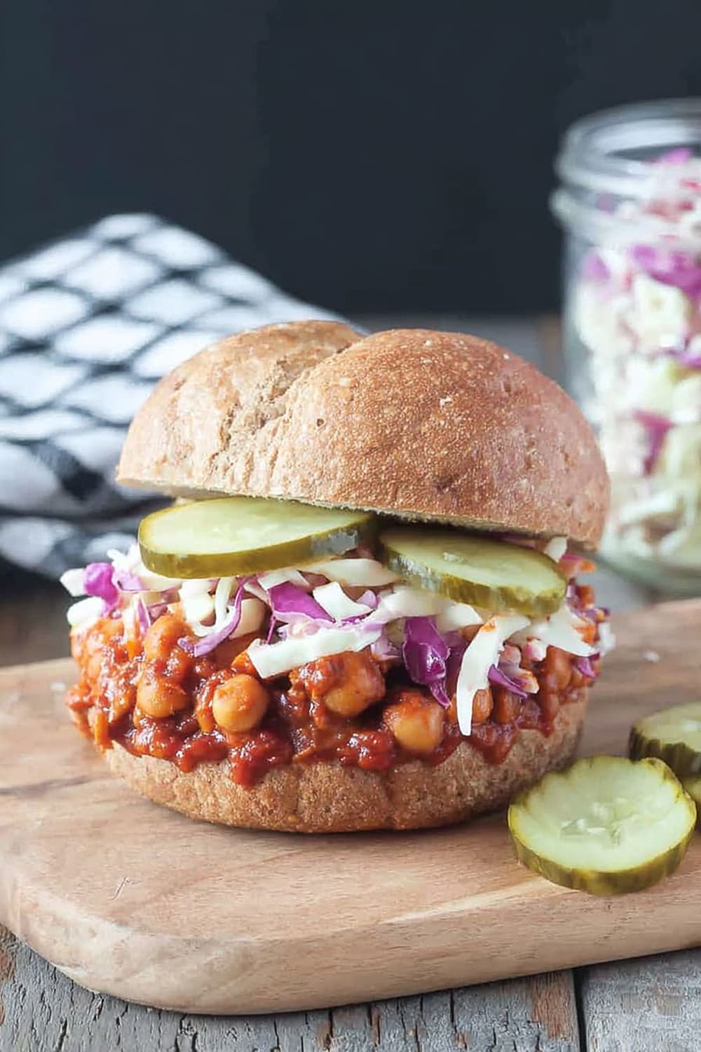 - 9 To serve, generously scoop the BBQ chickpea mixture onto the bottom half of each bun. Top with a hearty portion of the vegan coleslaw and pickles if desired. Crown with the top bun and prepare for the delicious mess that’s about to happen!