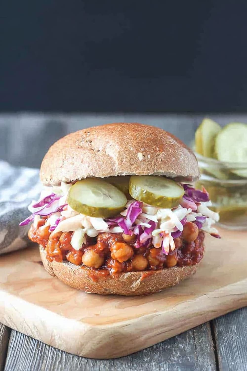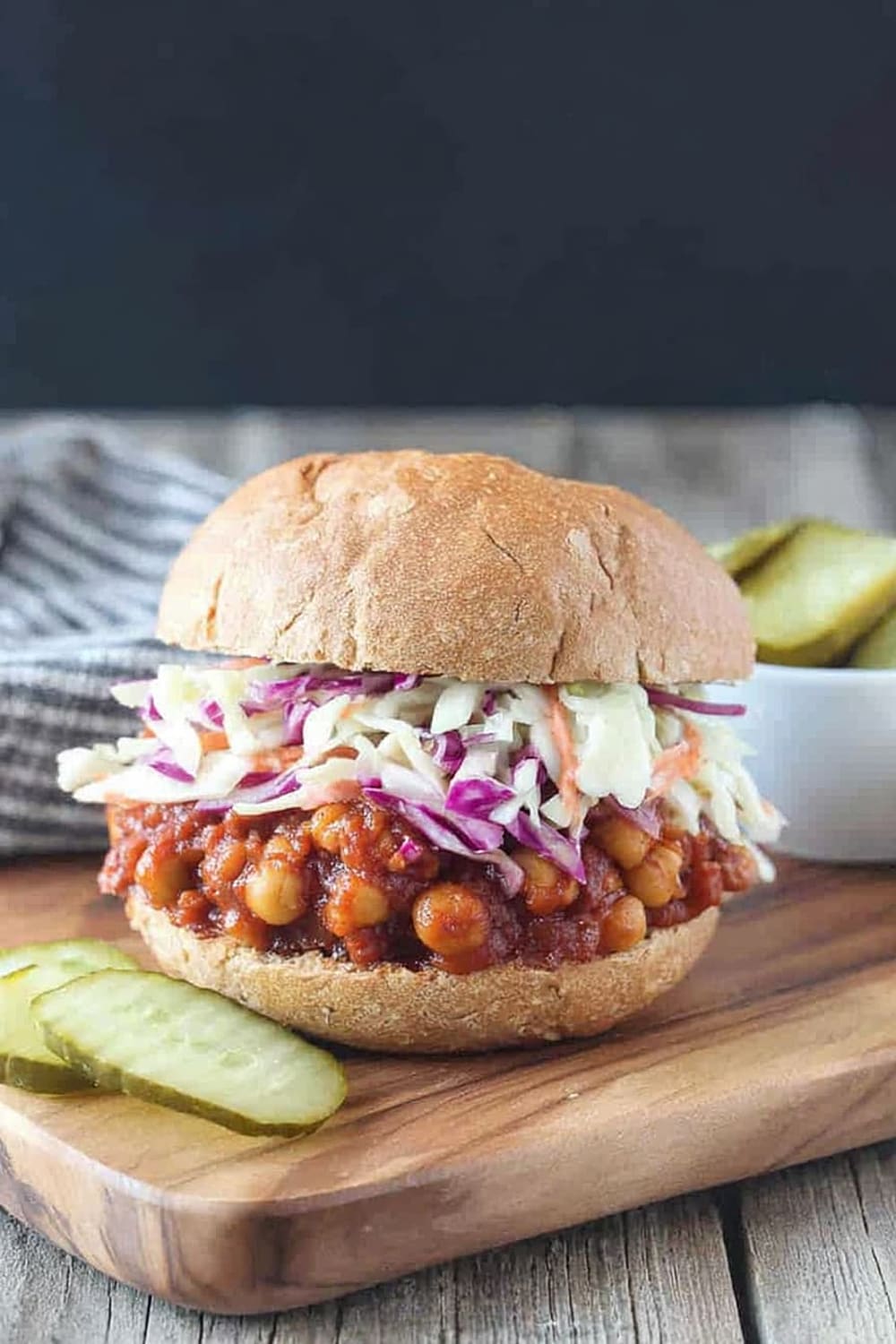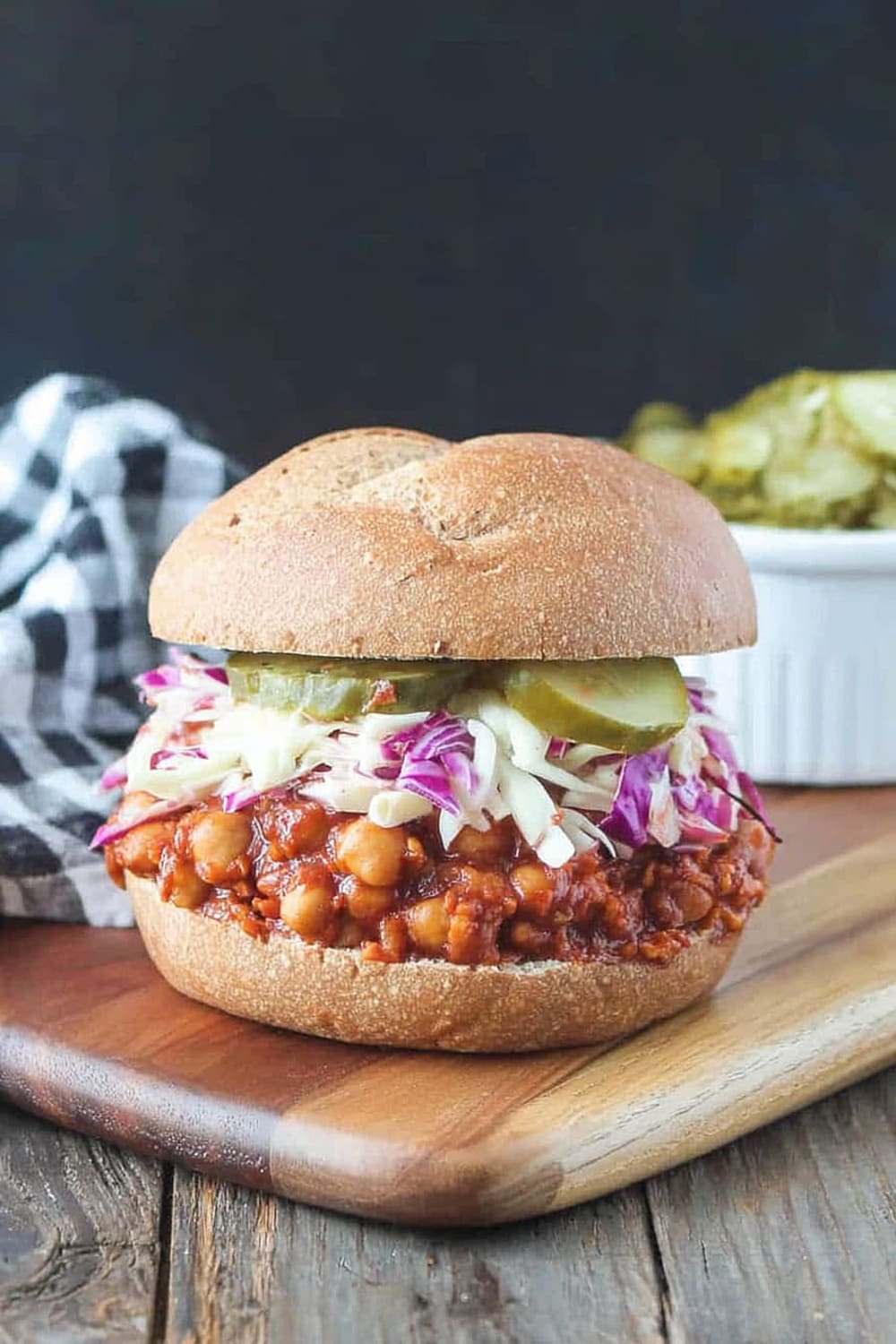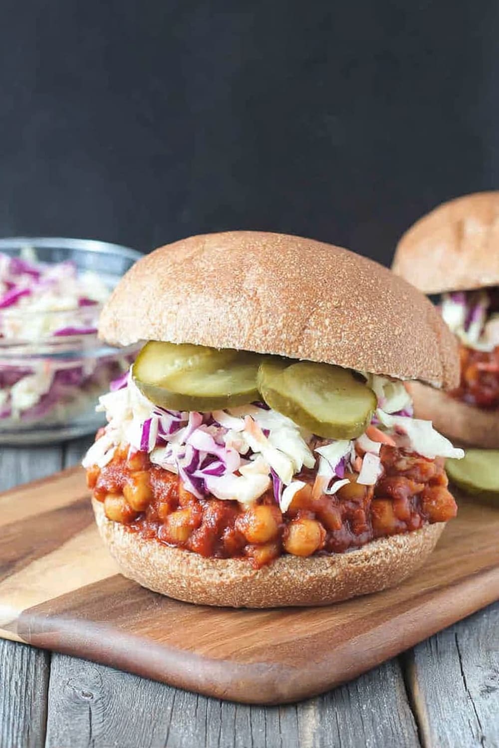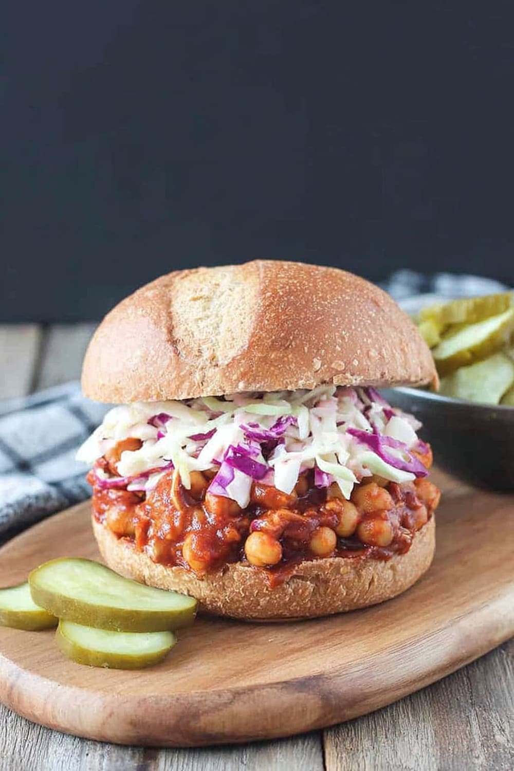 - 9 To serve, generously scoop the BBQ chickpea mixture onto the bottom half of each bun. Top with a hearty portion of the vegan coleslaw and pickles if desired. Crown with the top bun and prepare for the delicious mess that’s about to happen!