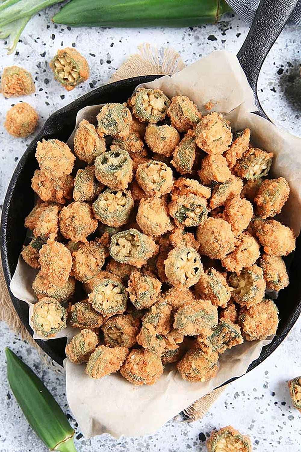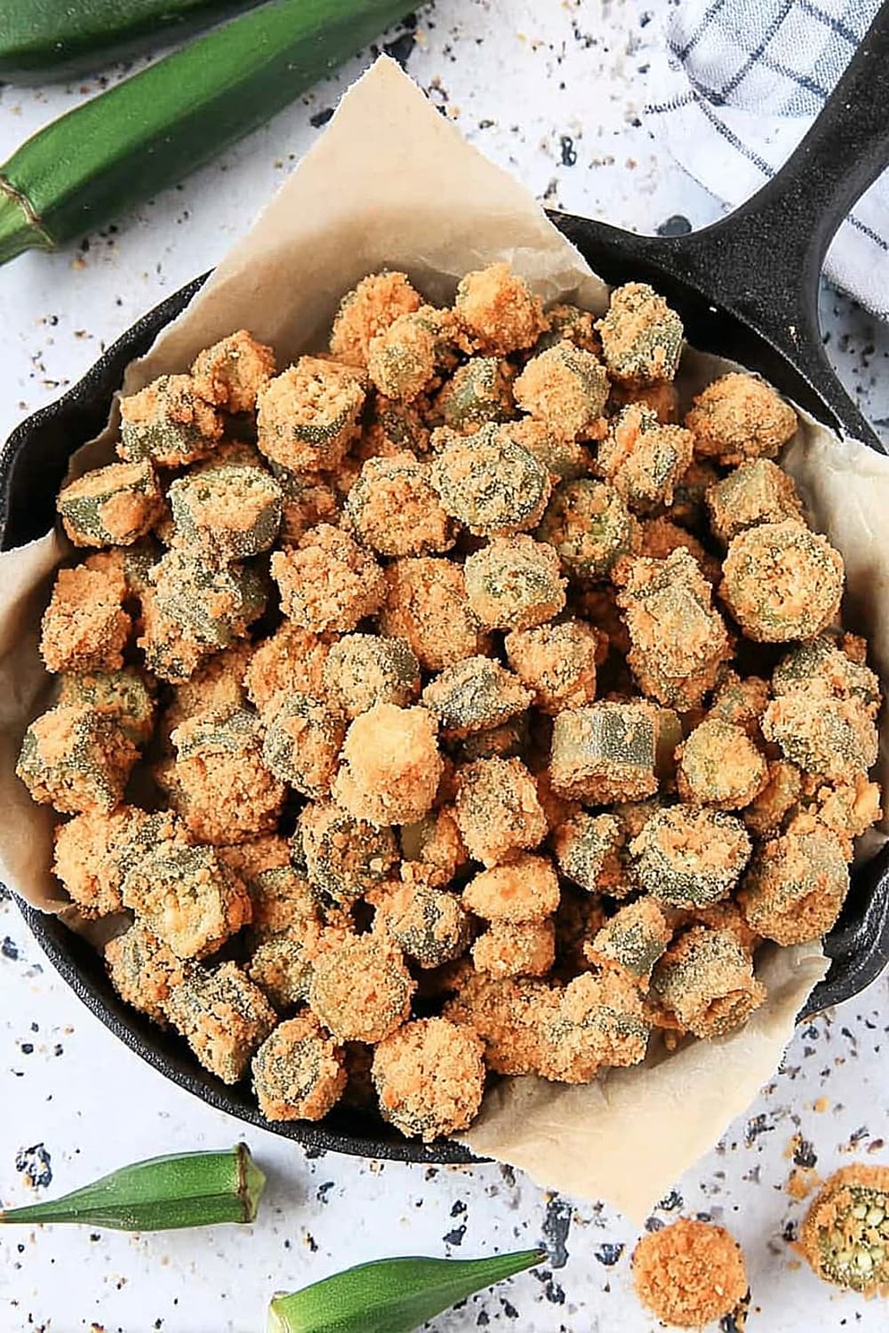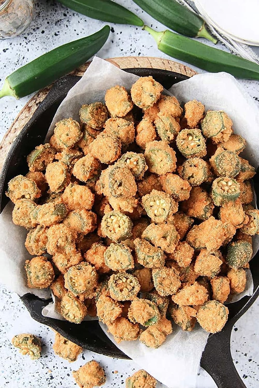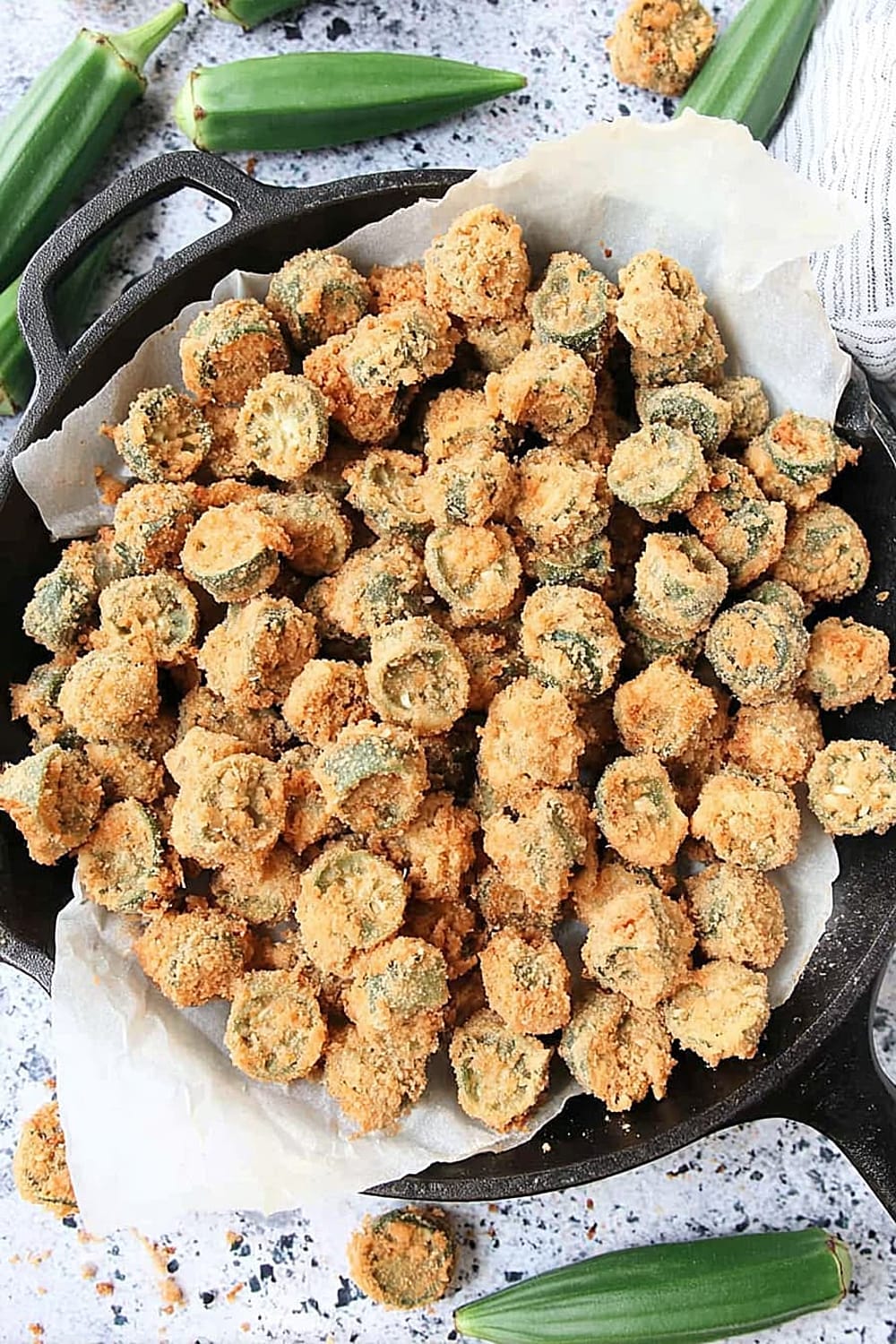 Build a backyard barbecue spread with pulled pork, fried okra, baked beans, and cornbread for casual entertaining. For Sunday dinner, pair with fried chicken, mashed potatoes, green beans, and biscuits. Create a fish fry feast featuring catfish, fried okra, hush puppies, and tartar sauce. Vegetarian option: Serve alongside black-eyed peas, collard greens, and cornbread for a satisfying plant-forward meal.