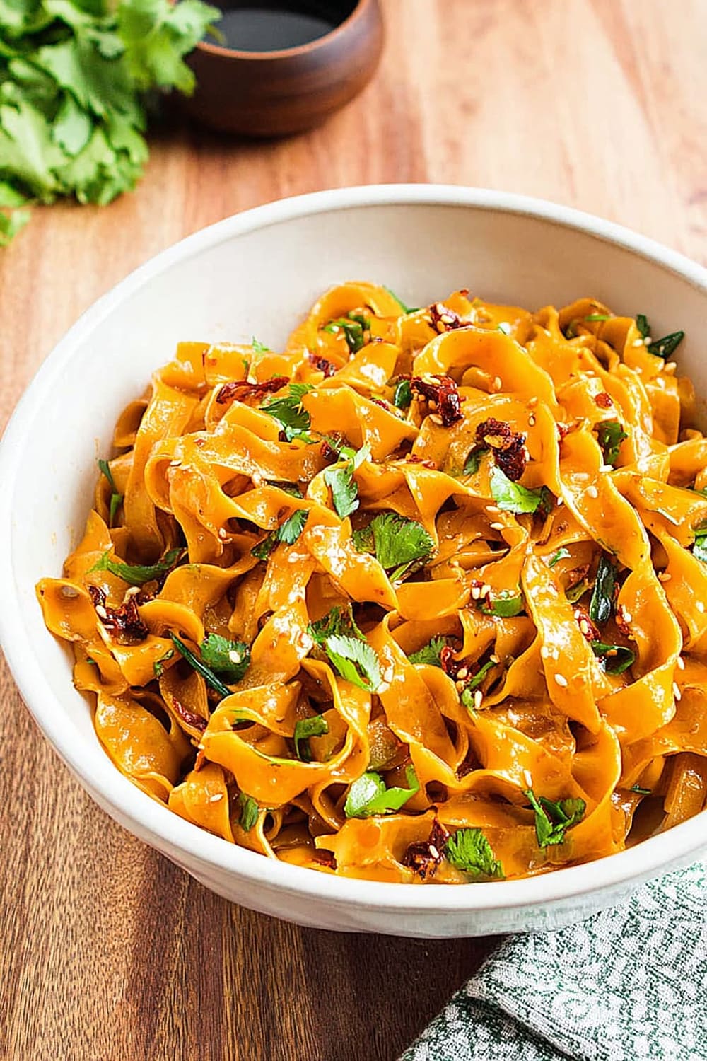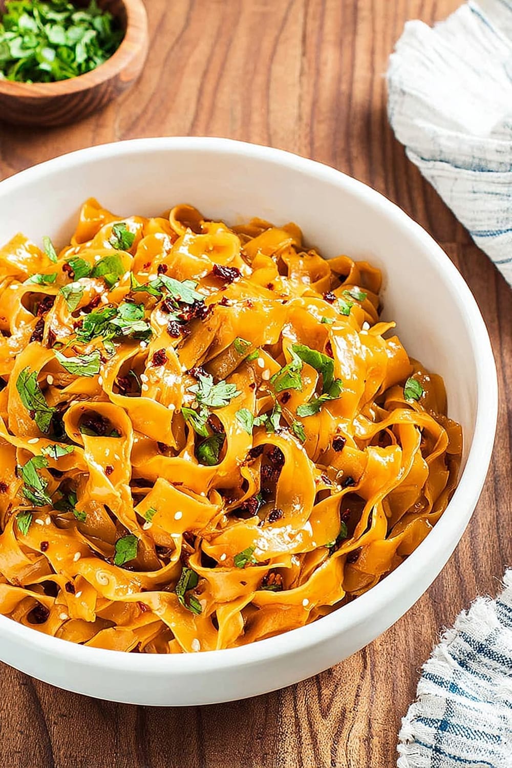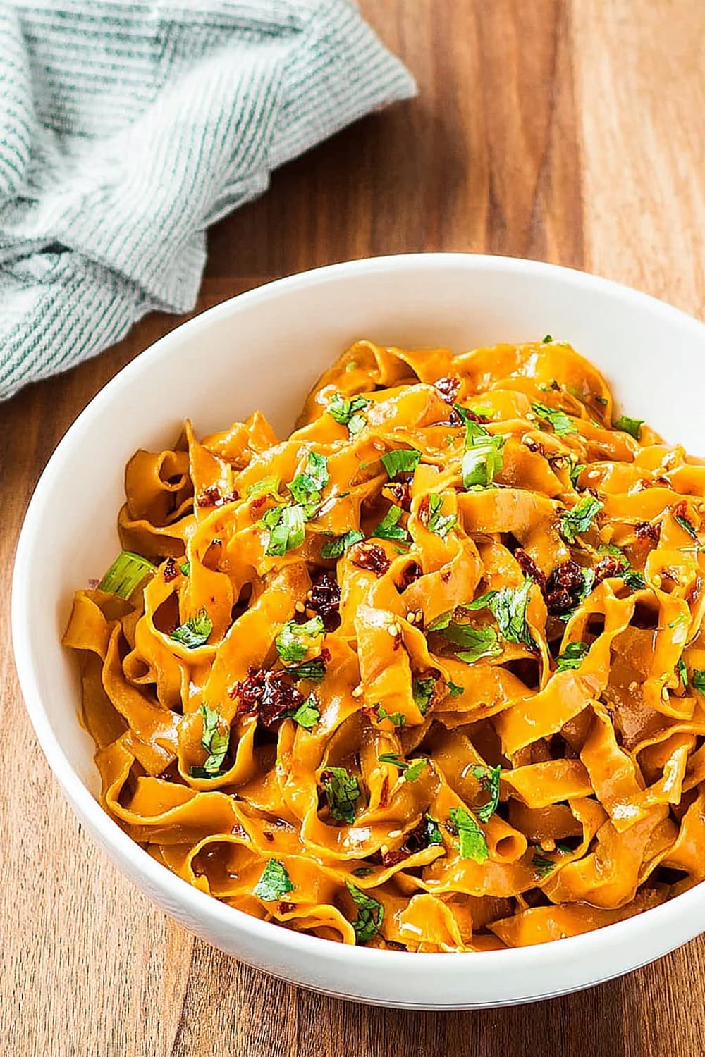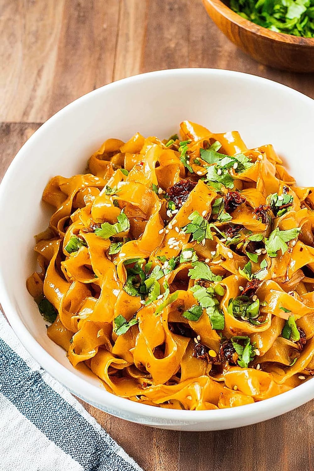 - 8 Divide the sauced noodles between two serving bowls and top generously with chopped scallions, fresh cilantro, and a sprinkle of sesame seeds. Serve immediately while the noodles are still warm and the aromatics are at their peak.