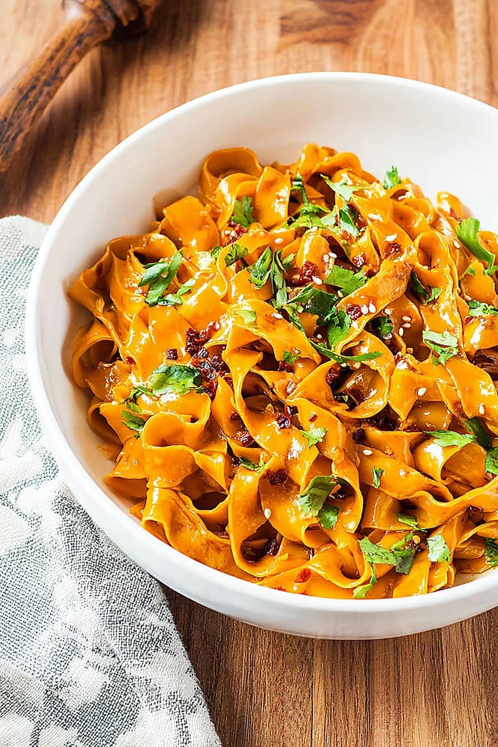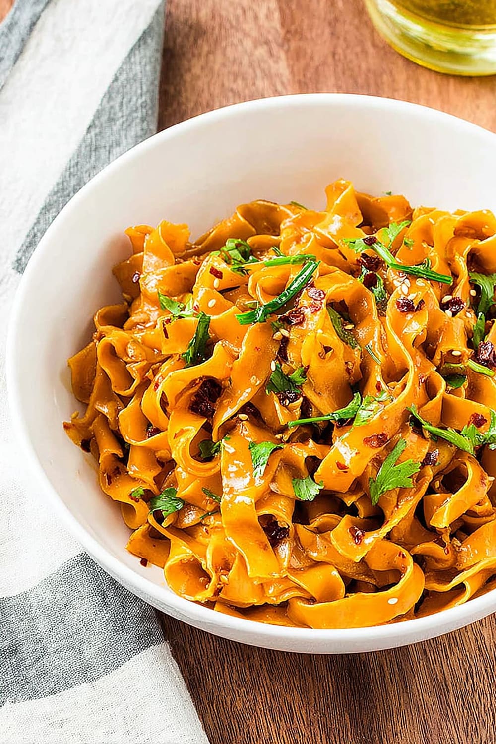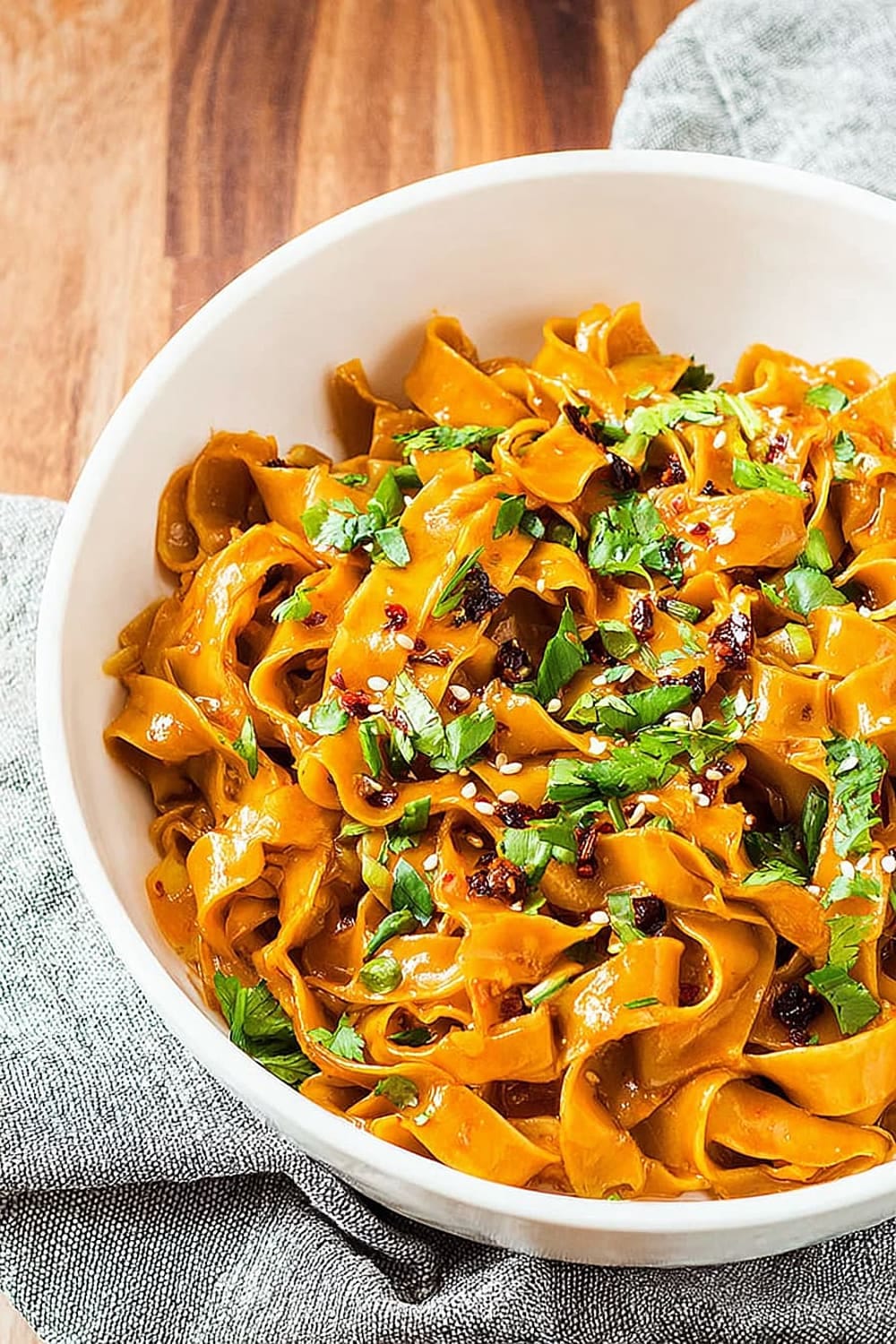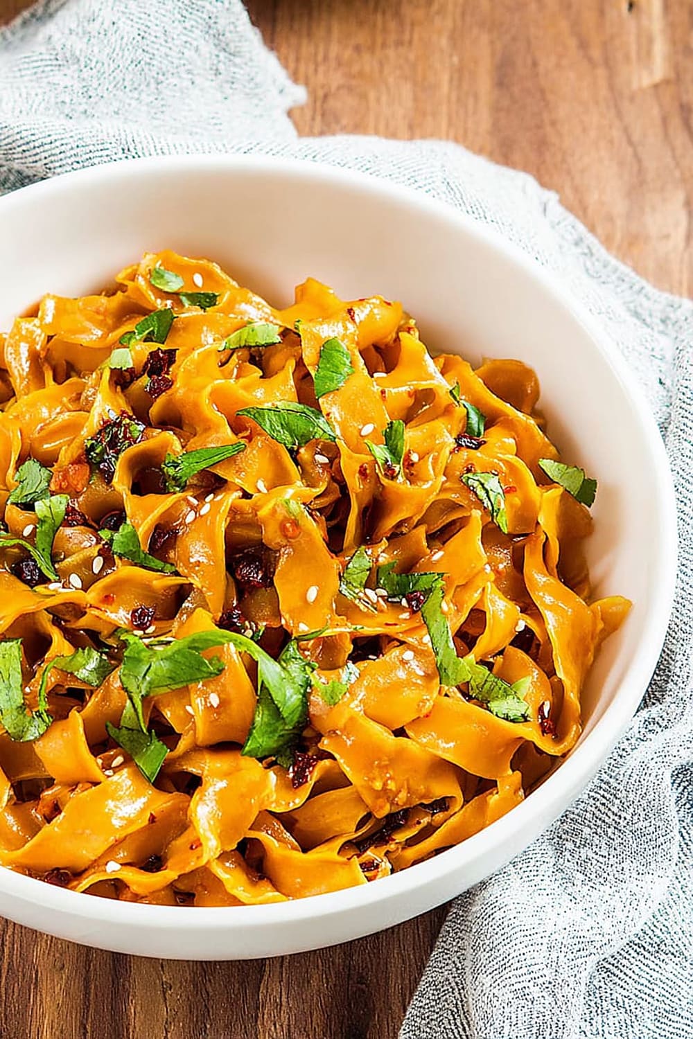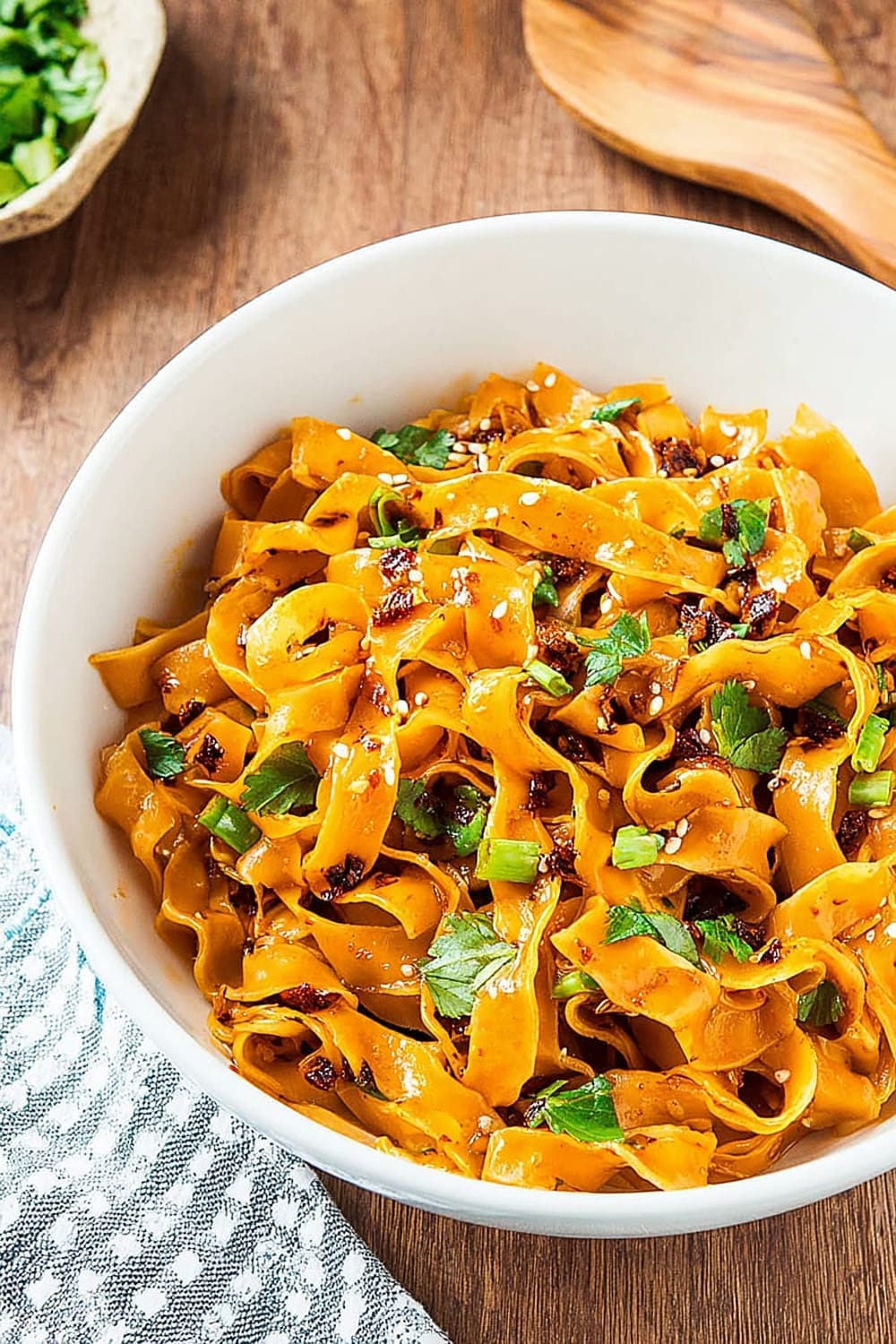 - 8 Divide the sauced noodles between two serving bowls and top generously with chopped scallions, fresh cilantro, and a sprinkle of sesame seeds. Serve immediately while the noodles are still warm and the aromatics are at their peak.