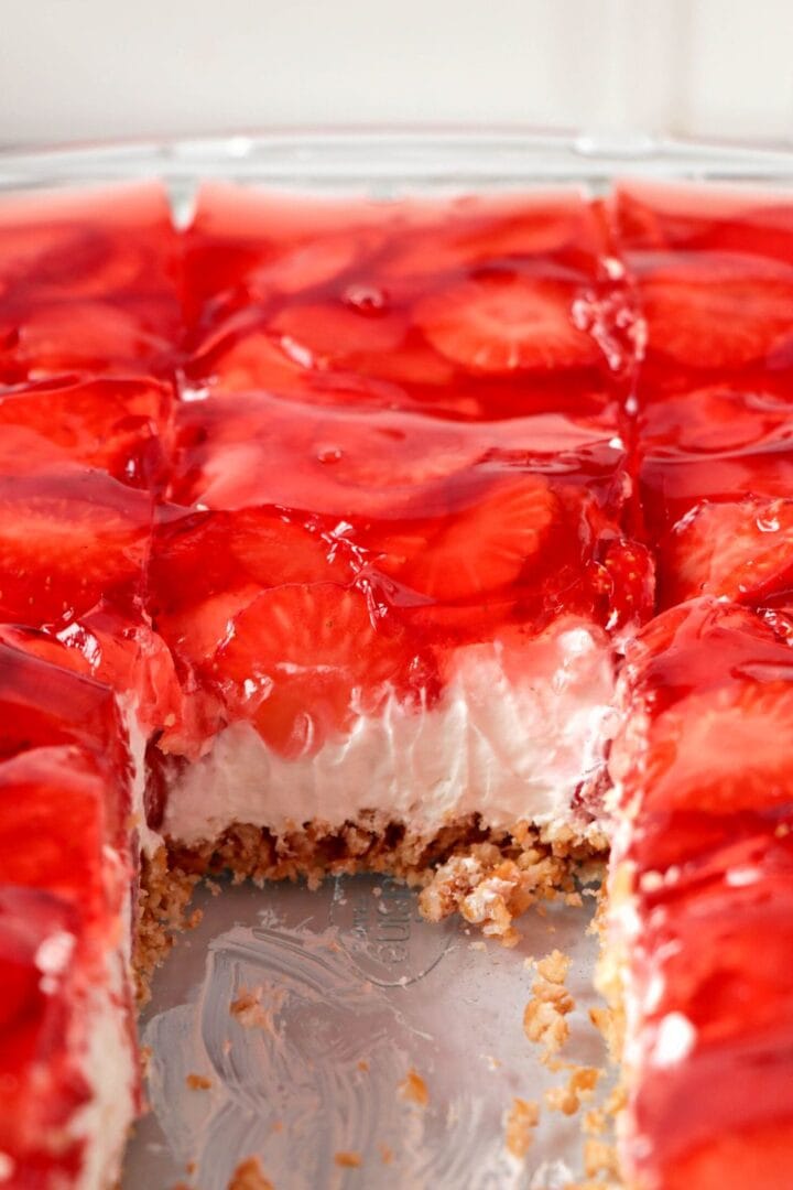 Combining the crunchiness of pretzels with the creaminess of a sweetened cream cheese layer and the freshness of strawberries topped with a thrilling layer of strawberry gelatin, this dish strikes a perfect balance between sweet and salty. It’s not only a treat for the palate but also a visually appealing dessert that’s sure to catch eyes when set on a table.
