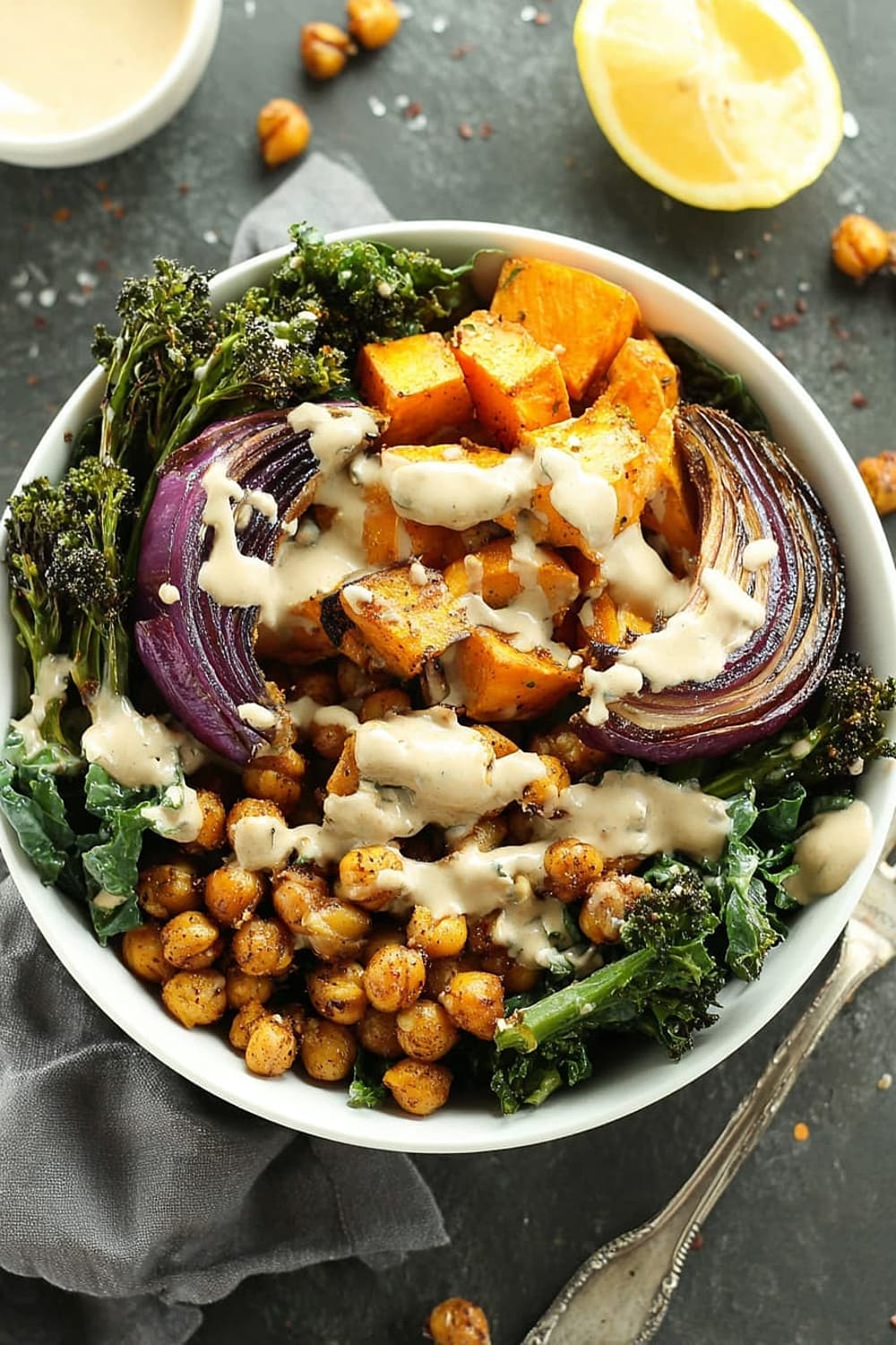 Prep vegetables and chickpeas up to 2 days ahead, storing them separately. The tahini sauce actually improves in flavor after sitting overnight. For meal prep, portion everything into containers but keep the sauce separate until serving to prevent soggy vegetables.