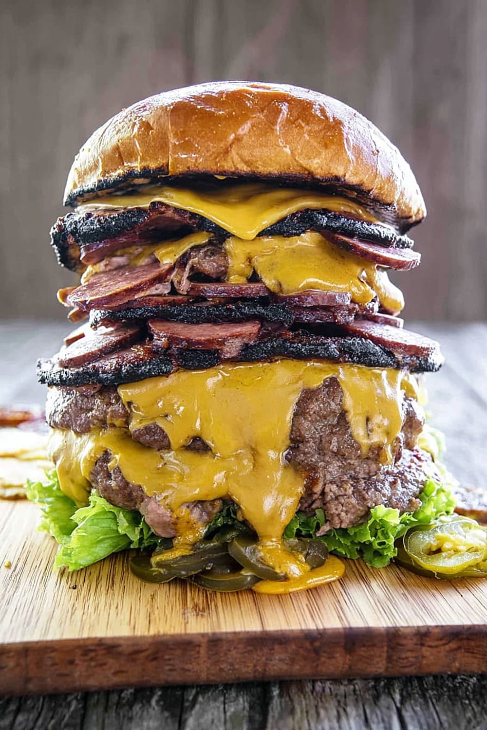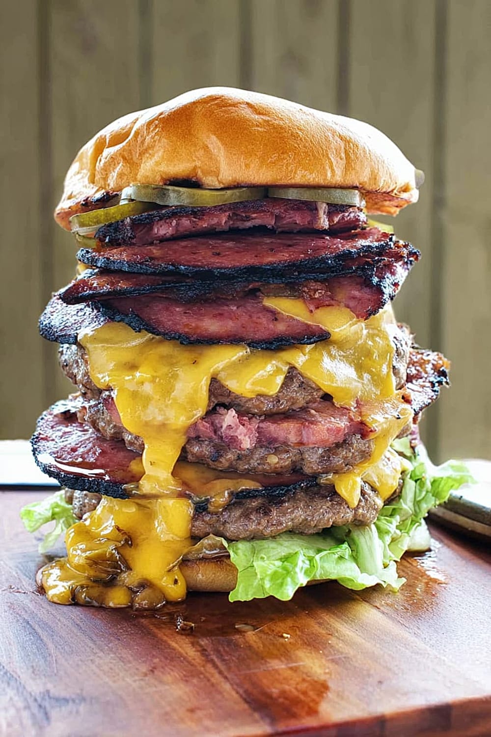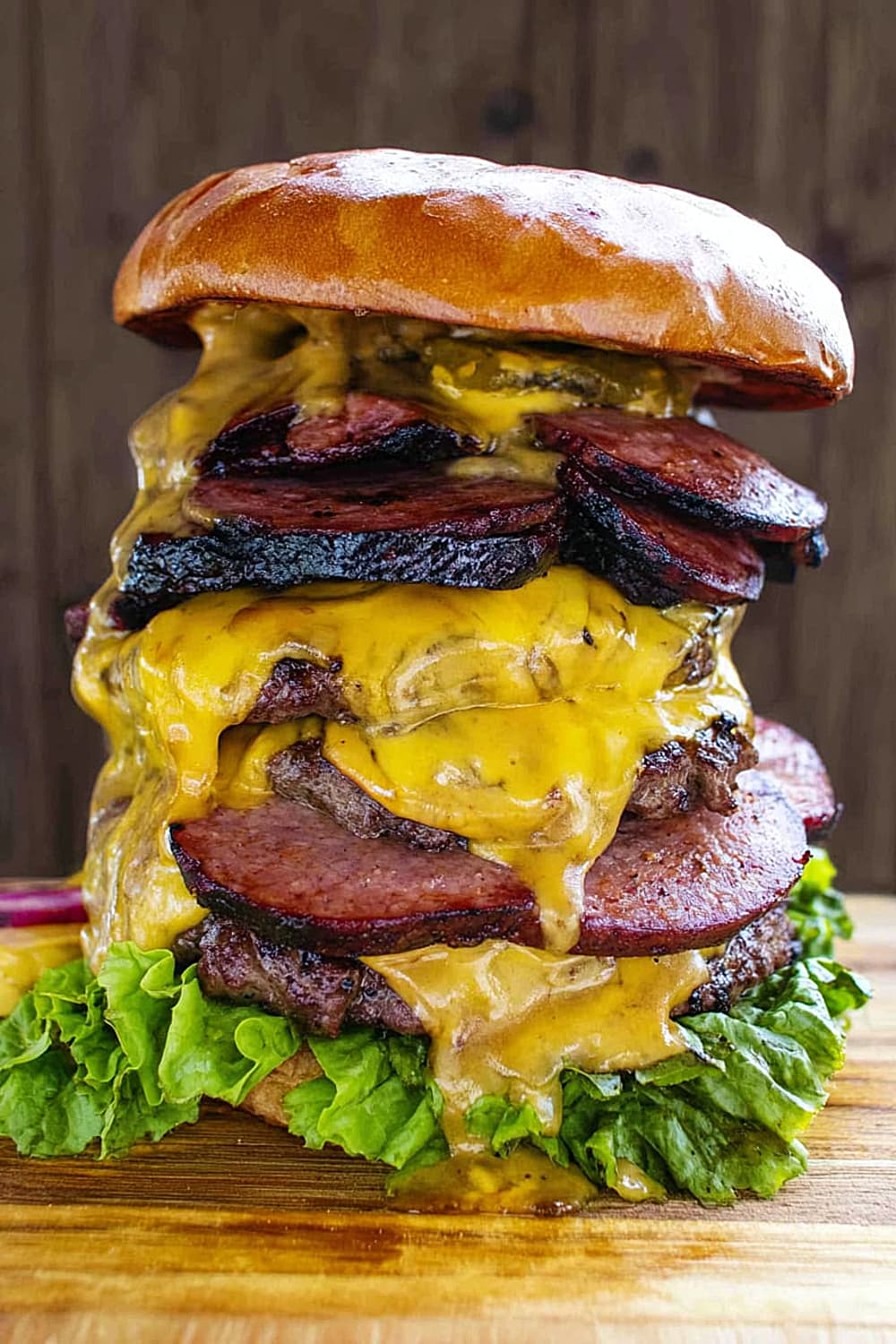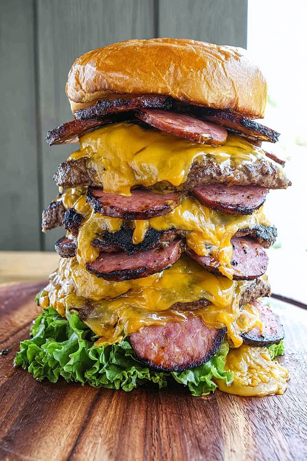 Picture this: thick slabs of house-smoked bologna layered with perfectly grilled beef patties, all drowning in melted cheese and stacked so high you’ll need an engineering degree just to figure out how to take a bite.