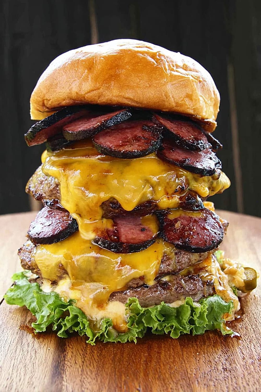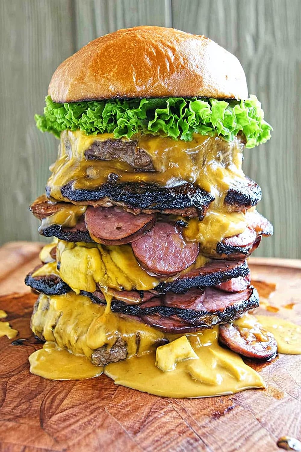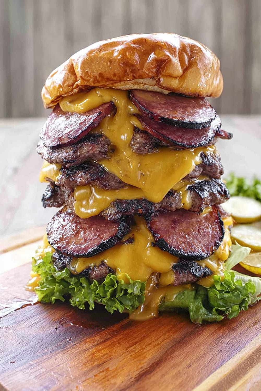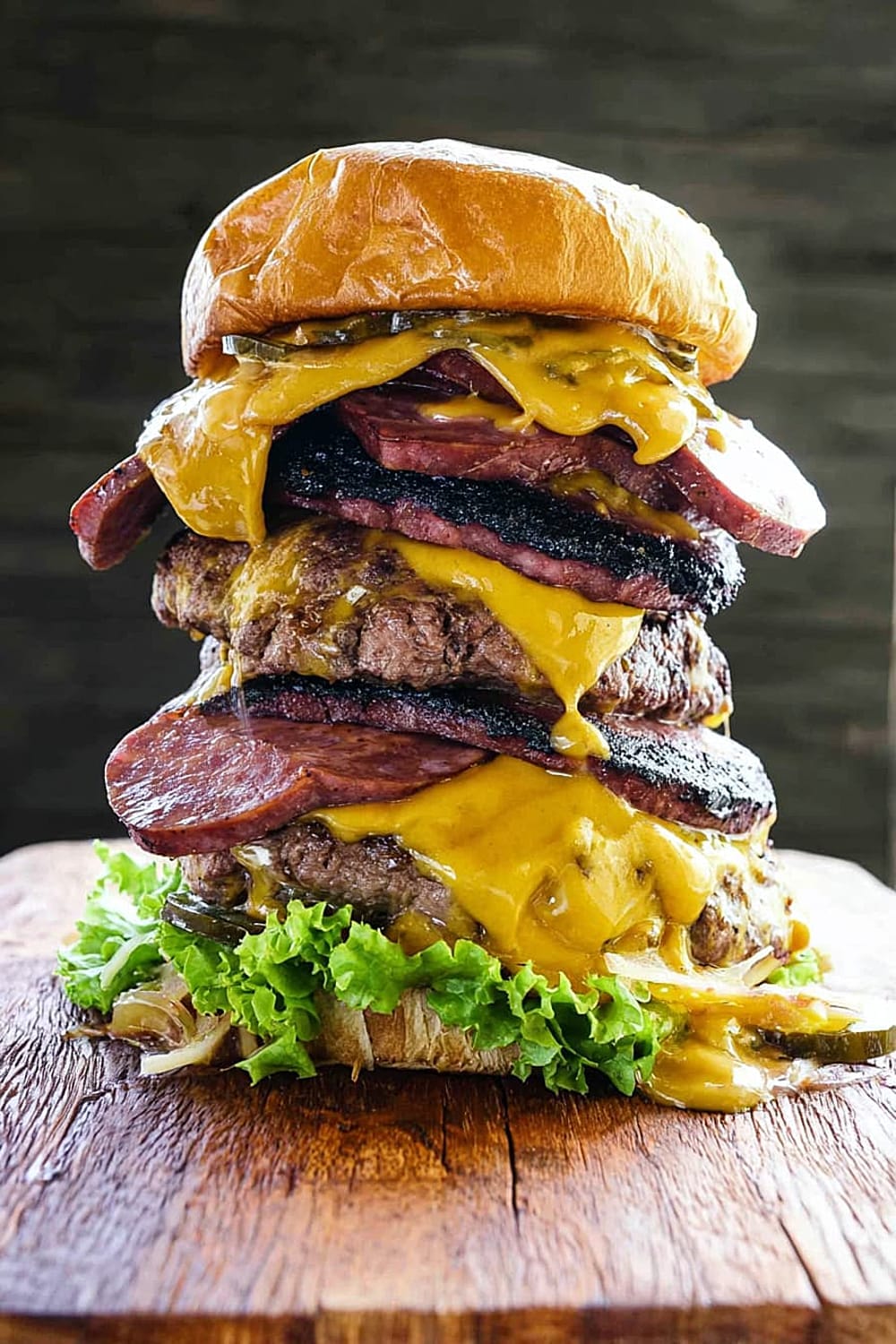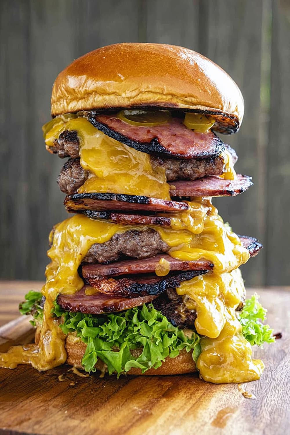 Picture this: thick slabs of house-smoked bologna layered with perfectly grilled beef patties, all drowning in melted cheese and stacked so high you’ll need an engineering degree just to figure out how to take a bite.