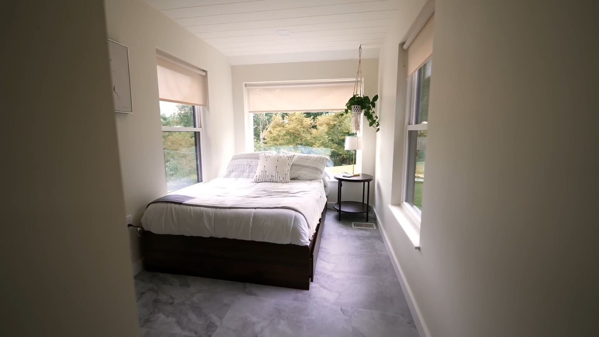 This bedroom showcases that same incredible 270-degree window arrangement, surrounding the bed with natural light and gorgeous views of the surrounding landscape.