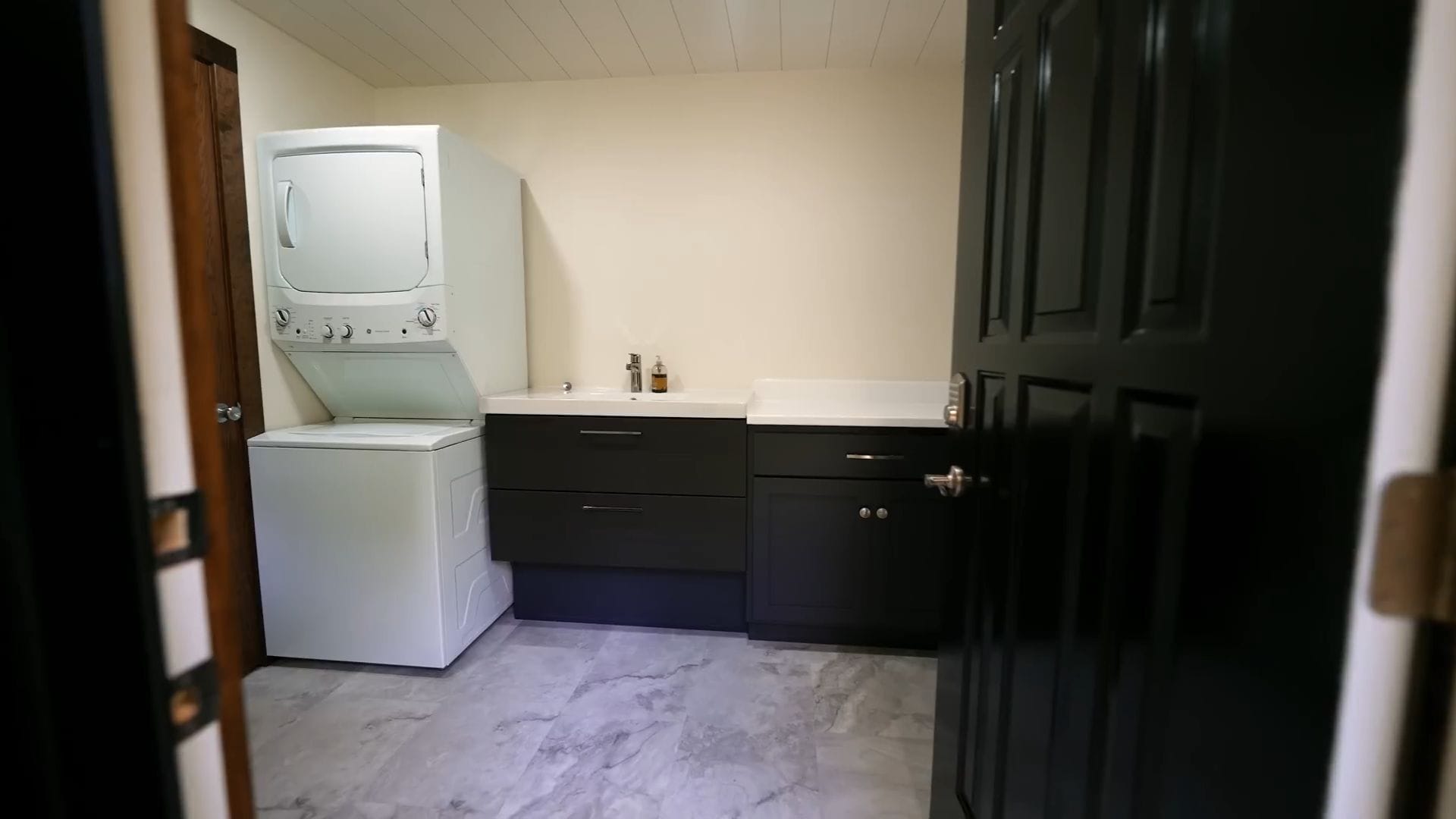 The washer and dryer are positioned here along with a generous sink and expansive countertop space perfect for folding laundry or simply setting down your belongings as you arrive.