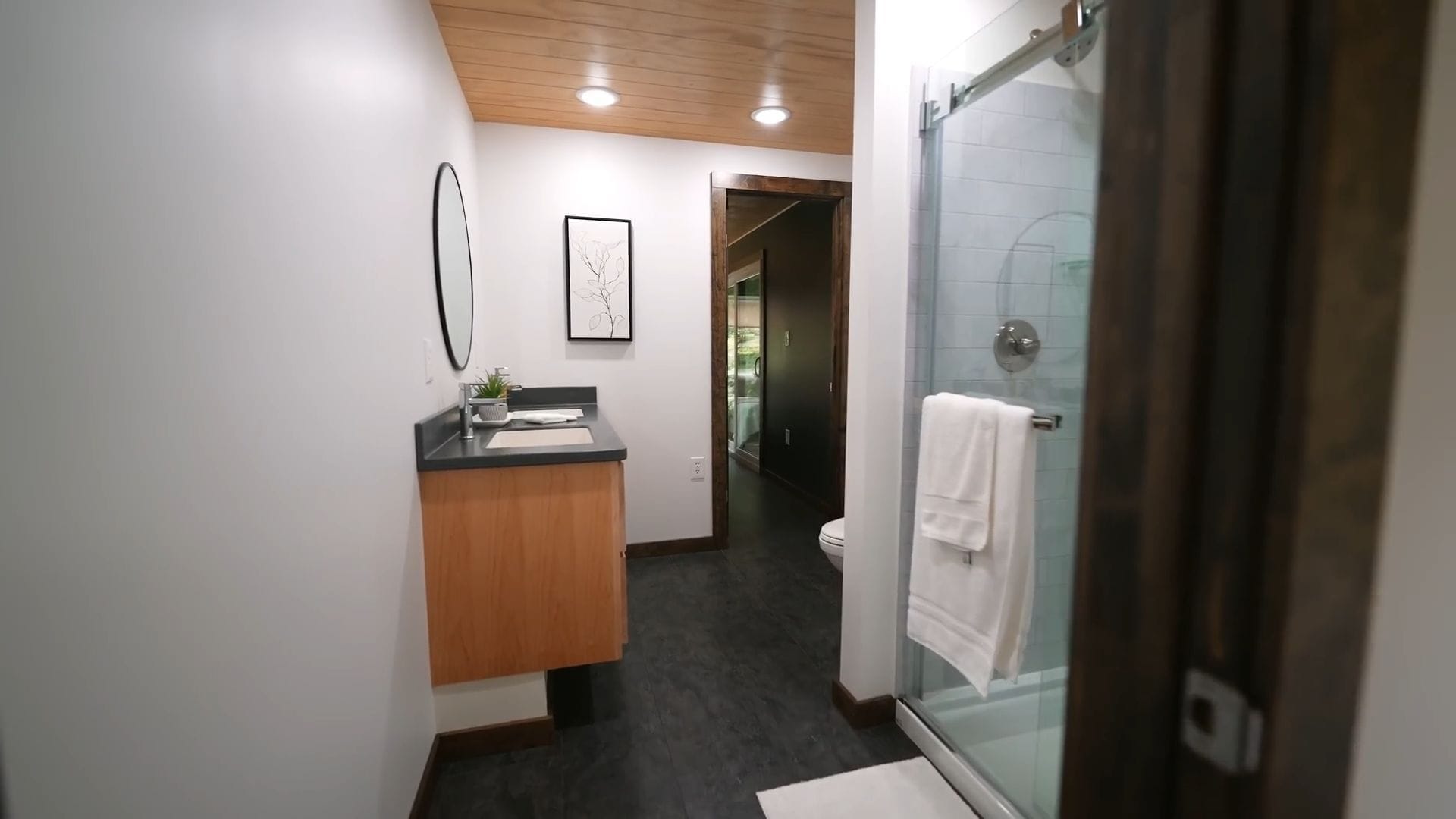 The upper level includes a complete second bathroom with a spacious shower, double vanity, and toilet arranged efficiently along the walls. This full bathroom serves the upstairs bedroom perfectly while maintaining the same high-end finishes found throughout the home.