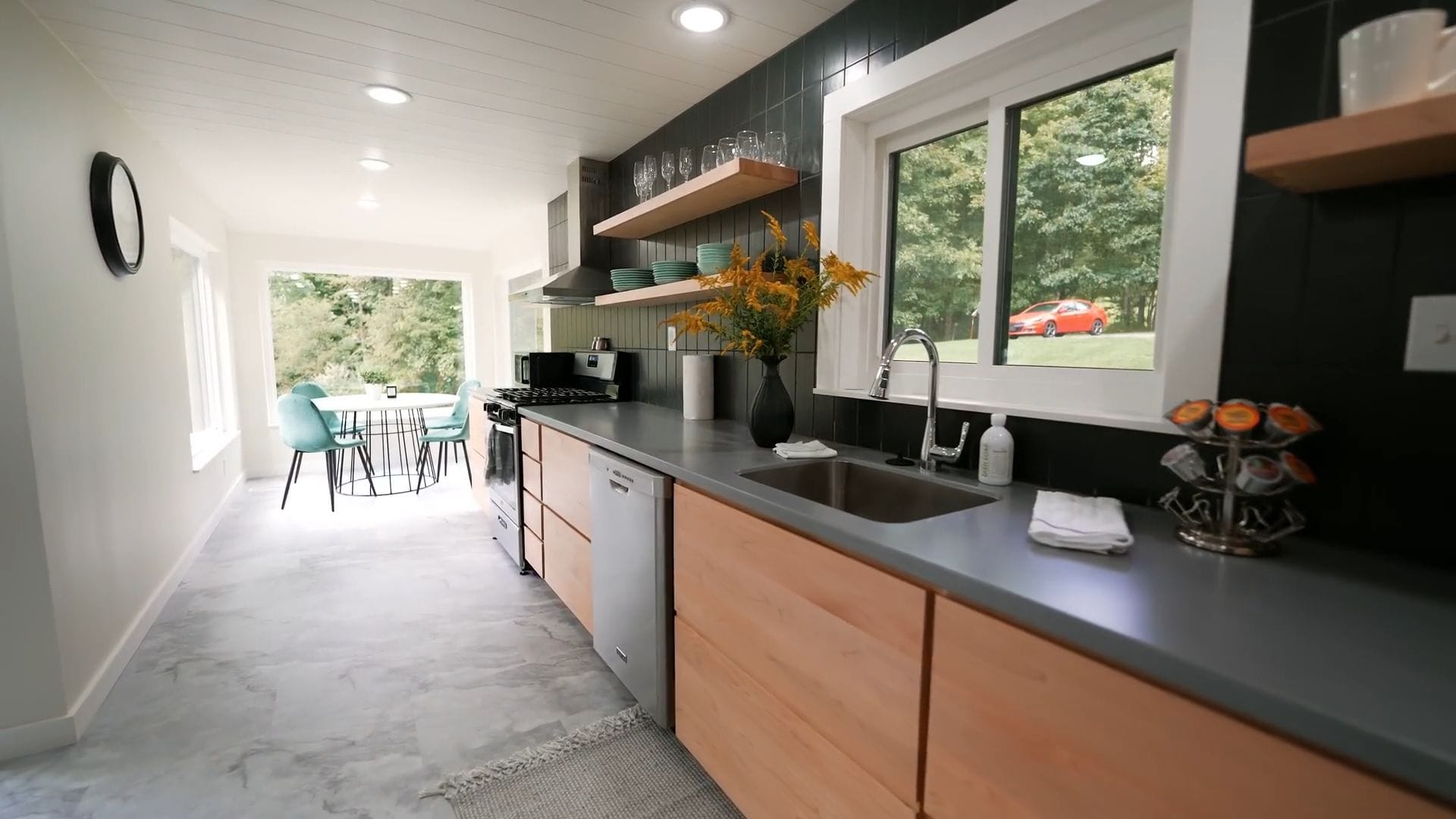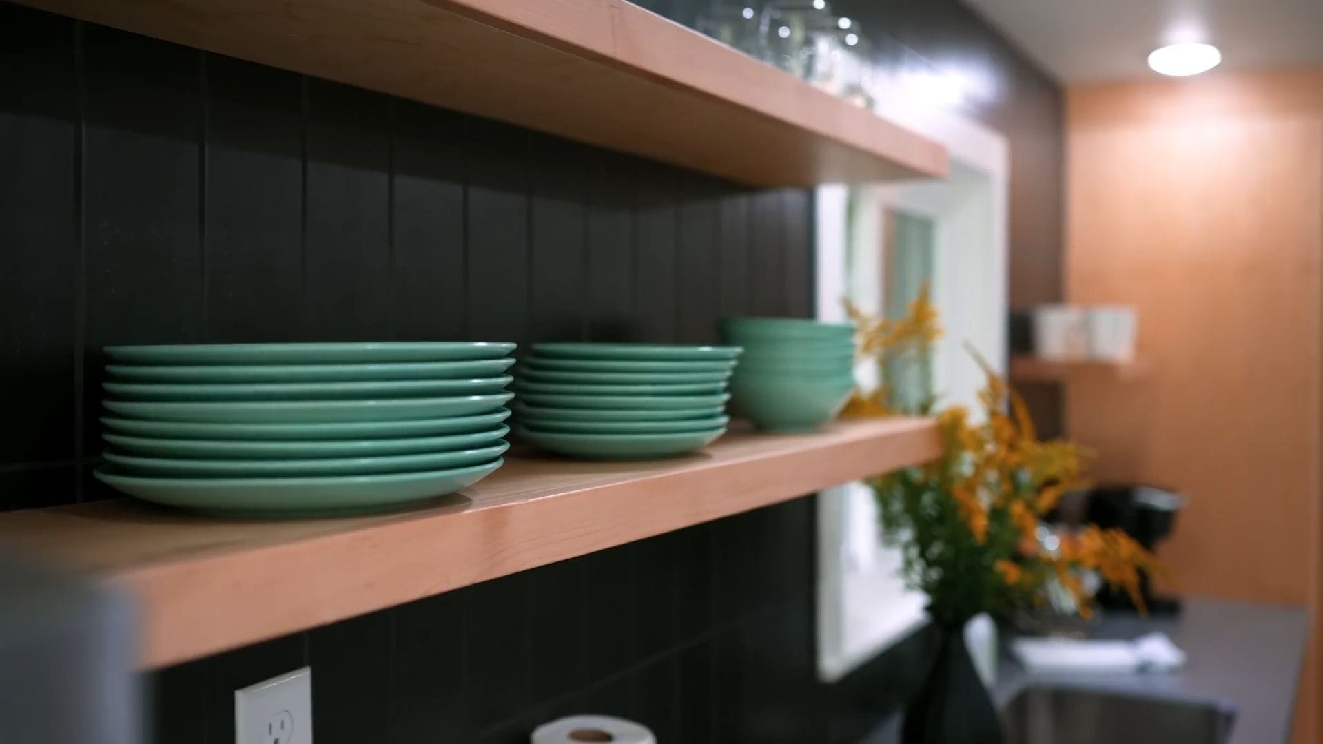 The vertical black backsplash tile adds a sophisticated design element that perfectly complements the floating shelves displaying dishes and mugs above. A dedicated coffee station sits conveniently next to the sink, making your morning routine effortless and enjoyable.