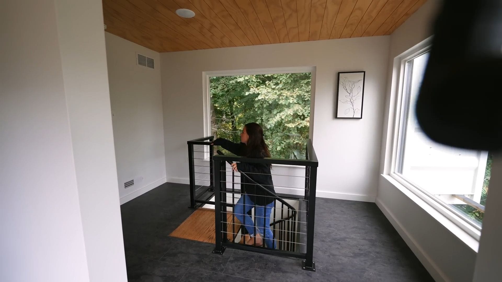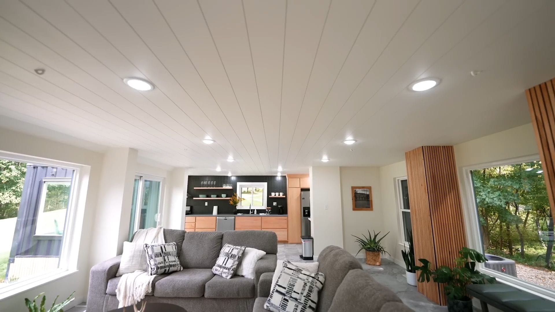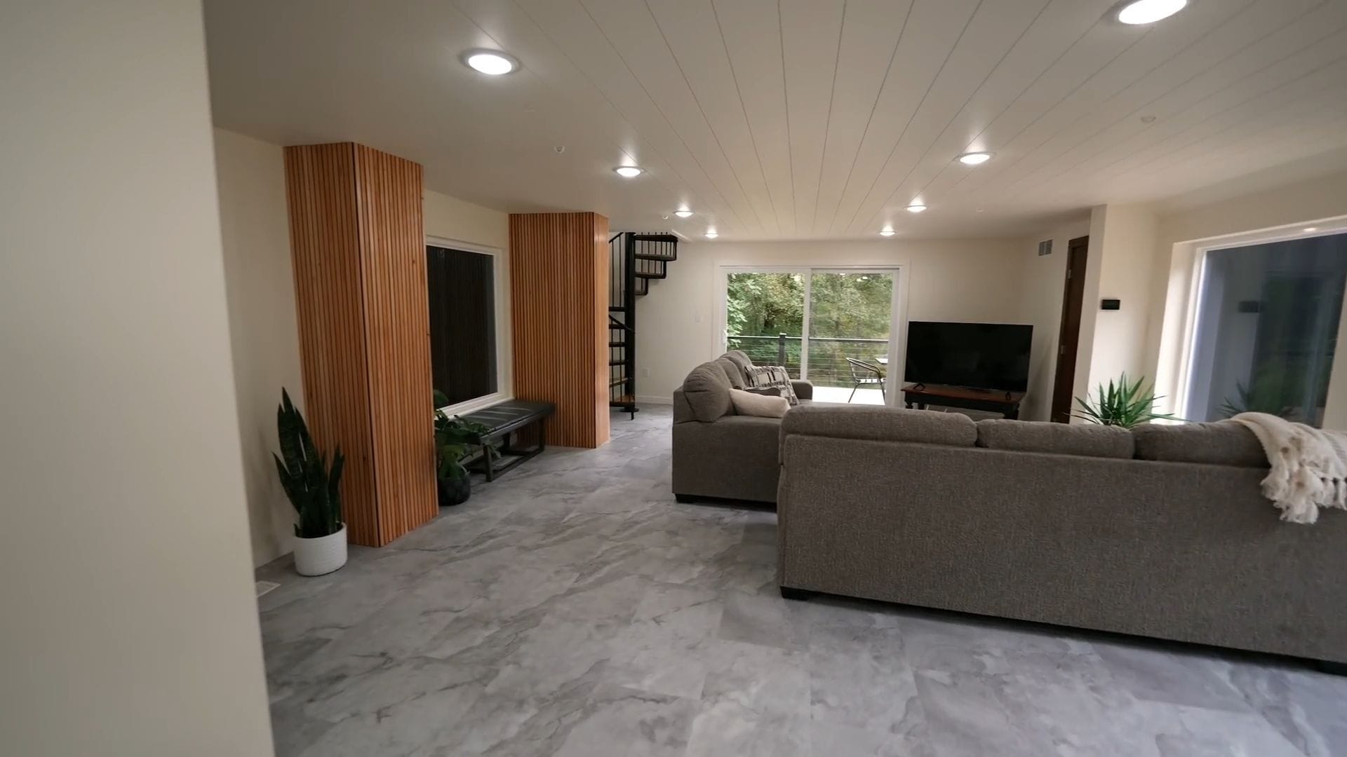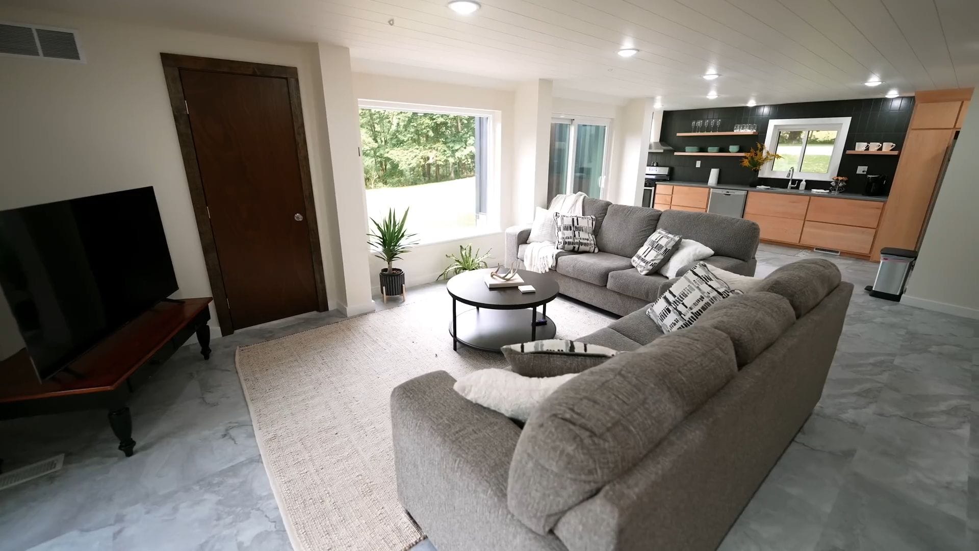 The living room occupies the majority of this lower level, featuring two comfortable gray couches positioned to take full advantage of those massive windows while facing a mounted television. This arrangement creates the perfect environment for cozy movie nights or simply relaxing while enjoying the views.