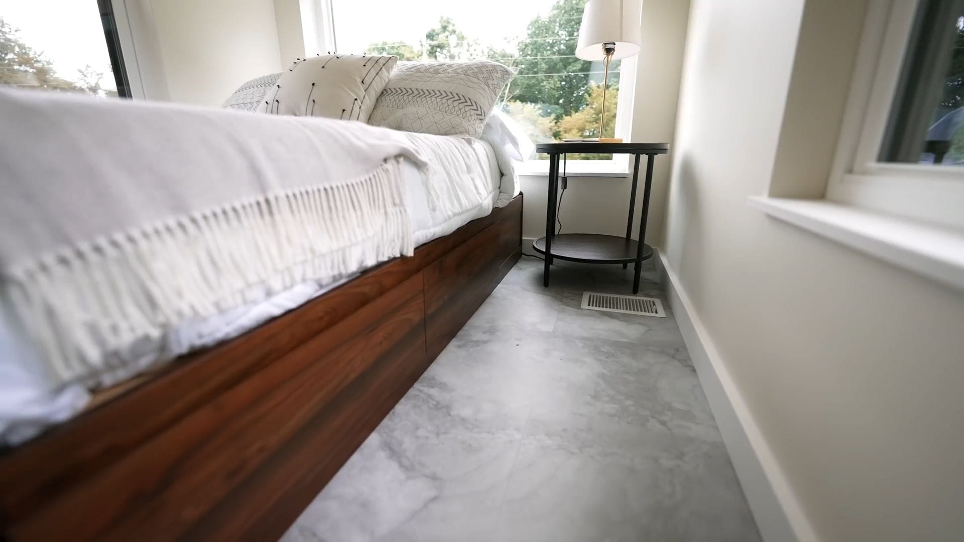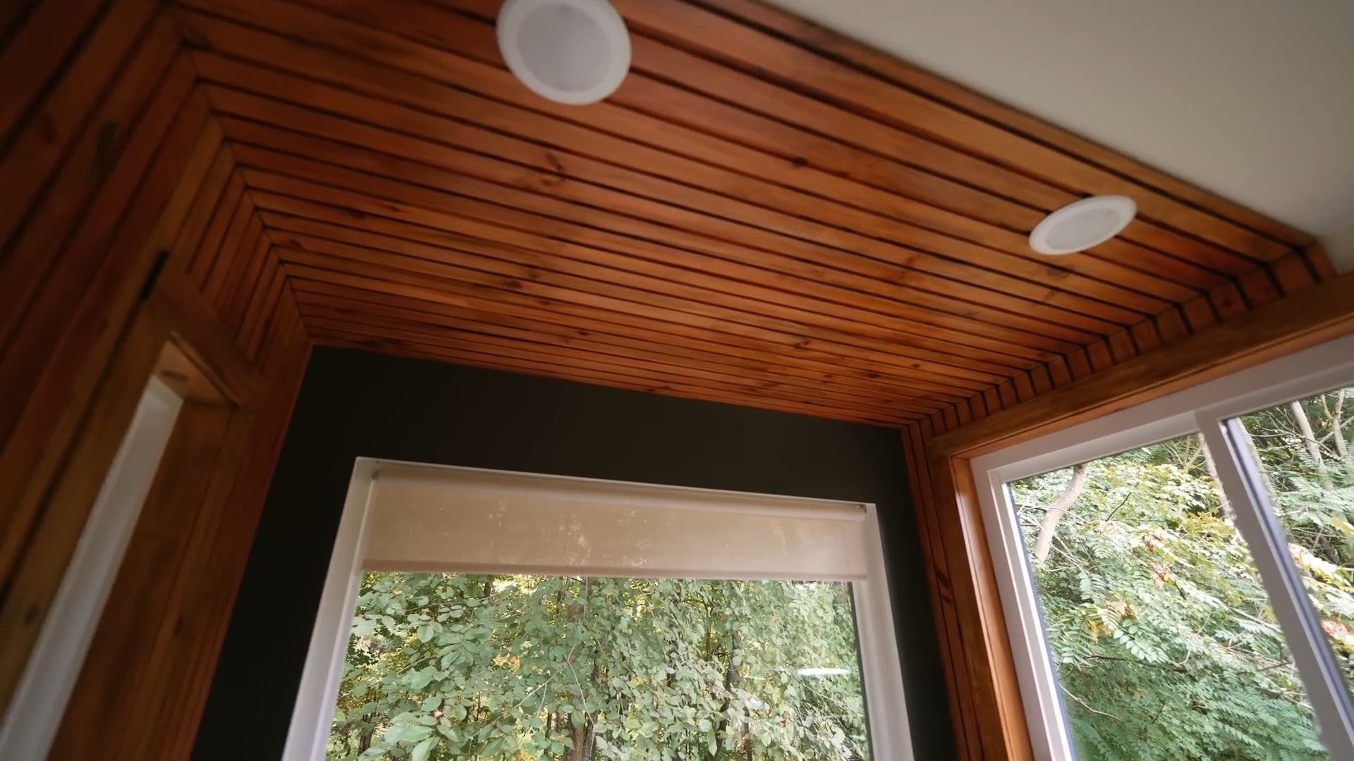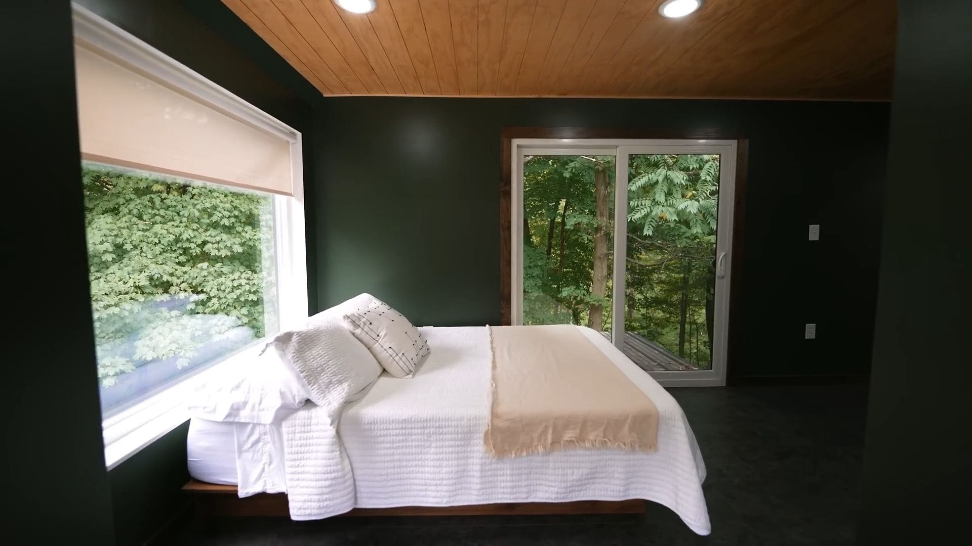 This bedroom showcases that same incredible 270-degree window arrangement, surrounding the bed with natural light and gorgeous views of the surrounding landscape.