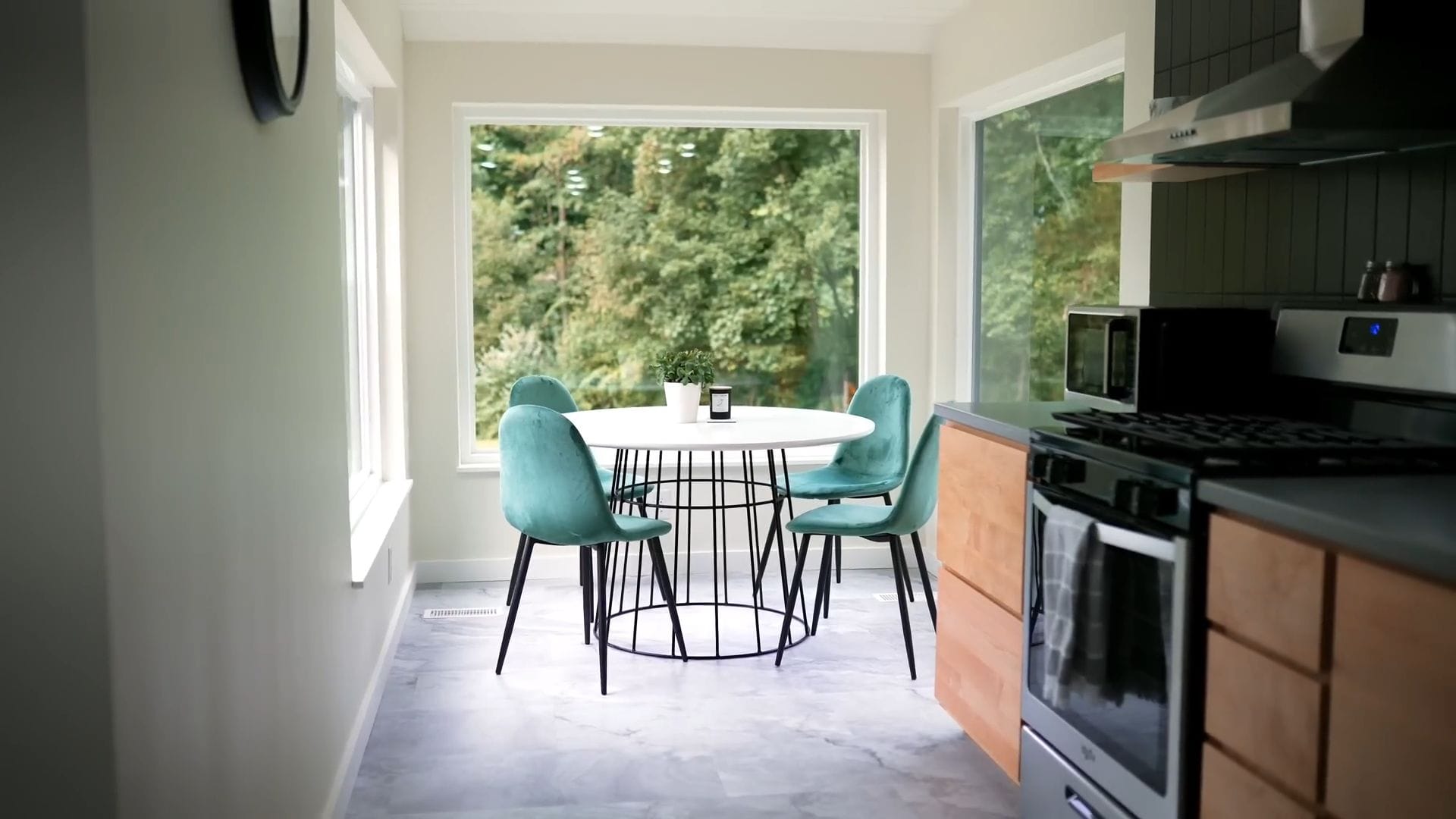 At the far end of the kitchen, the dining area enjoys an incredible 270-degree view through floor-to-ceiling windows that flood the space with natural light perfect for sunrise breakfasts or romantic sunset dinners.