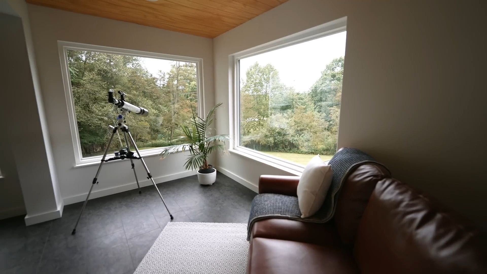The striking spiral staircase beckons us to explore the upper level, where the layout takes on a more intimate character. One side accommodates the staircase while the opposite side opens into a cozy retreat featuring comfortable seating and a telescope positioned at those huge windows for incredible stargazing opportunities.