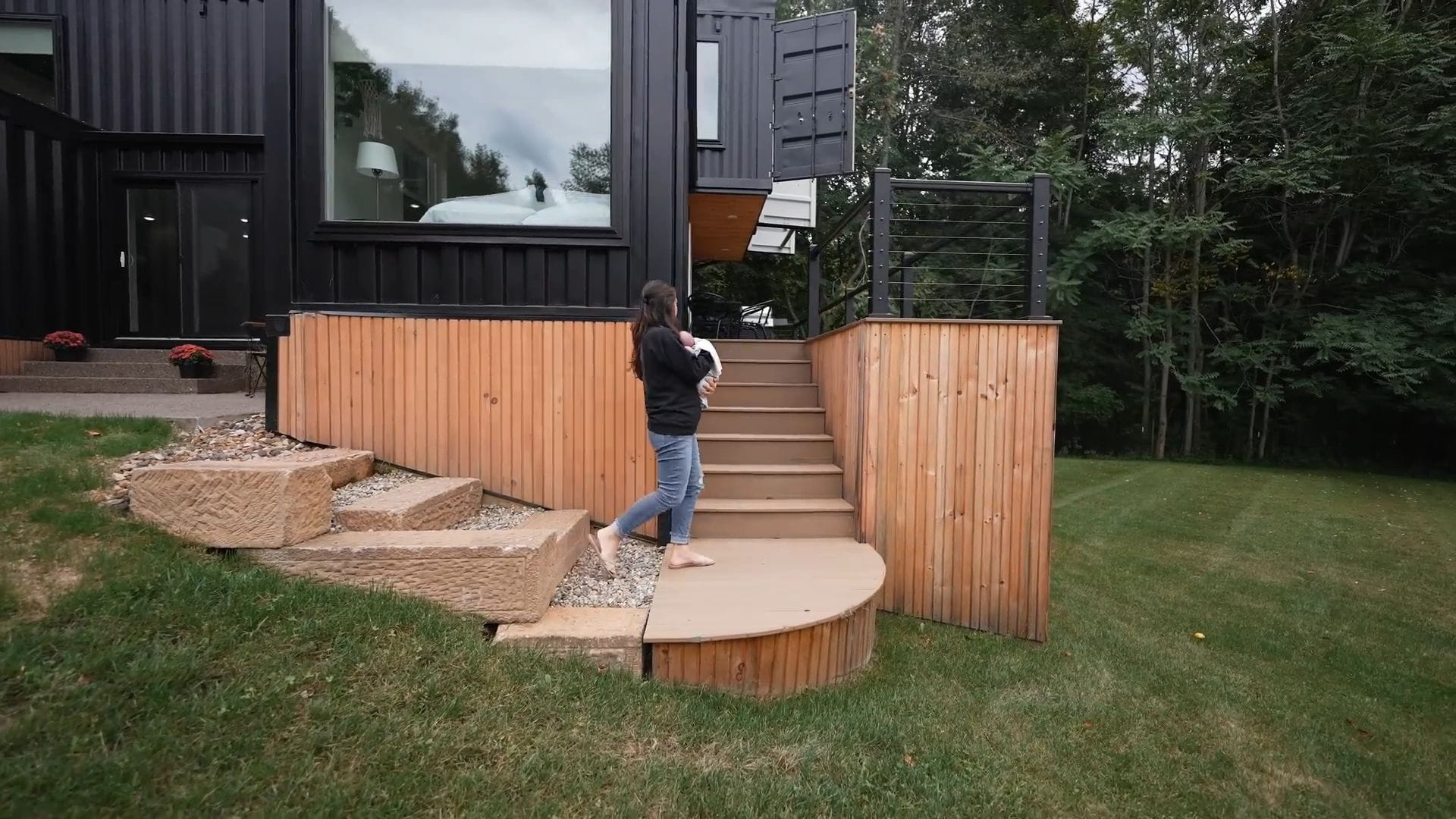 Stepping outside through the first set of sliding doors, we discover one of those clever pocket spaces created by the container arrangement. This intimate outdoor area features a small table perfect for morning coffee while connecting via a pathway to elevated deck space.