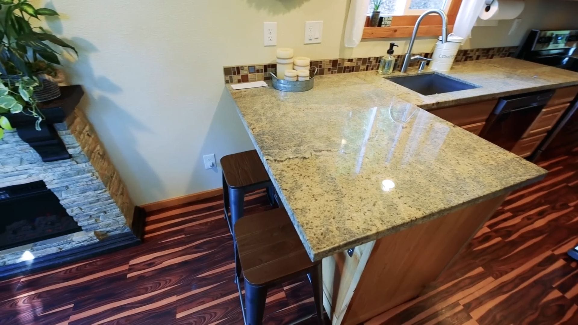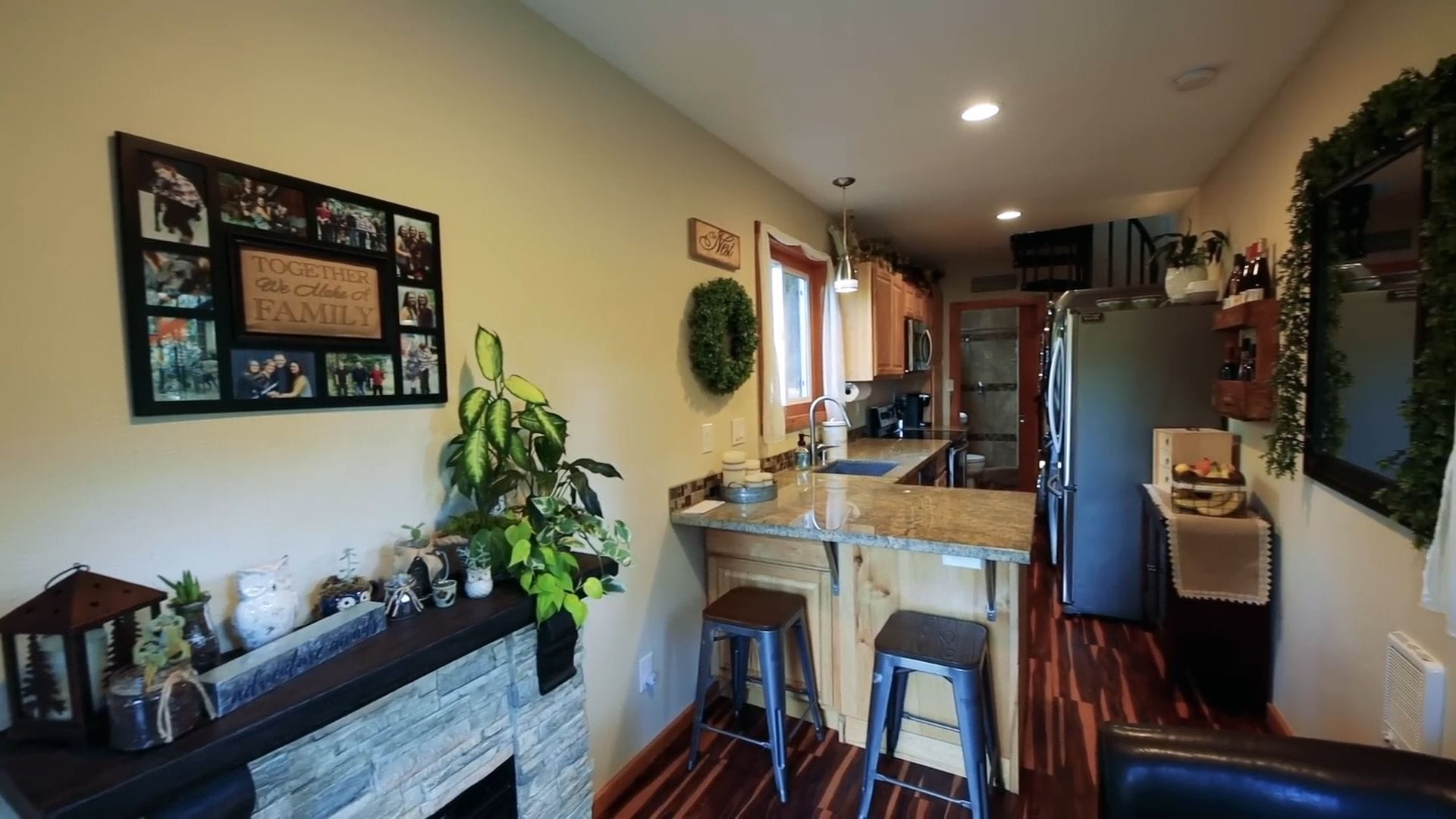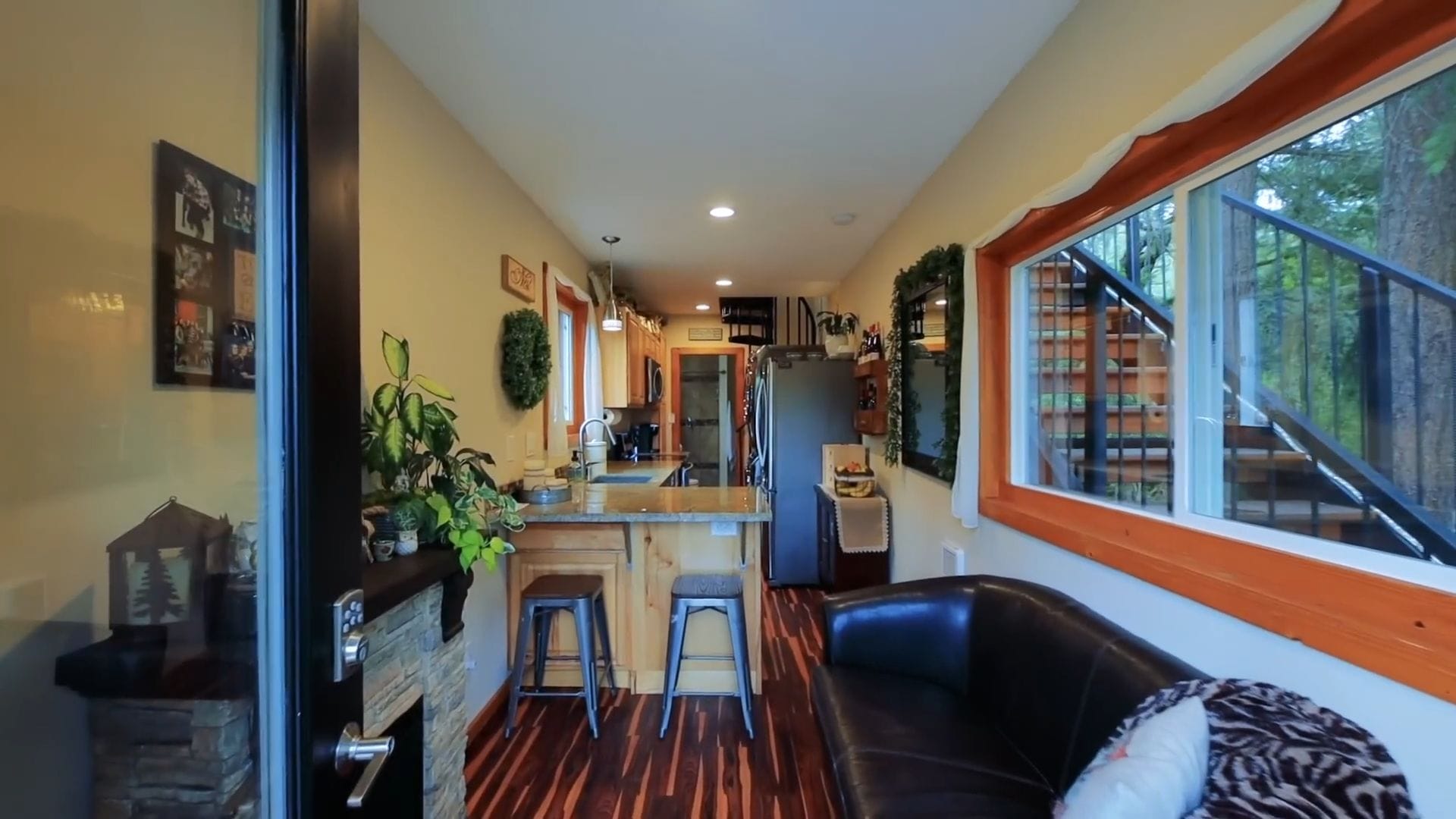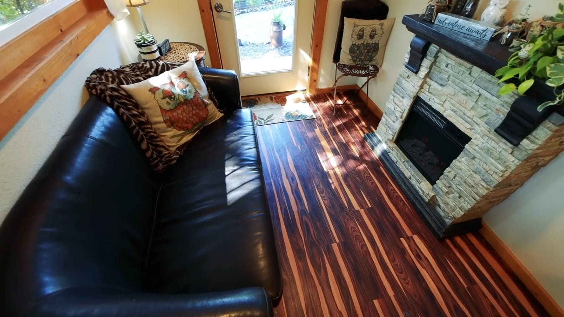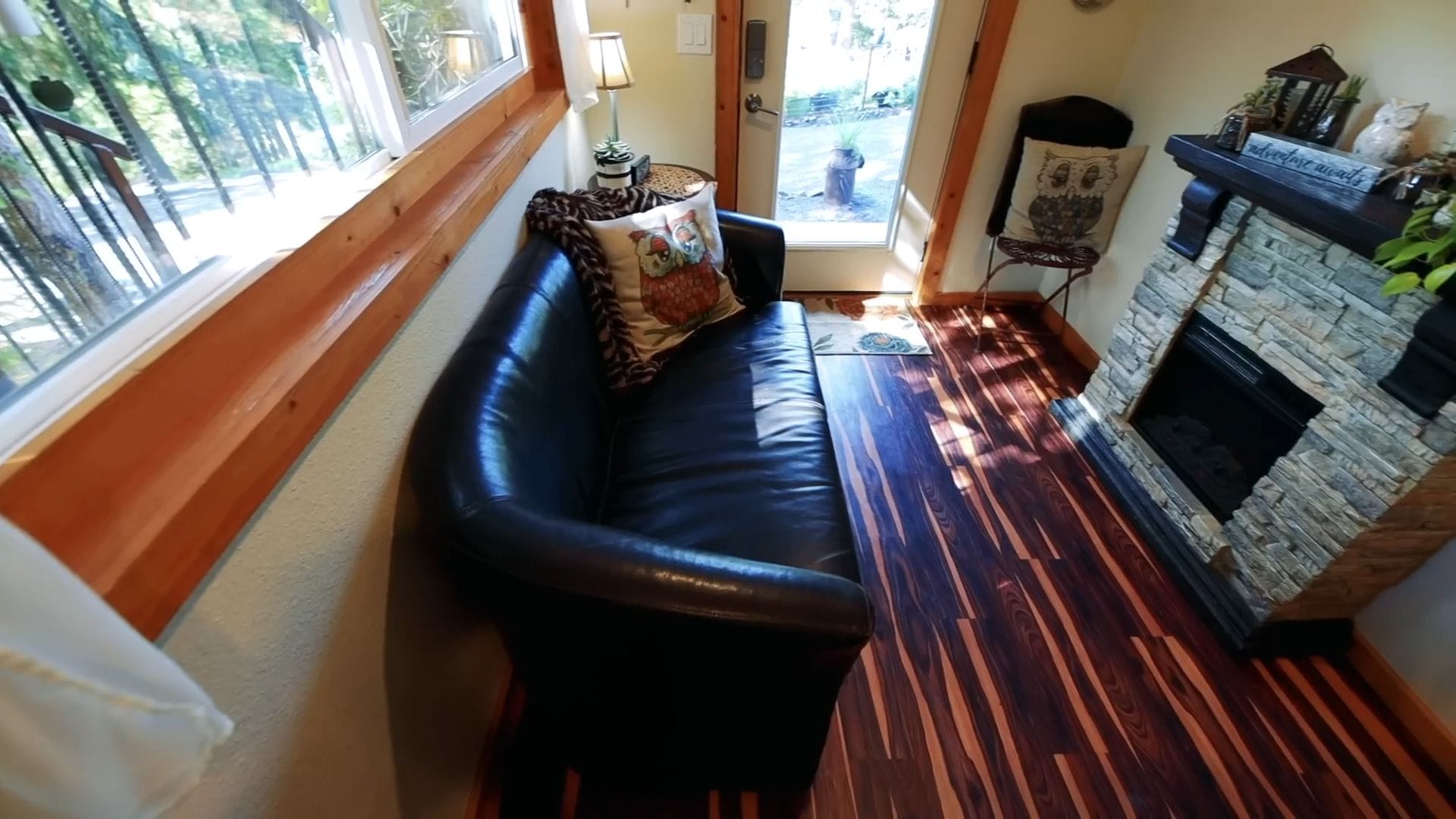 The living area showcases their smart decision to choose regular furniture over built-ins, creating a more contemporary and flexible feel. They spent considerable time measuring and planning to find the perfect sectional that would fit their tiny space while still providing comfortable seating for relaxing by their cozy fireplace.
