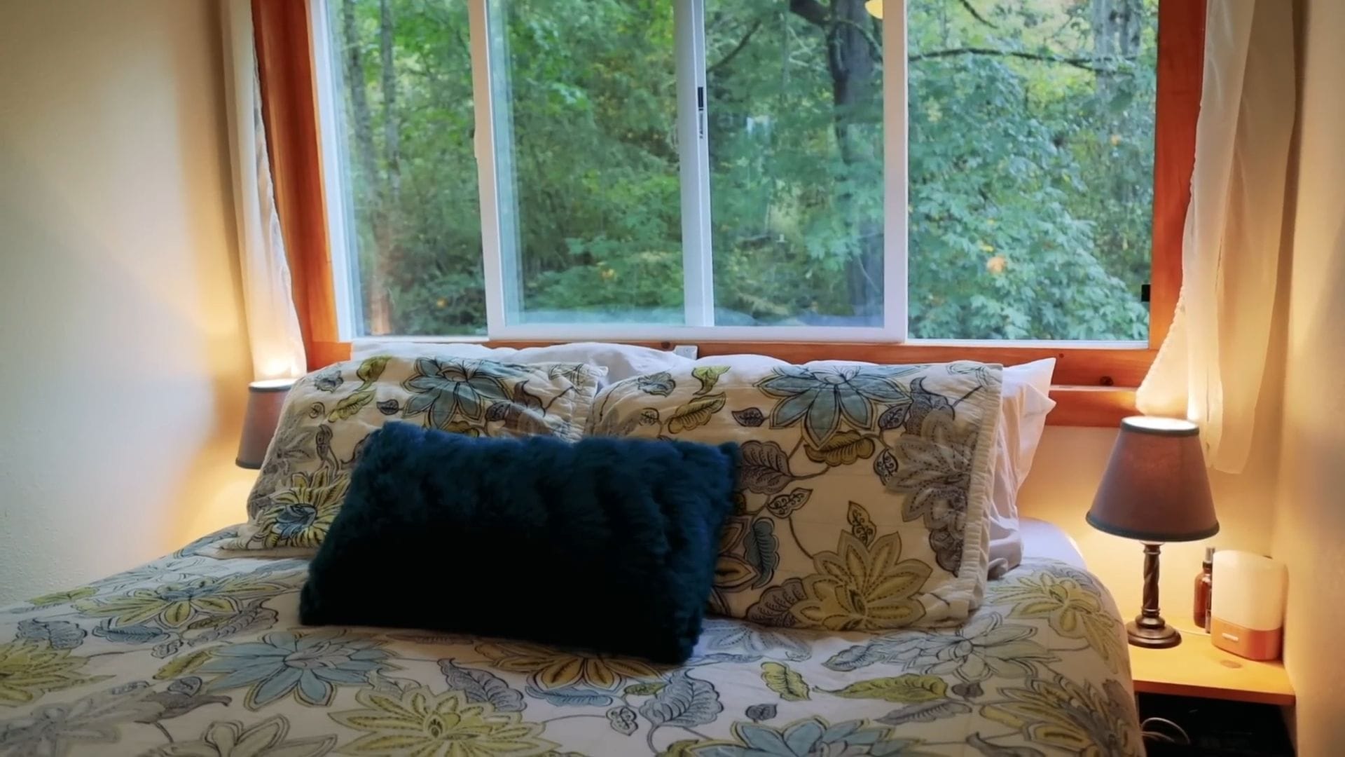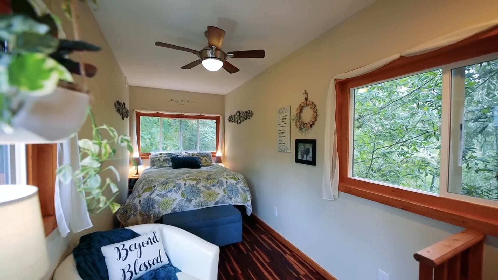 The bedroom windows frame beautiful views of their seasonal creek, providing the soothing sounds of running water during fall, winter, and spring months. A cozy reading nook with seating offers a quiet retreat, though the homeowners admit they spend most of their time outdoors exploring their property.