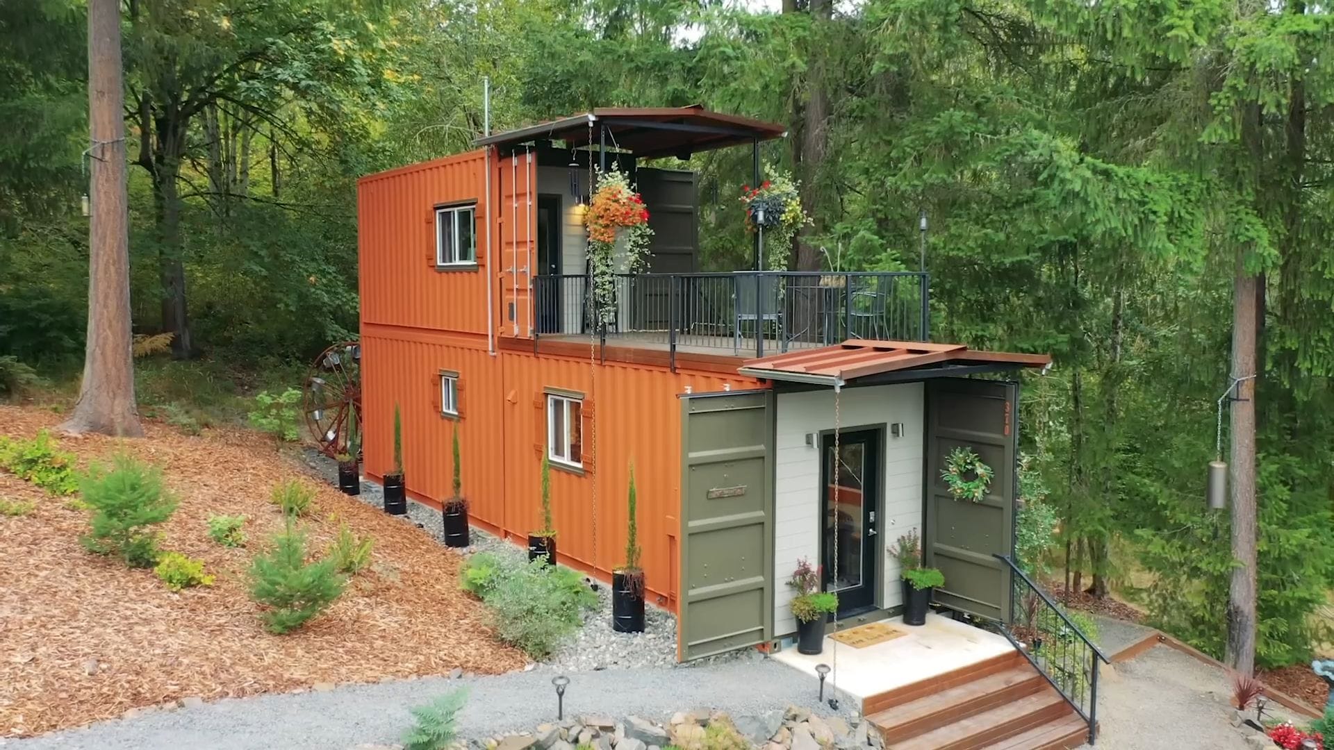 As we approach this striking two-story structure, the brilliant design immediately catches your eye with the smaller container stacked perfectly atop the larger one. The contrasting metal surfaces have weathered beautifully, blending harmoniously with the surrounding woodland setting.