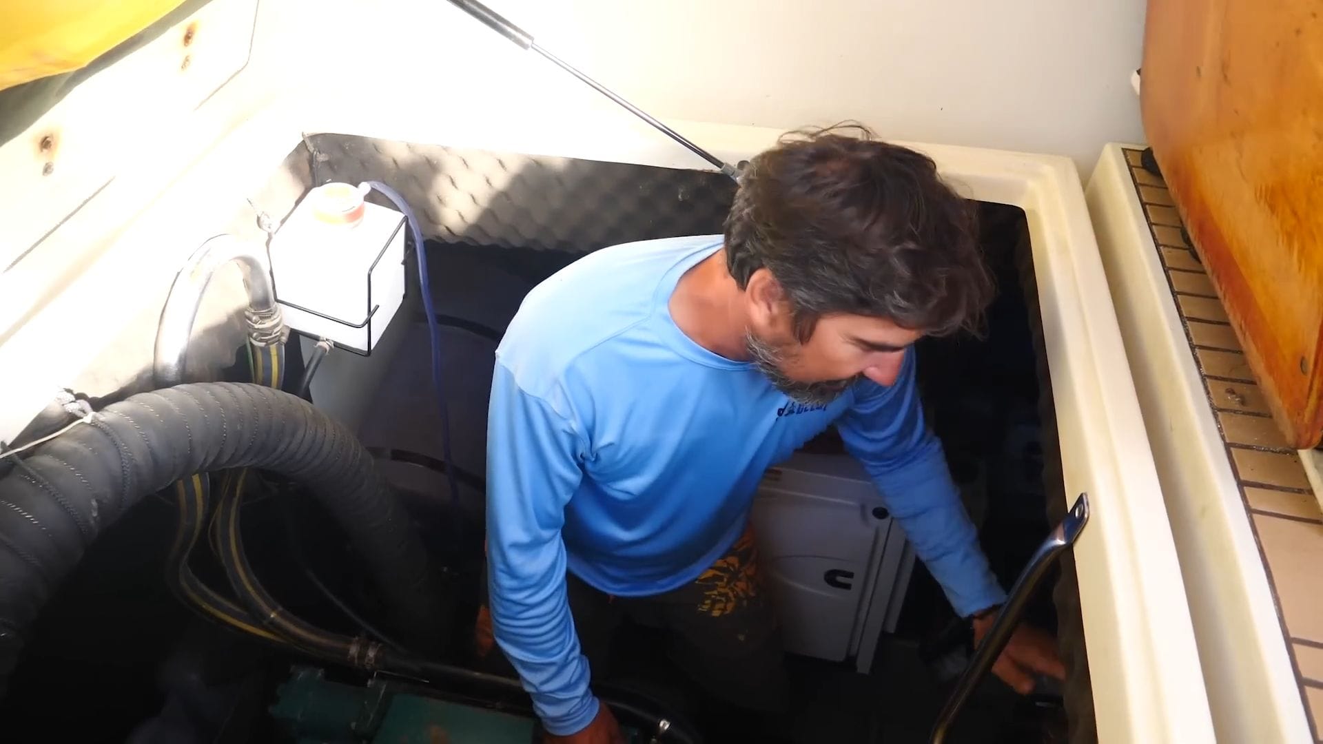The engine room reveals the true heart of their self-sufficiency, accessible through a watertight door in the cockpit floor. Here sits their main diesel engine, 8-kilowatt generator, hot water heater, and even a dive compressor for filling scuba tanks completely independently.