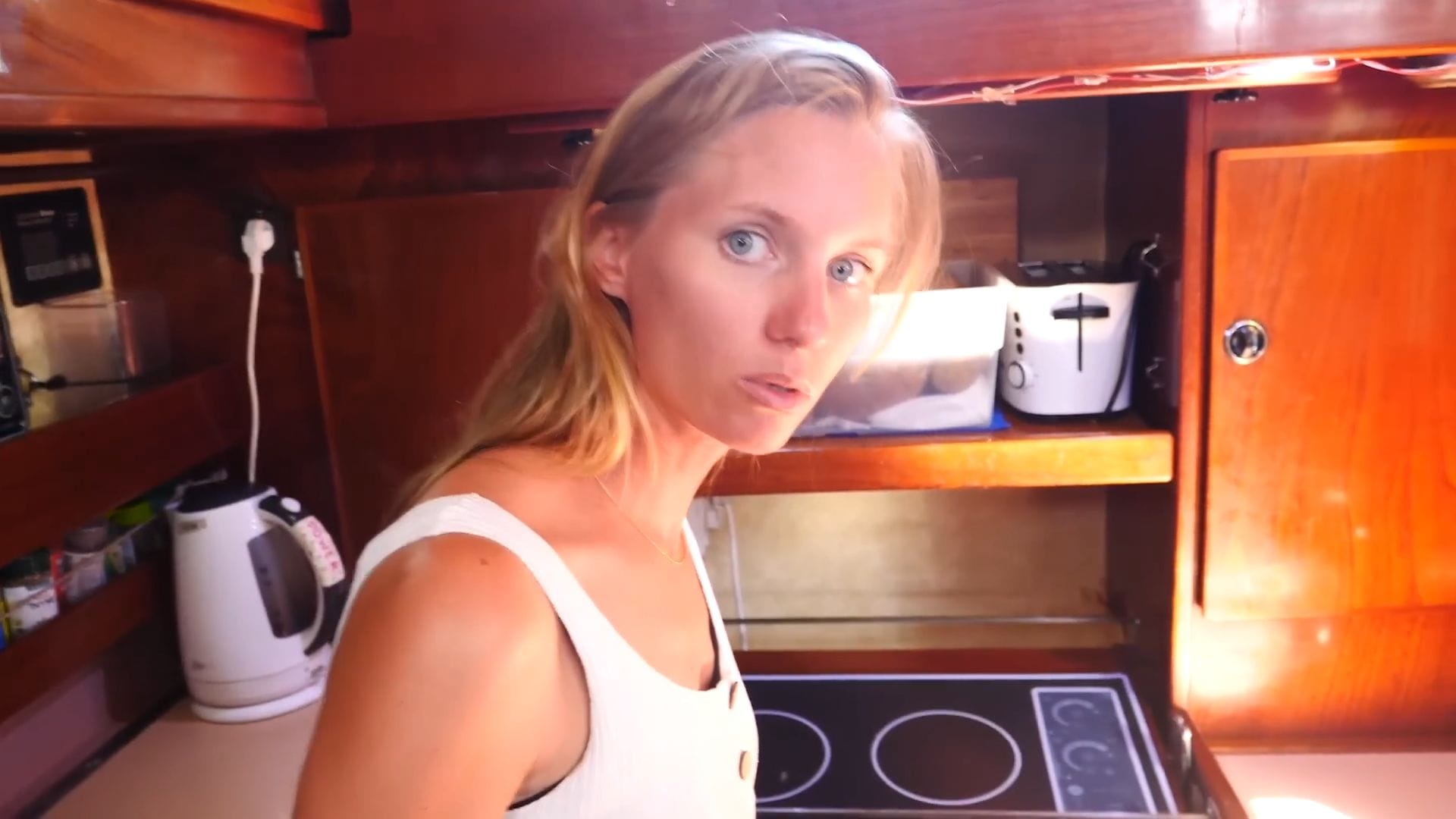 Step down into their galley, and you’ll immediately notice this is designed as a true one-person kitchen, narrow enough that whoever’s cooking can brace themselves against both sides during rough seas. The induction stovetop sits on a sophisticated gimbal system, swinging freely as the boat heels so dinner never ends up on the floor.