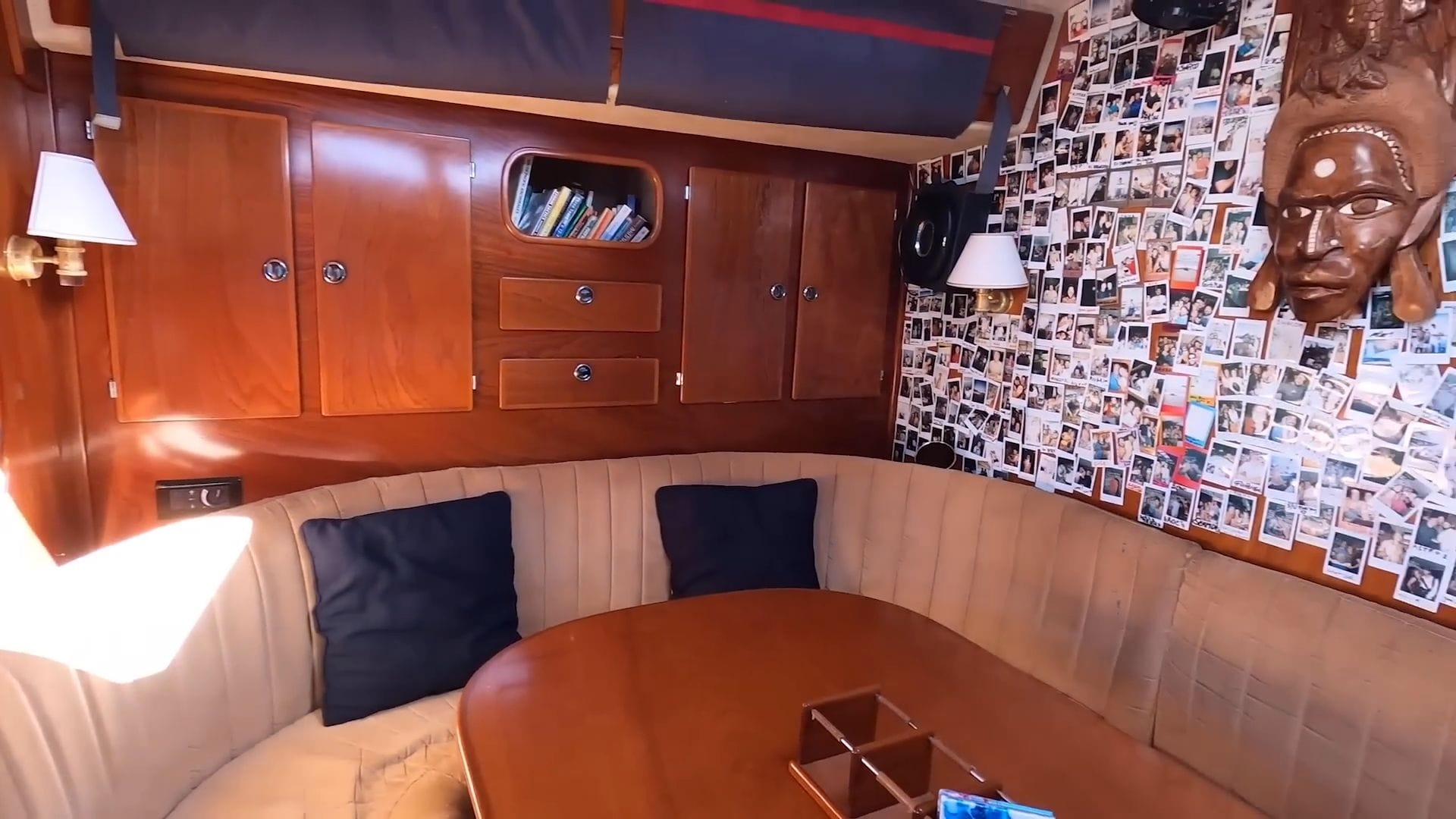 Each side of the sofa conceals deep freezer compartments, currently running a bit low since they haven’t provisioned in about a month, but essential for storing large fish catches and long-term supplies. The port side has been converted into Sierra’s play area, complete with a custom playpen that keeps her safe while remaining part of the action.