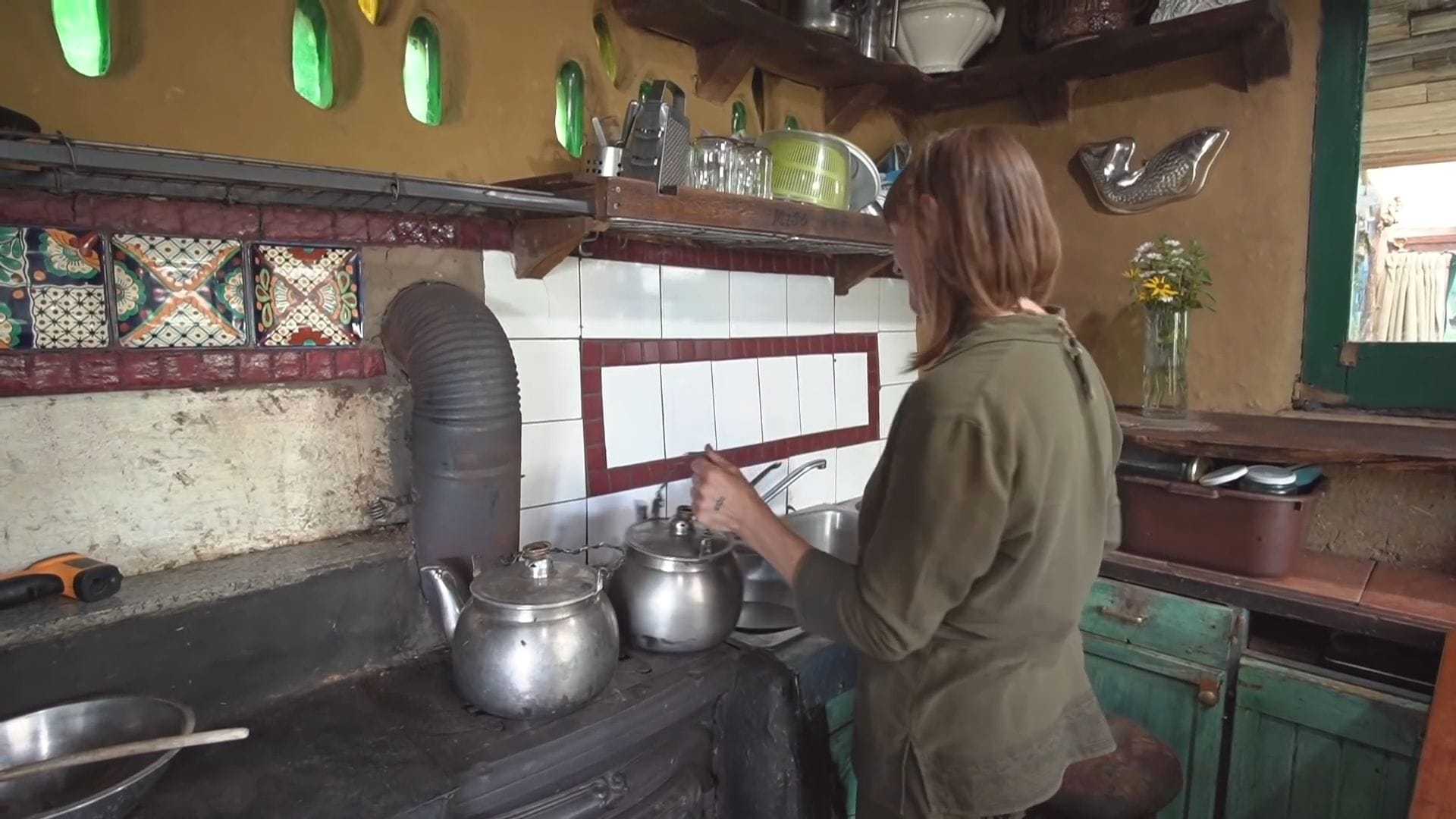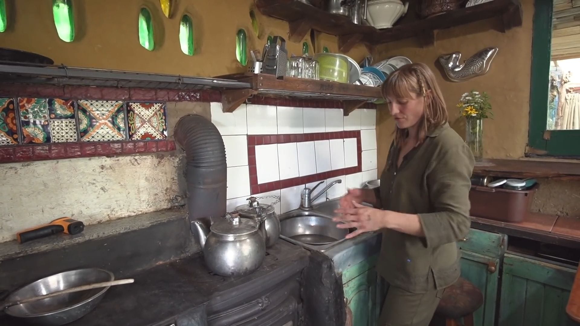 The positioning of the main dishwashing sink right beside the wood stove means hot water is always available and dishwashing becomes a cozy activity by the warm fire.