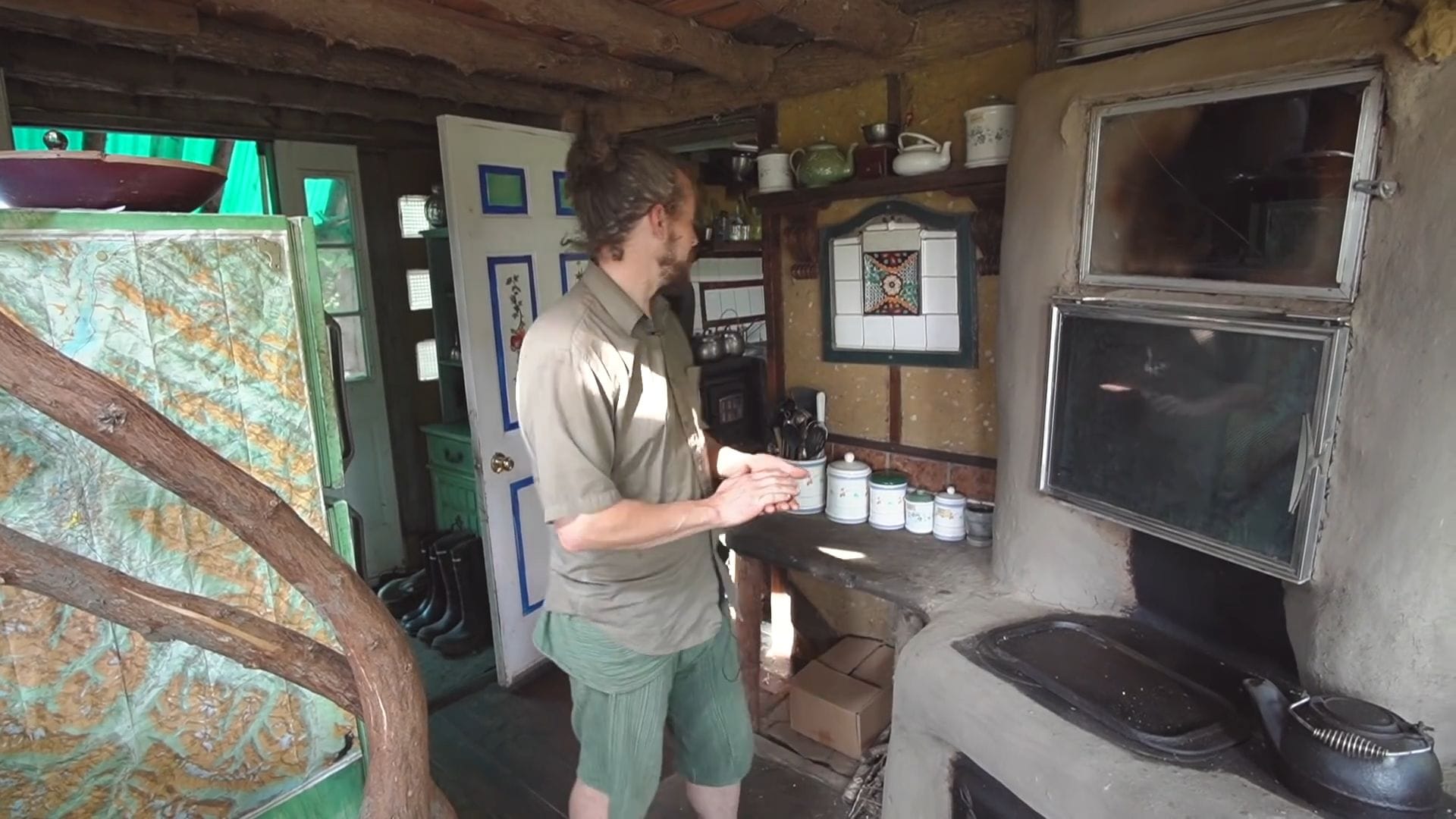The clever wood storage system beneath the stove uses heat from above to dry freshly collected wood, ensuring they always have dry fuel ready even when harvesting wood during ice storms.