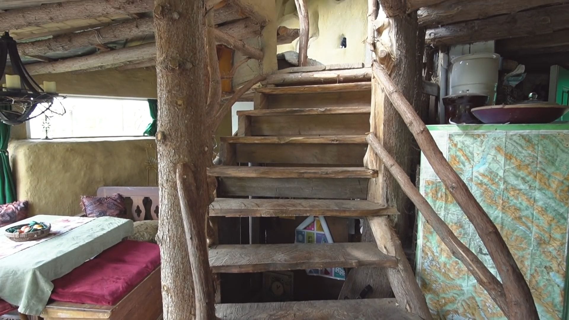 The custom staircase wrapping around this central tree demonstrates incredible craftsmanship, with each board hand-cut from cedar logs using just a chainsaw and square.