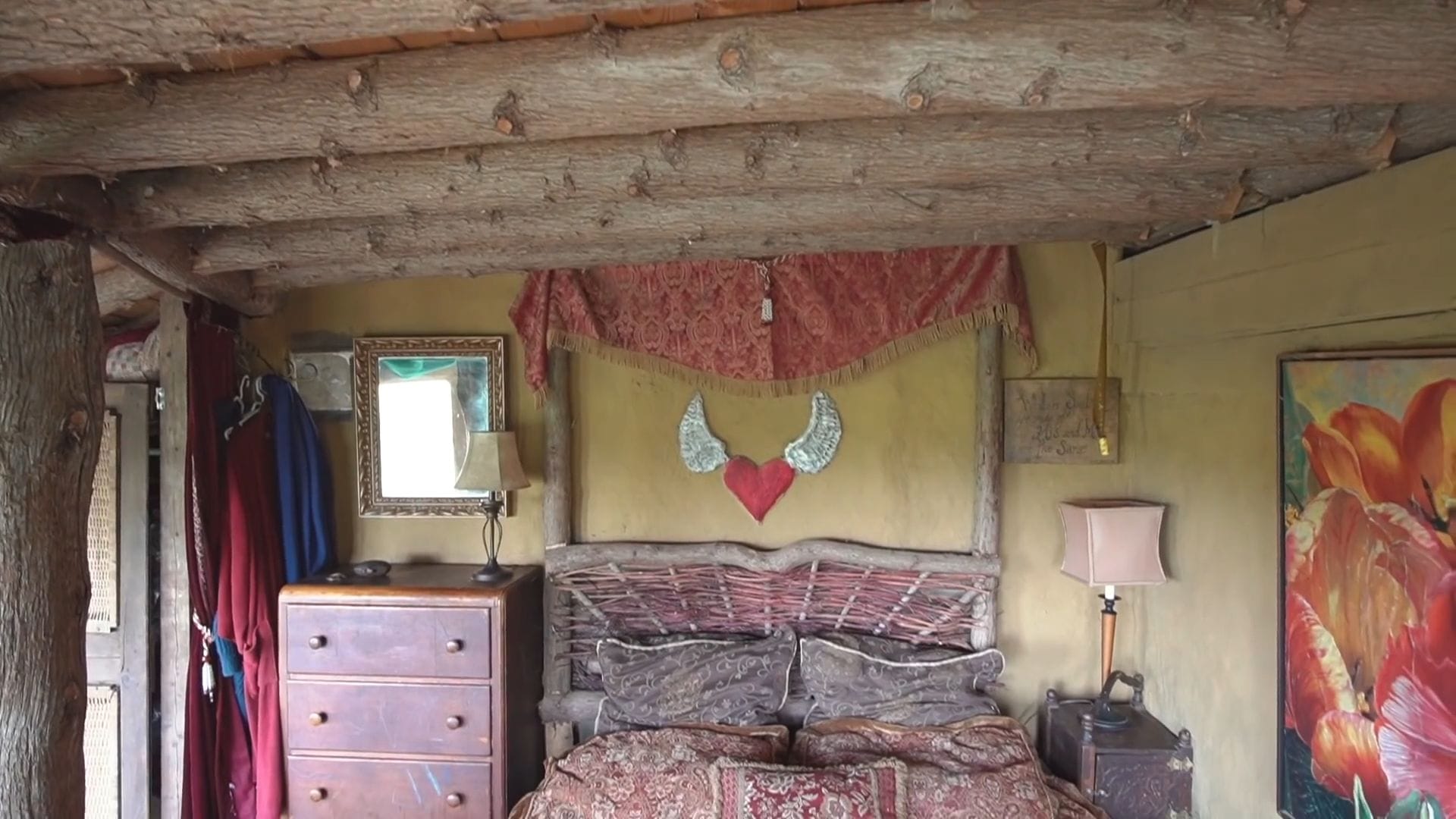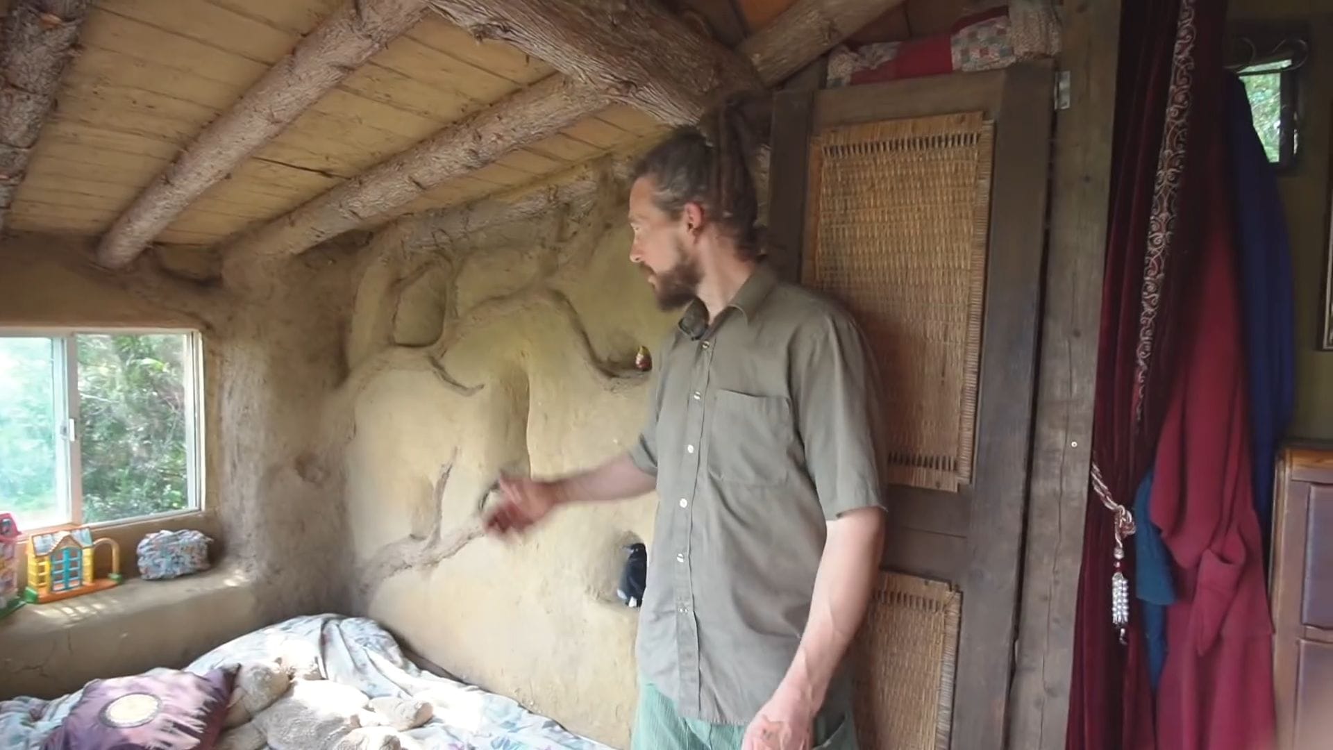 The master bedroom showcases beautiful waddle work, where vertical posts are woven with natural materials and then plastered over to create stunning textured walls.