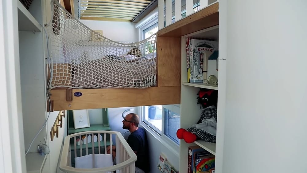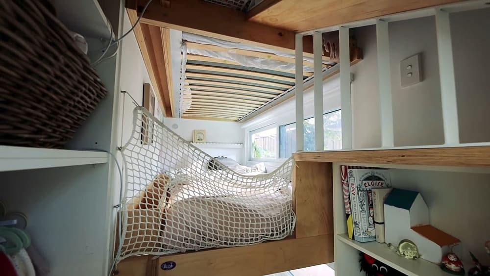 Inside the girls’ room, vertical space creates three distinct levels within a footprint that would typically accommodate only a single bed. The bottom level currently serves as baby Frankie’s nursery, while two sleeping areas above will eventually become individual beds as the children grow.