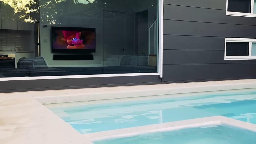 The television placement showcases the kind of creative problem-solving that defines this entire home – positioned at the perfect height for viewing from both indoor seating and the swimming pool itself. During construction, Dan could be found sitting in the half-built pool, carefully calculating angles and heights to ensure the setup would work perfectly for poolside movie nights.