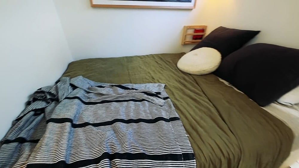 The master bedroom demonstrates how custom solutions can provide more storage than much larger spaces. Built-in wardrobes extend to the ceiling, while a linen press and integrated laundry basket ensure everything has its designated place – crucial for maintaining order in a compact home.