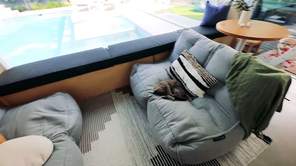 The design philosophy becomes crystal clear as we explore the outdoor spaces – this family wanted to spend as much time outside as possible, and every element supports that vision. Multiple seating areas flow seamlessly from the indoor kitchen through large sliding doors to outdoor dining spaces, cozy beanbag lounging areas, and a fire pit gathering spot.