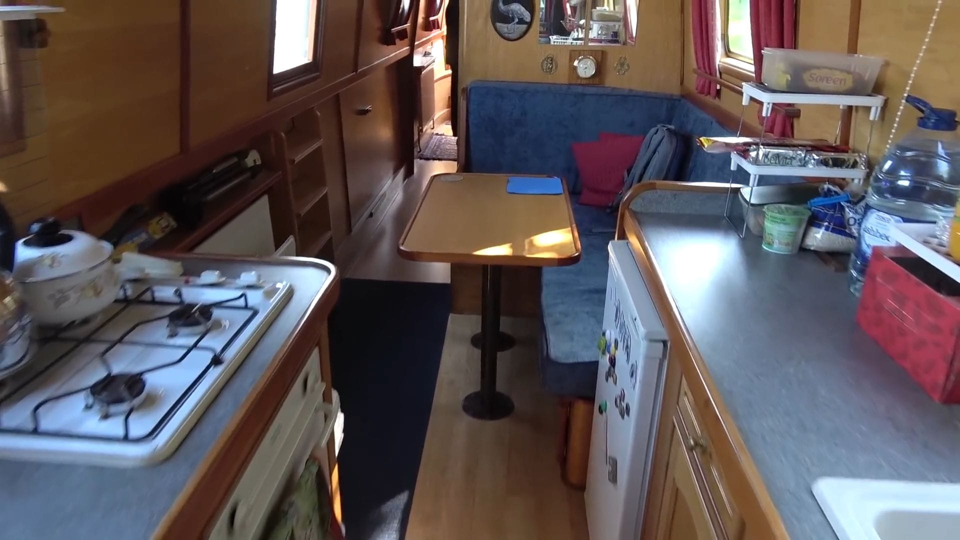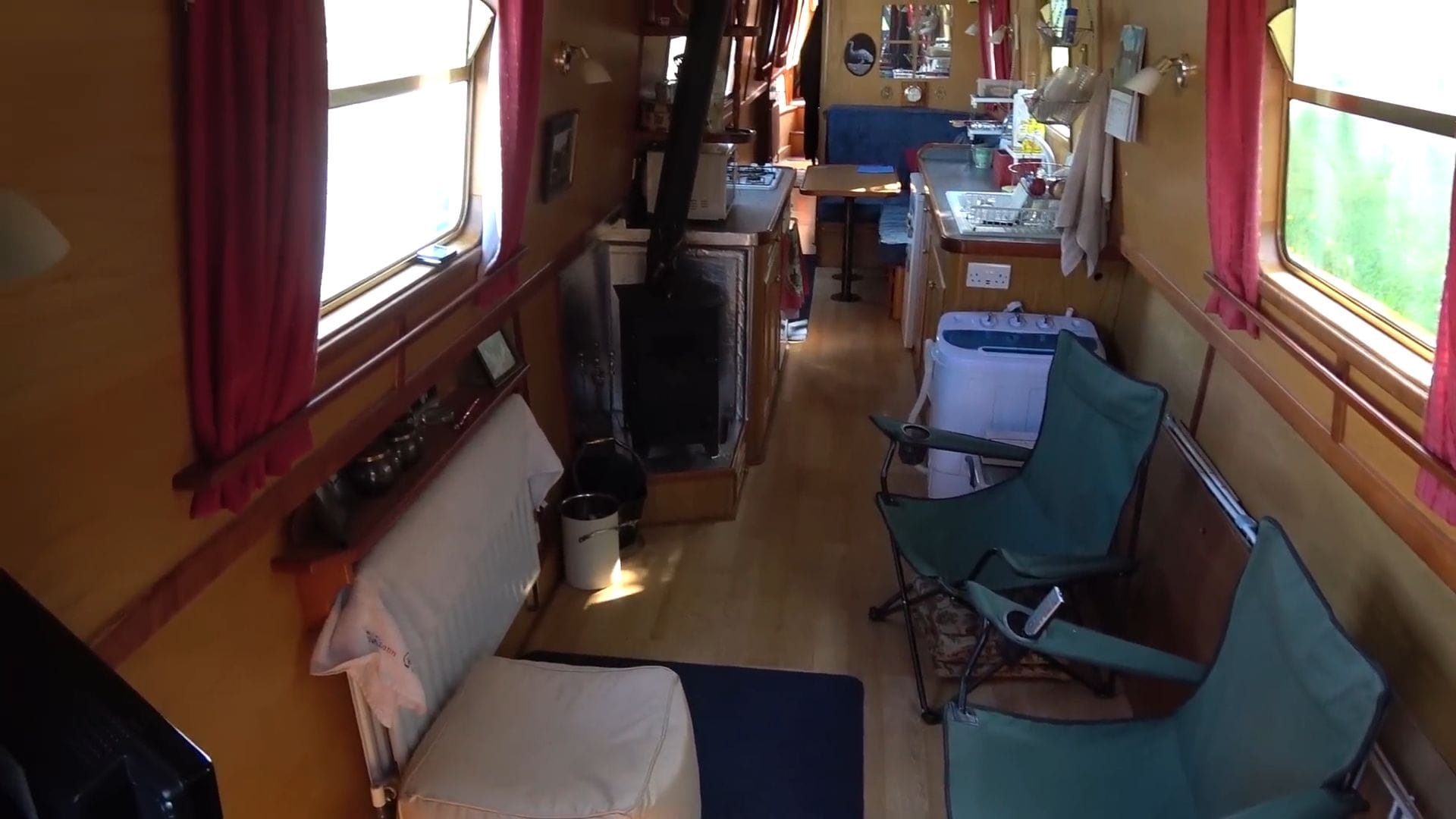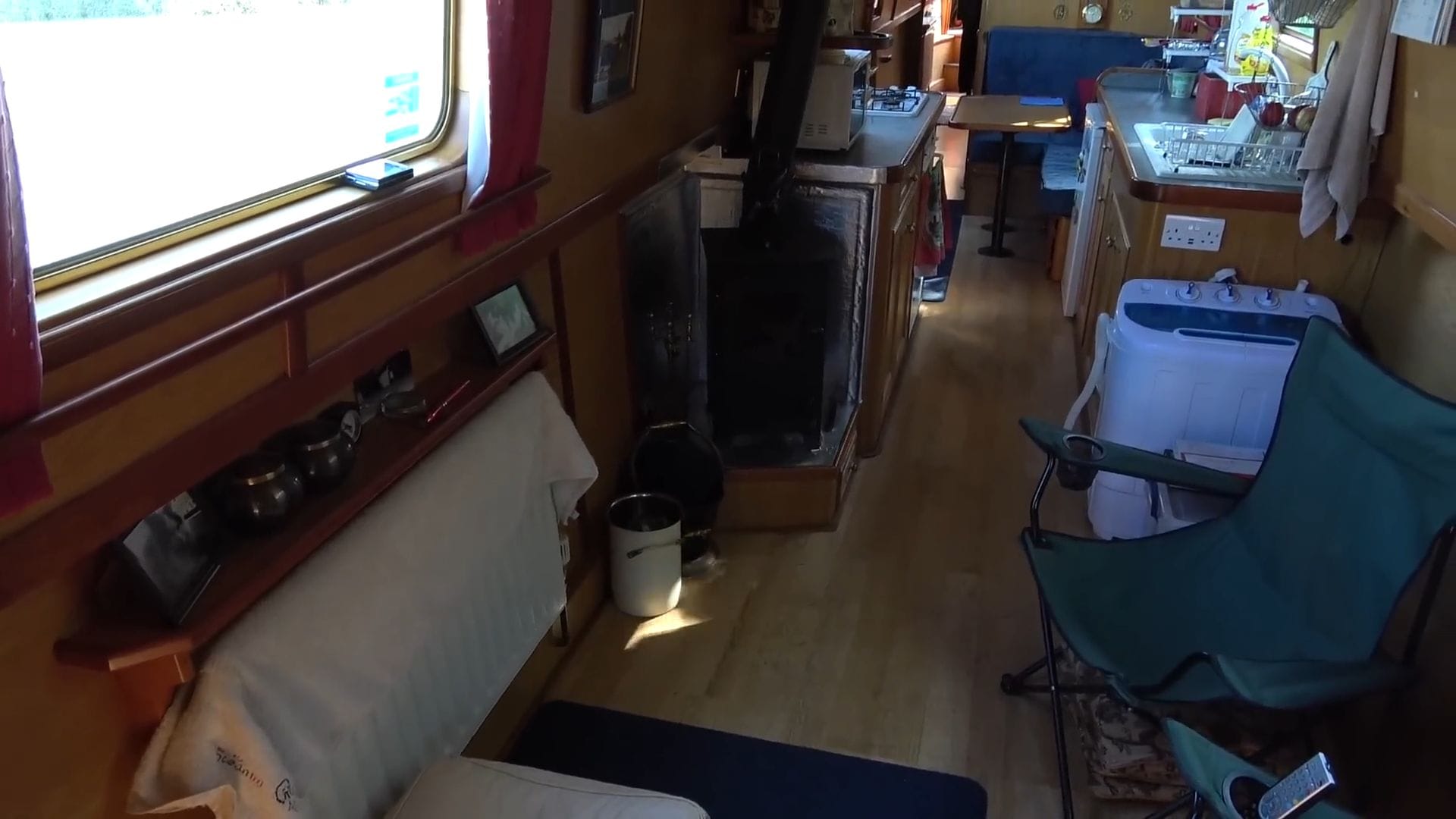 Descending through the steel and wood-paneled doors, we enter the spacious saloon that serves as the heart of this floating home. A small television sits positioned for comfortable viewing, while a diesel-fired radiator panel provides backup heating when needed.