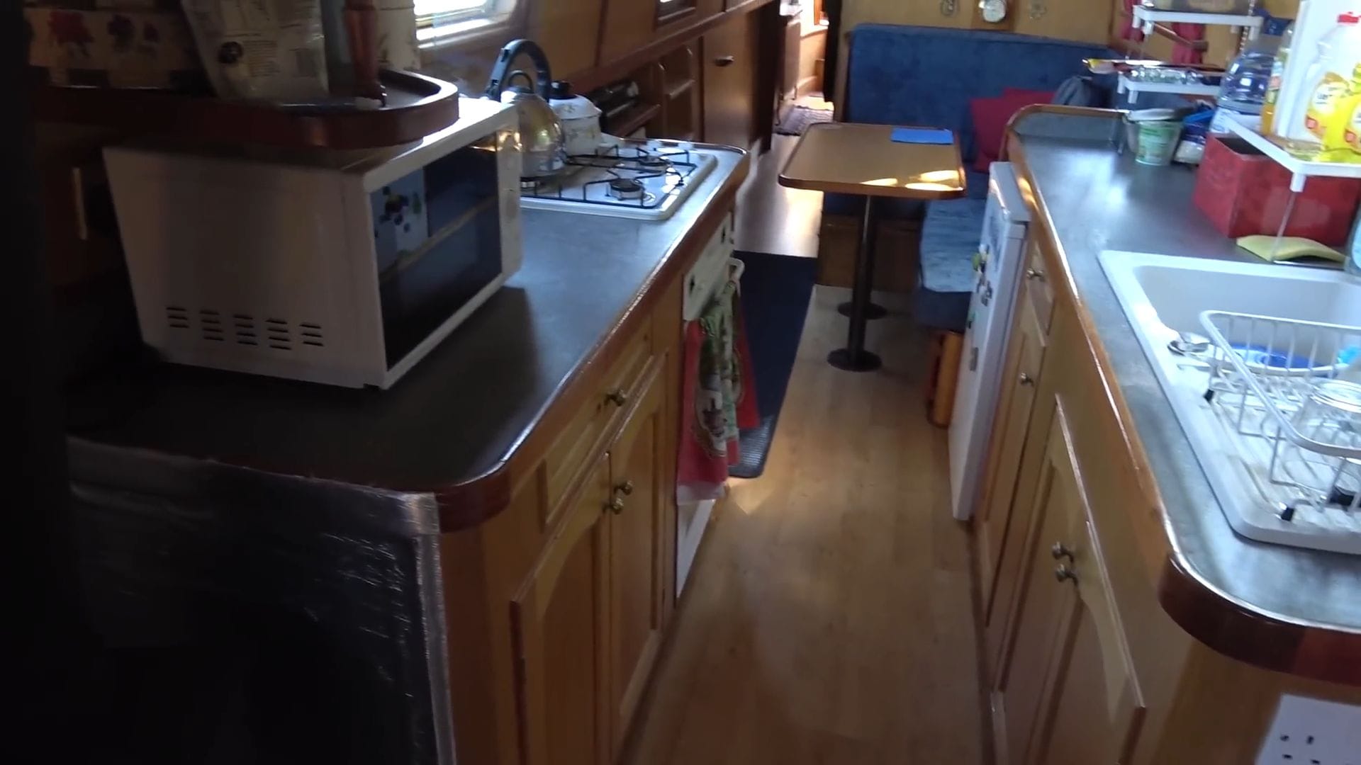 Additional cupboards line the corridor leading toward the boat’s private quarters, maximizing storage throughout the narrow space. The compact bathroom features a sink with storage above and below, plus a cassette toilet system that requires emptying every few days.