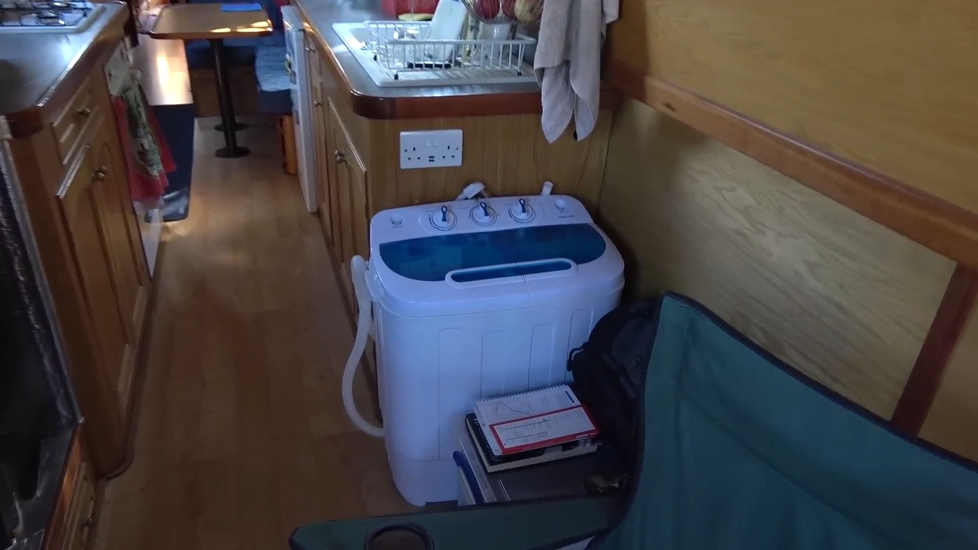 Built-in bookshelves line one wall, holding files and personal belongings alongside a convenient coat hook for daily essentials. Moving deeper into the boat, we discover a compact twin-tub washing machine perfectly sized for handling t-shirts, underwear, and other basic laundry needs.