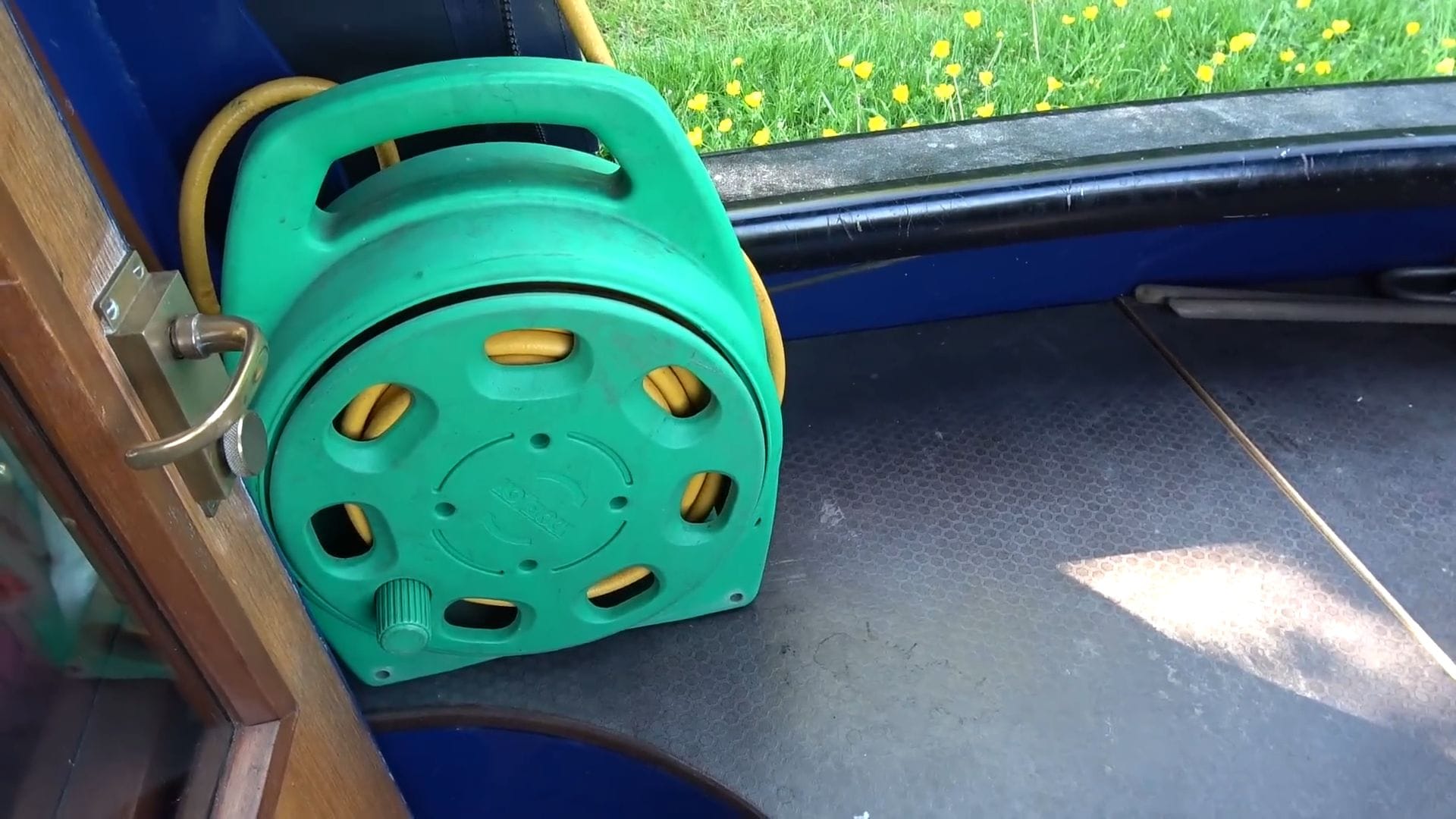 These comfortable deck seats cleverly double as storage units, hiding paint supplies, brushes, and other essentials beneath their cushioned surfaces. A standard garden hose coiled nearby connects to the boat’s 100-gallon water tank, providing fresh water for about ten days of solo living.