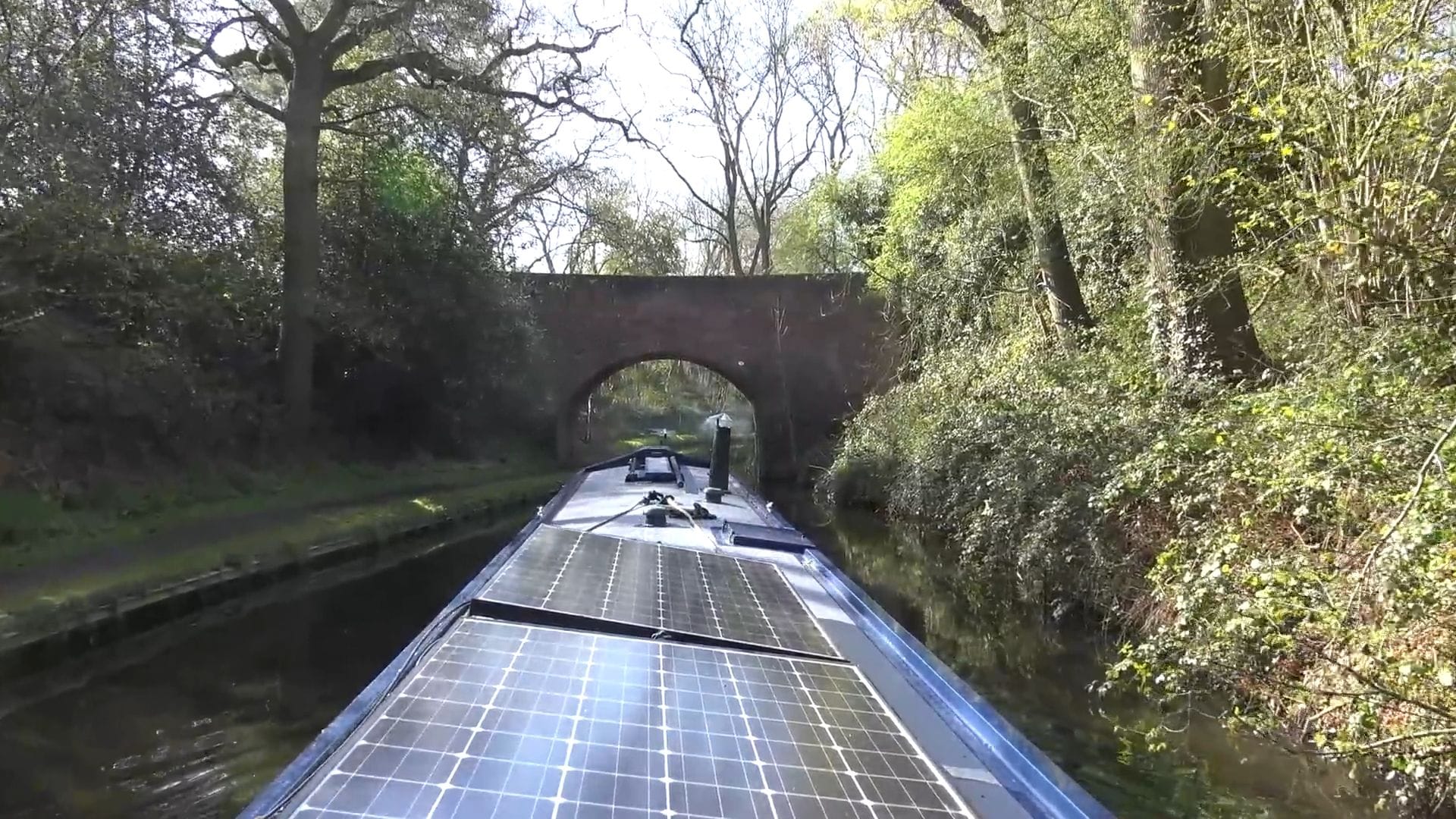 The brass tiller connects to the steering mechanism, providing traditional narrow boat navigation control from the stern deck. Two 240-watt solar panels mounted above supply virtually all electrical needs while silently charging the boat’s battery system.