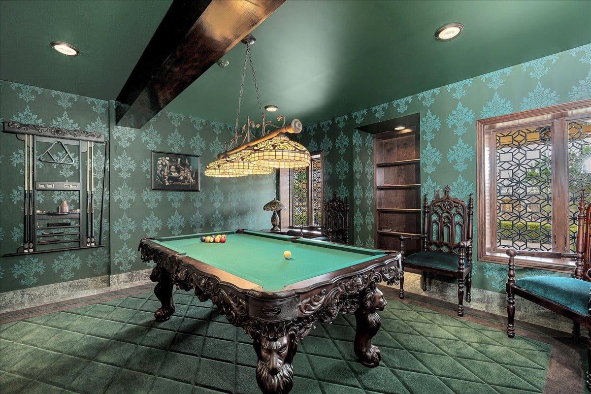 Emerald game room. Ceiling matches the wallpaper. That carved billiards table is wild.