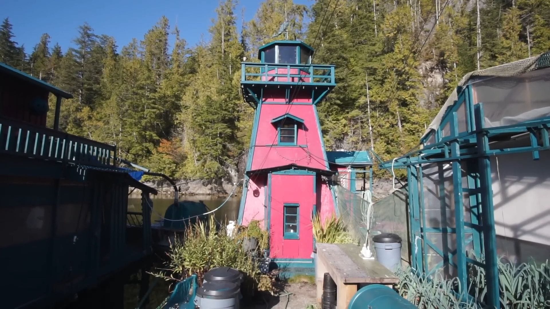 Two floating boat houses serve a practical purpose that’s essential on the rain-soaked west coast – eliminating the constant need to bail out boats while protecting the motors from harsh weather. The charming lighthouse building features an actual functioning light at the top and includes an extra shower for visiting family and friends.