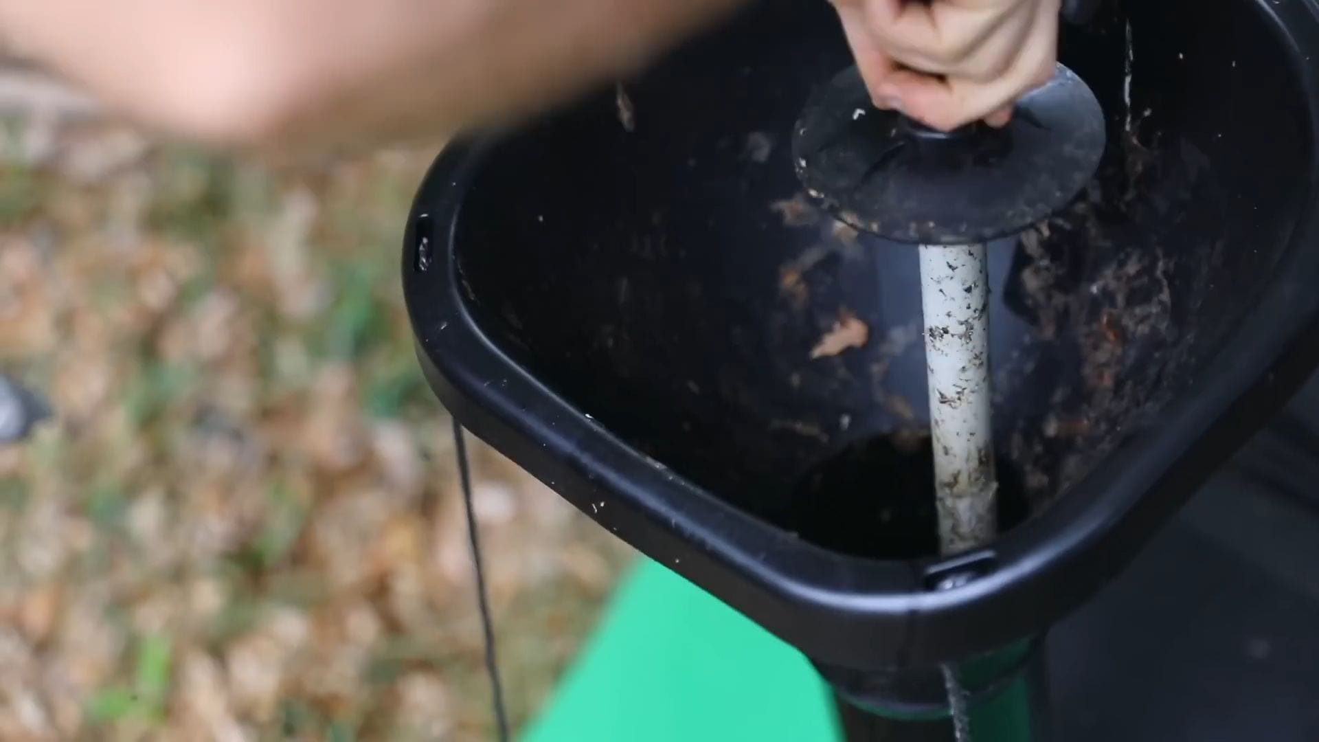 Solid waste gets covered with sawdust in a 5-gallon bucket system, then composted for a full year before being used as fertilizer for fruit trees.