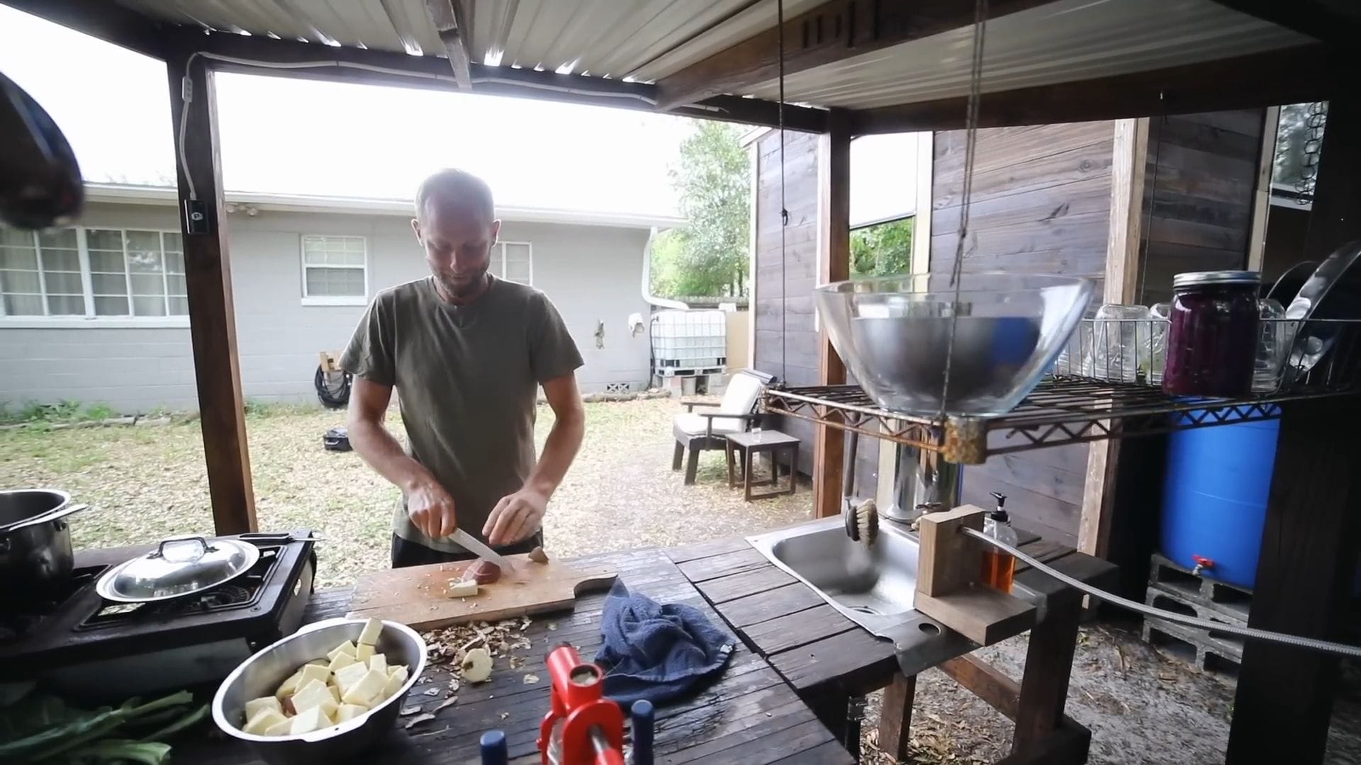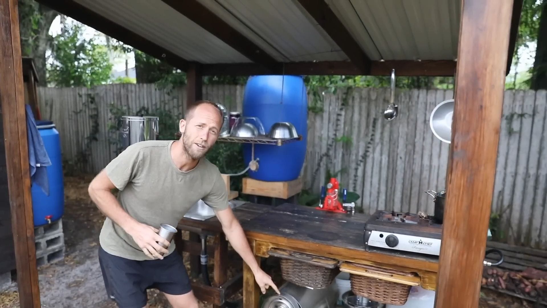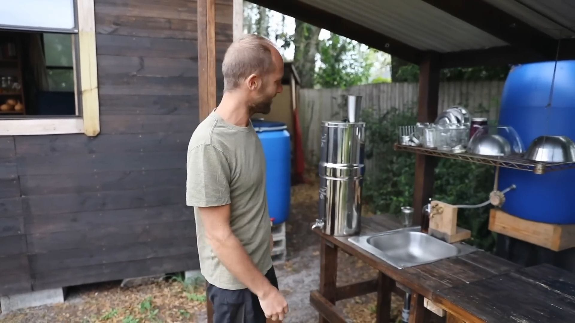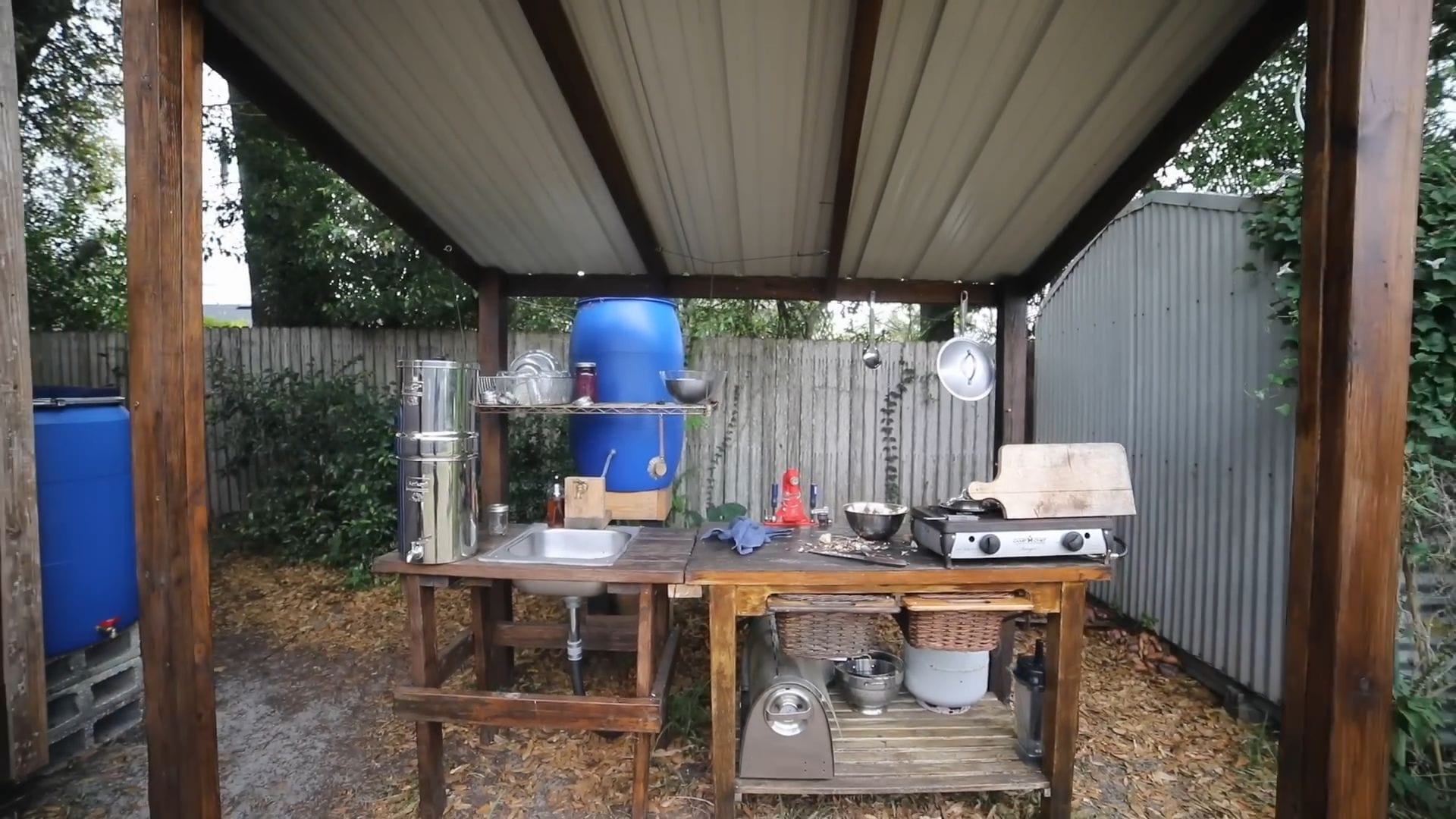 The outdoor kitchen serves as the heart of daily operations, where Rob typically prepares three meals each day using exclusively rainwater.